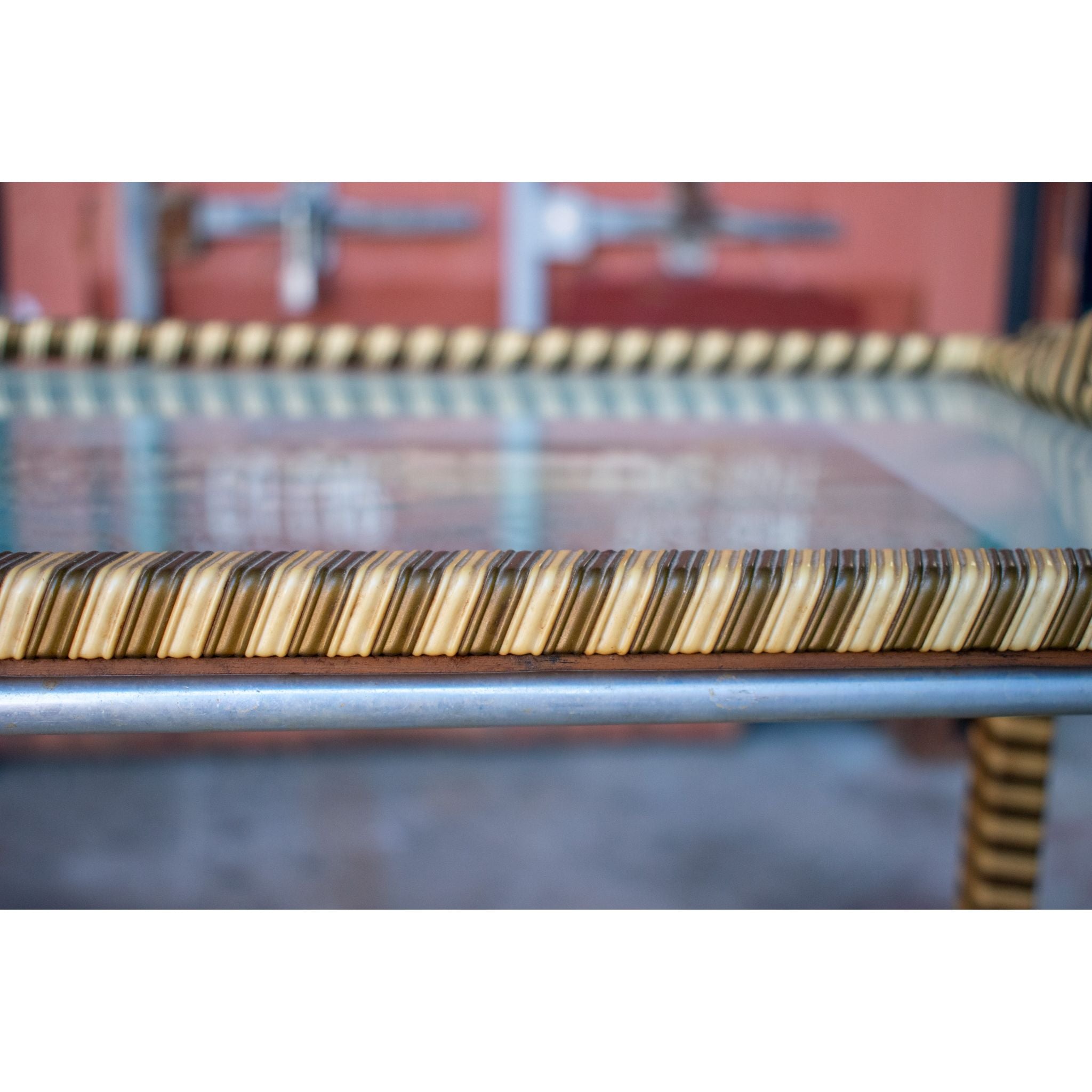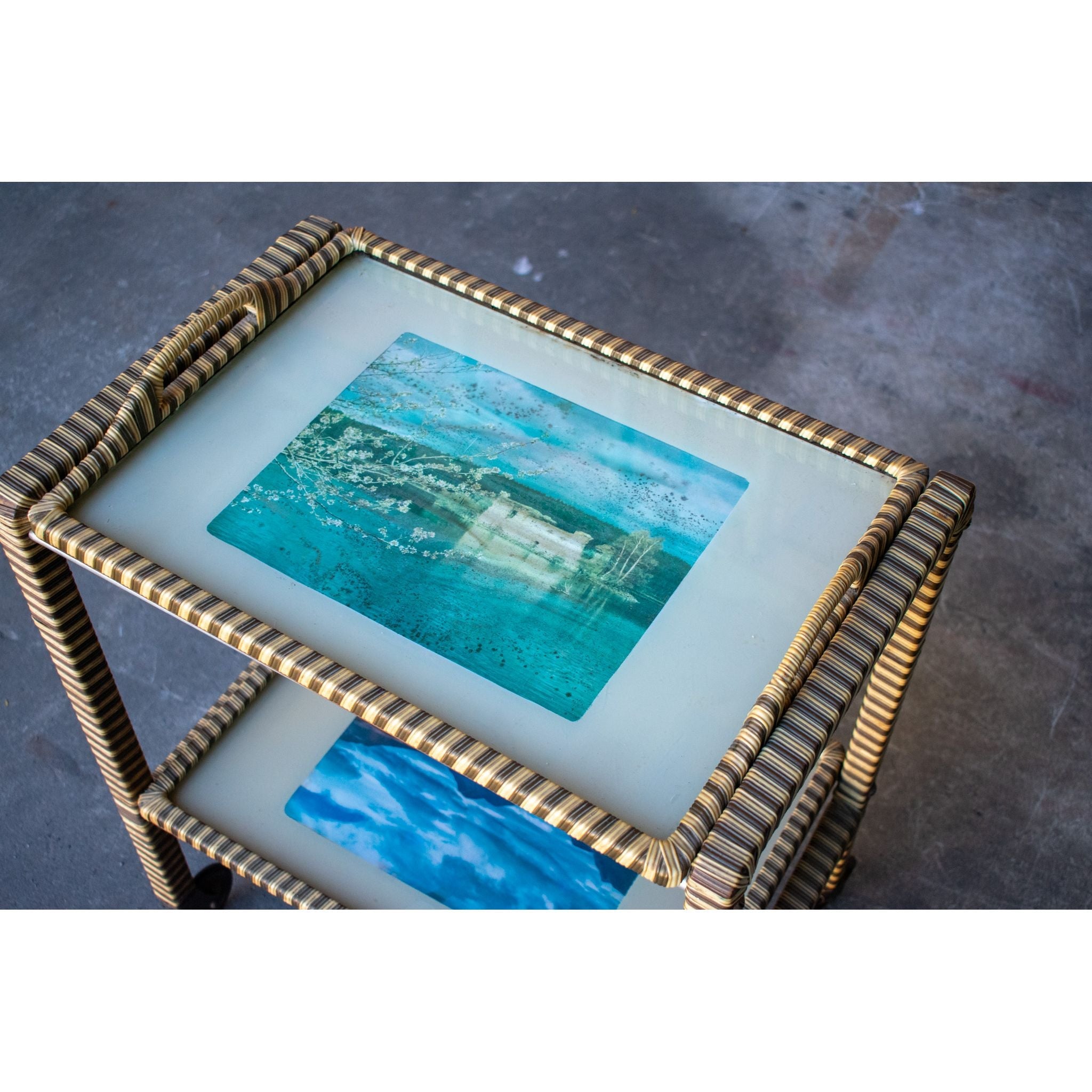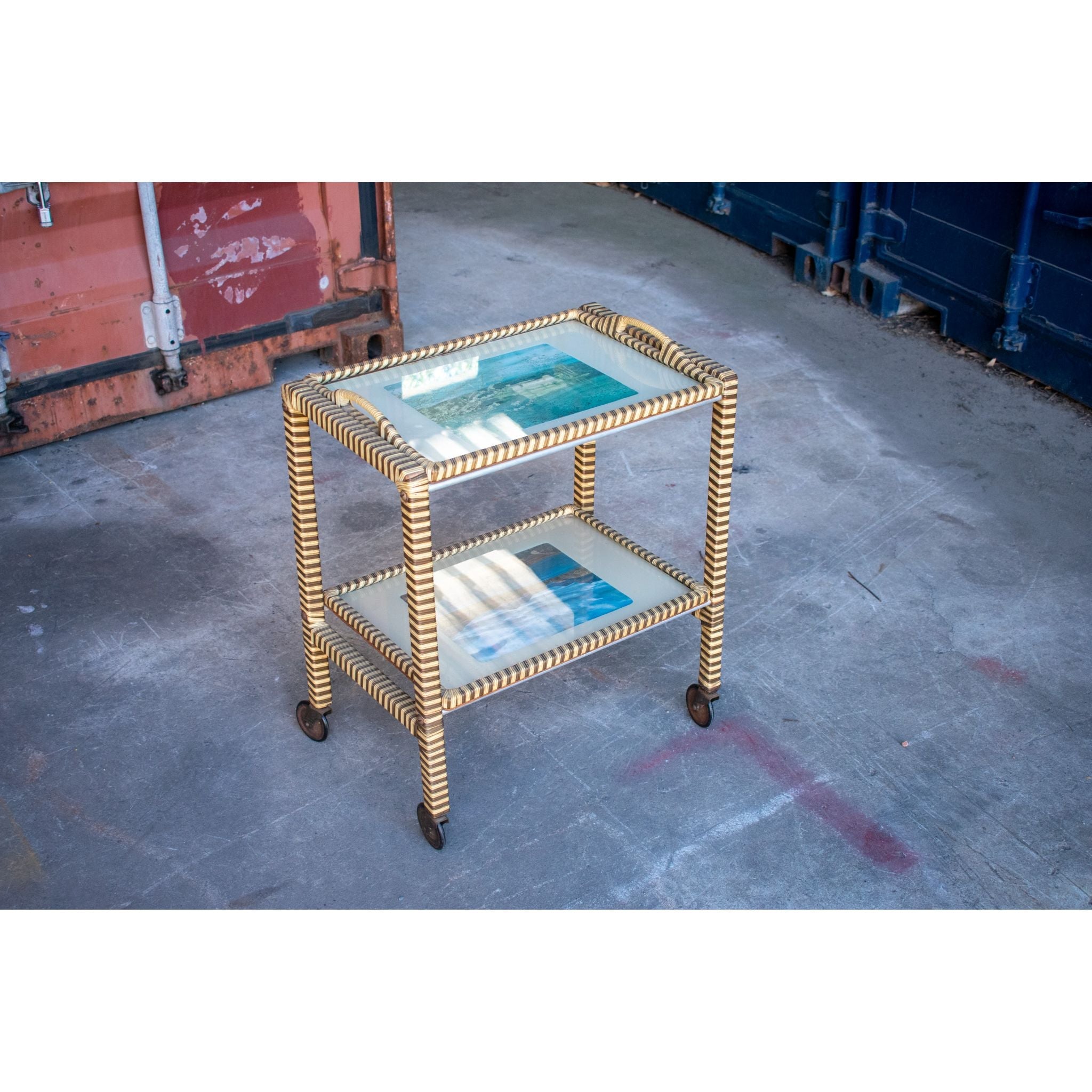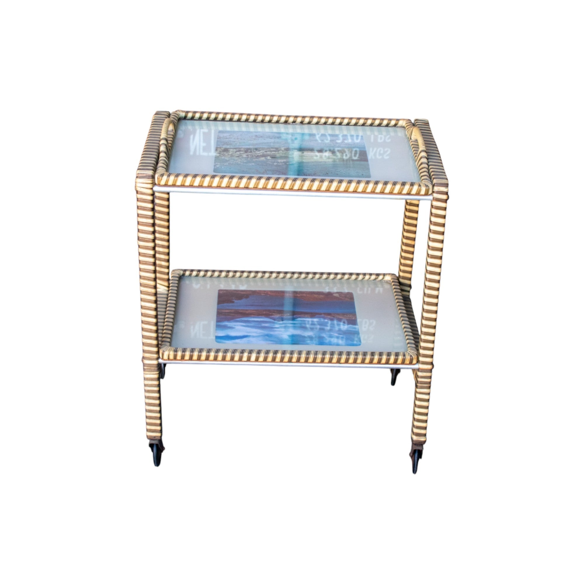 A cheerful mid-century rolling drinks trolley, English-made circa 1970s. The frame combines metal and timber with a playful black-and-gold striped finish. The top tier functions as a removable tray—perfect for serving or styling—and both levels feature glass panels with printed collage inlays.
