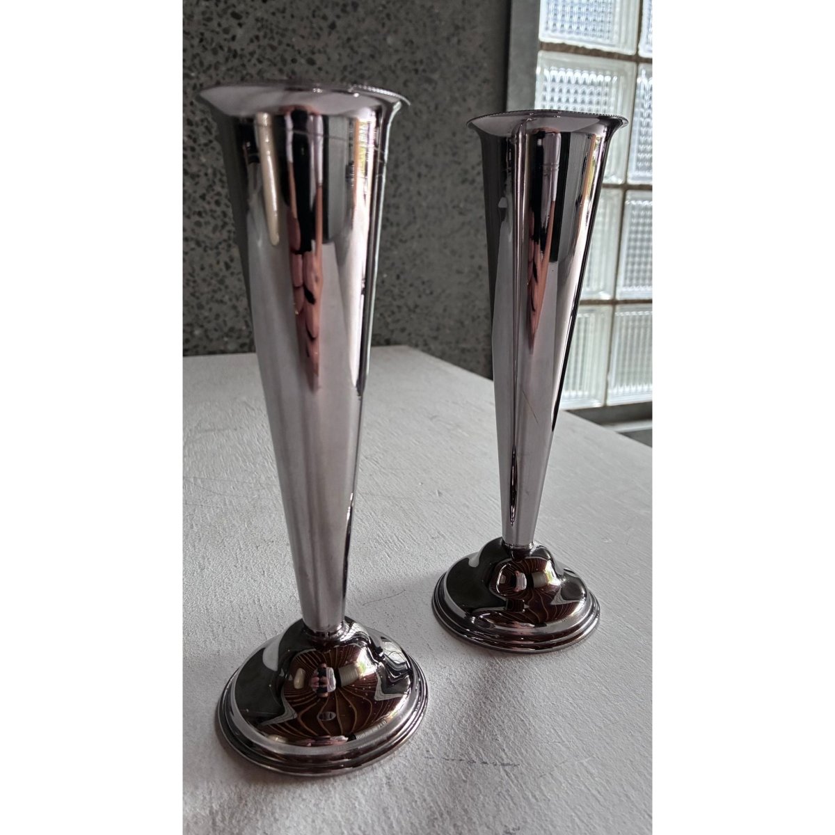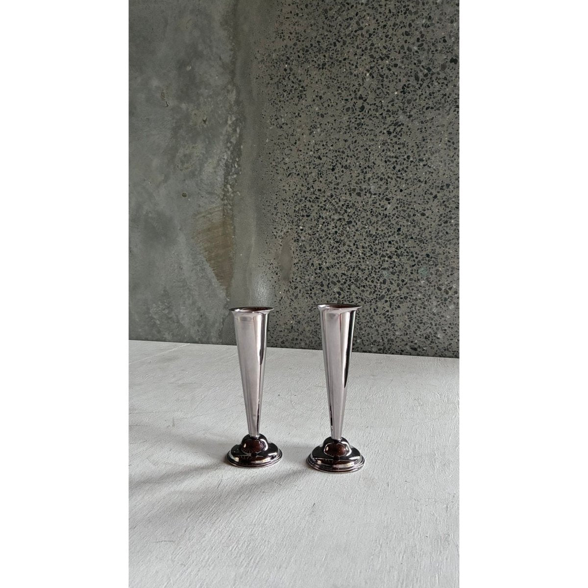 Condition: The silver plate presents with a soft, reflective finish and light-age appropriate patina. One vase shows a minor indent to the body, noticeable only upon close inspection.