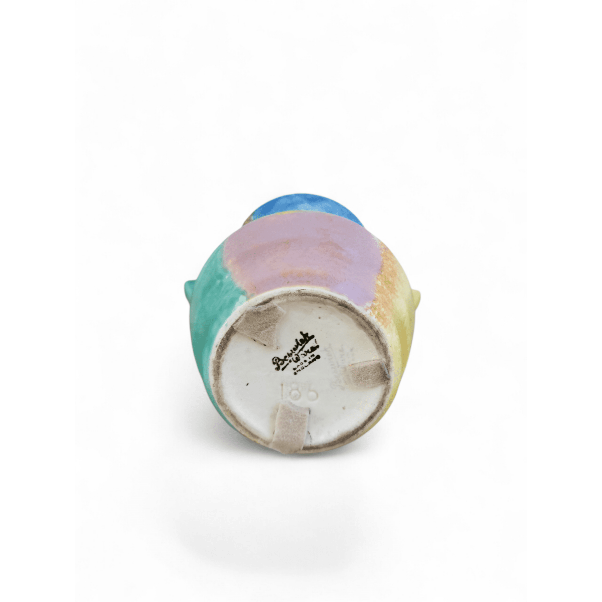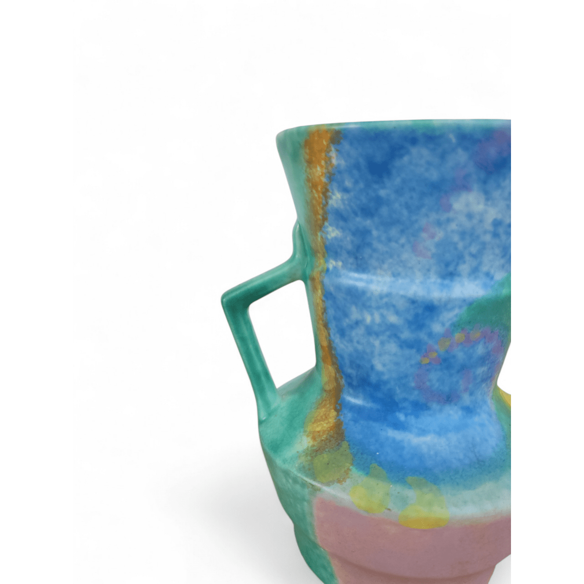 This example features a painterly composition of cobalt and turquoise blues to the front, with contrasting green tones to the reverse, softened by yellow and blush accents around the body and base. The angular twin handles and gently waisted profile are characteristic of Beswick’s mid-century experimentation with form, bridging functional pottery and decorative art.