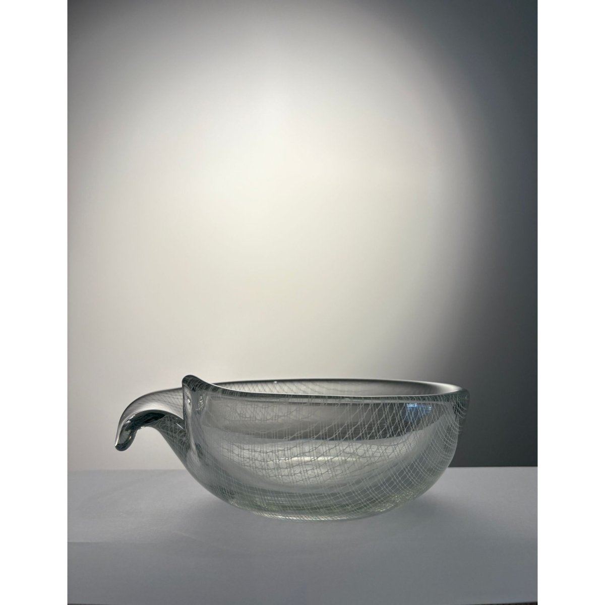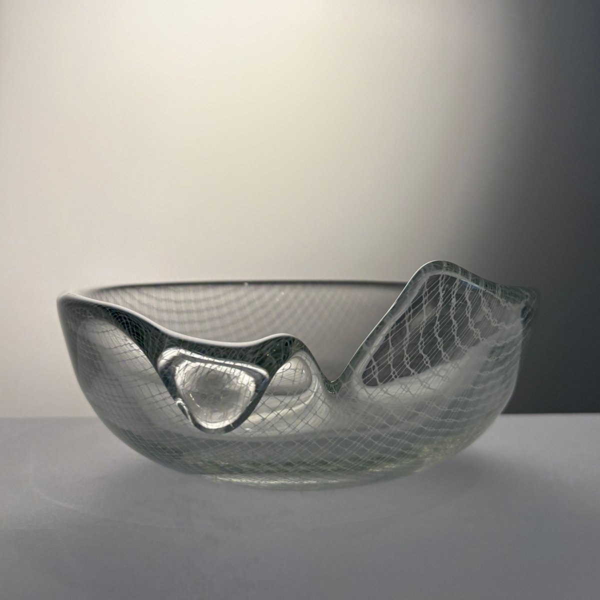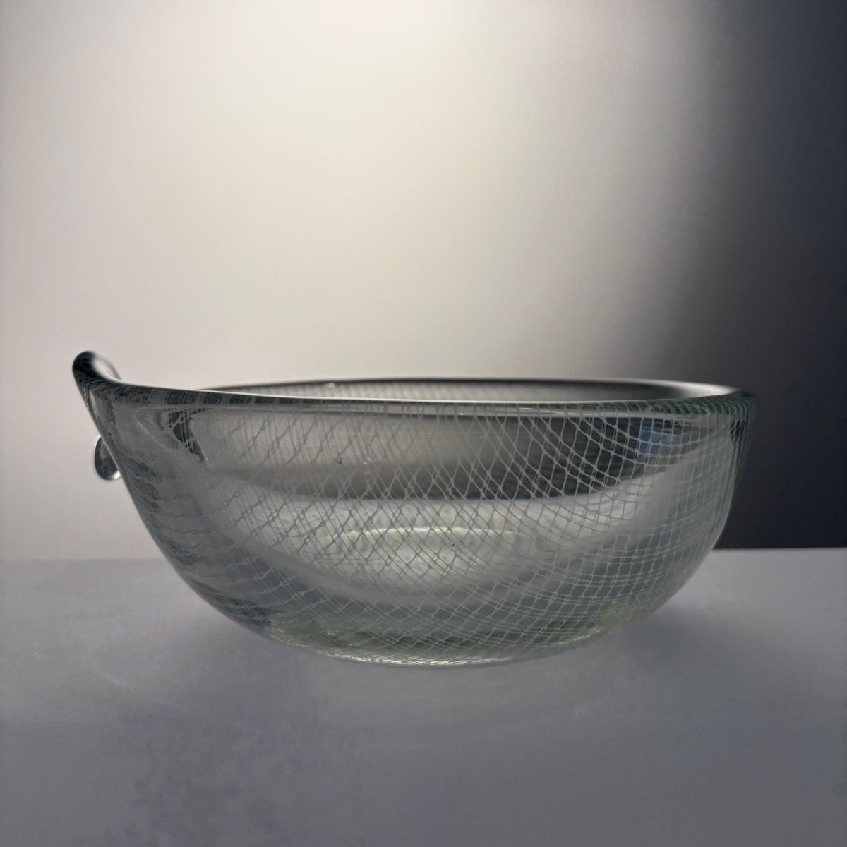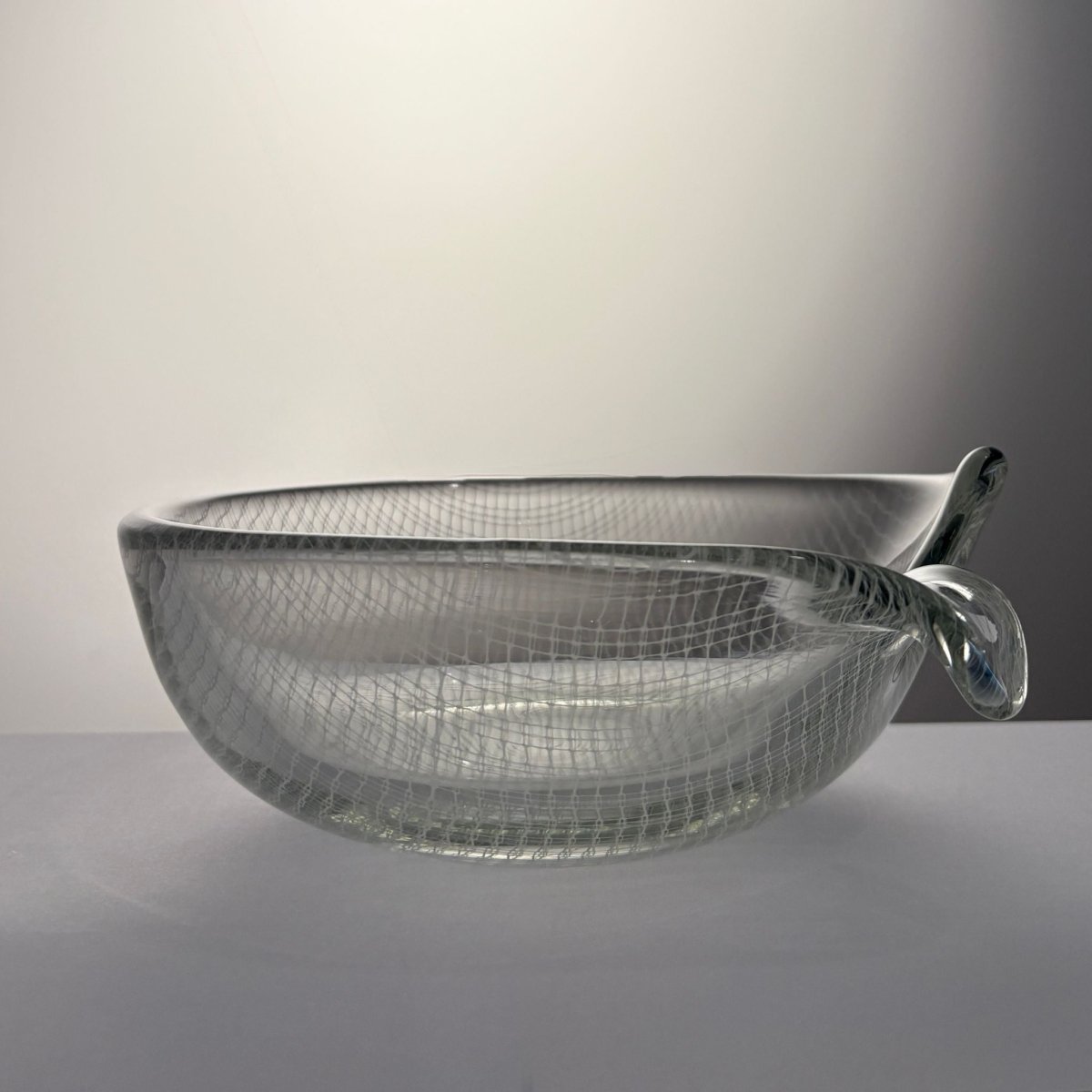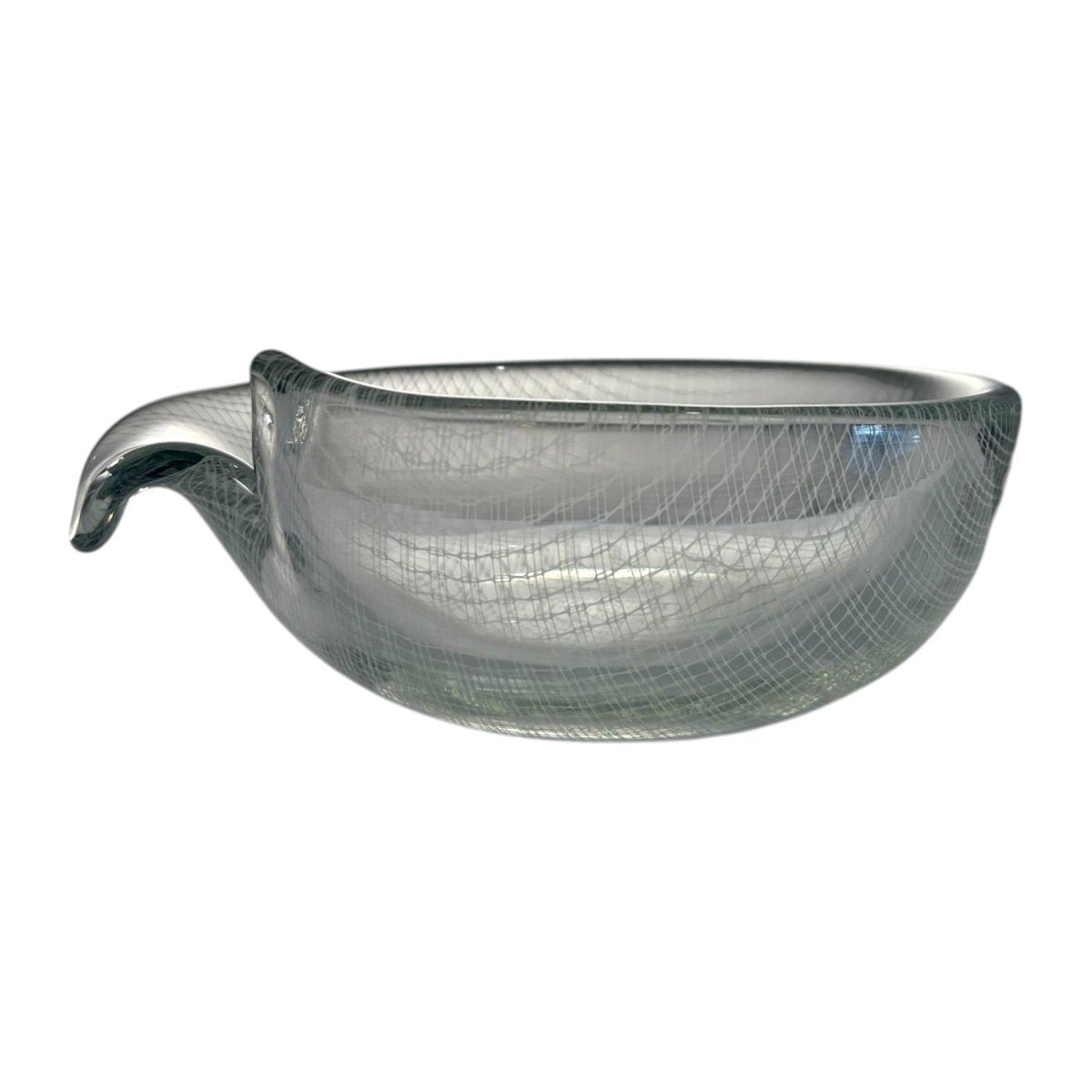 A striking example of post-war Czech art glass from the renowned Harrachov glassworks, this “Harrtil” lattice bowl features a finely structured internal net pattern fully encased within thick, crystal-clear glass. The low, rounded form with applied handle balances sculptural presence with functional elegance, while the suspended geometric grid creates depth and subtle optical movement as light passes through the bowl.