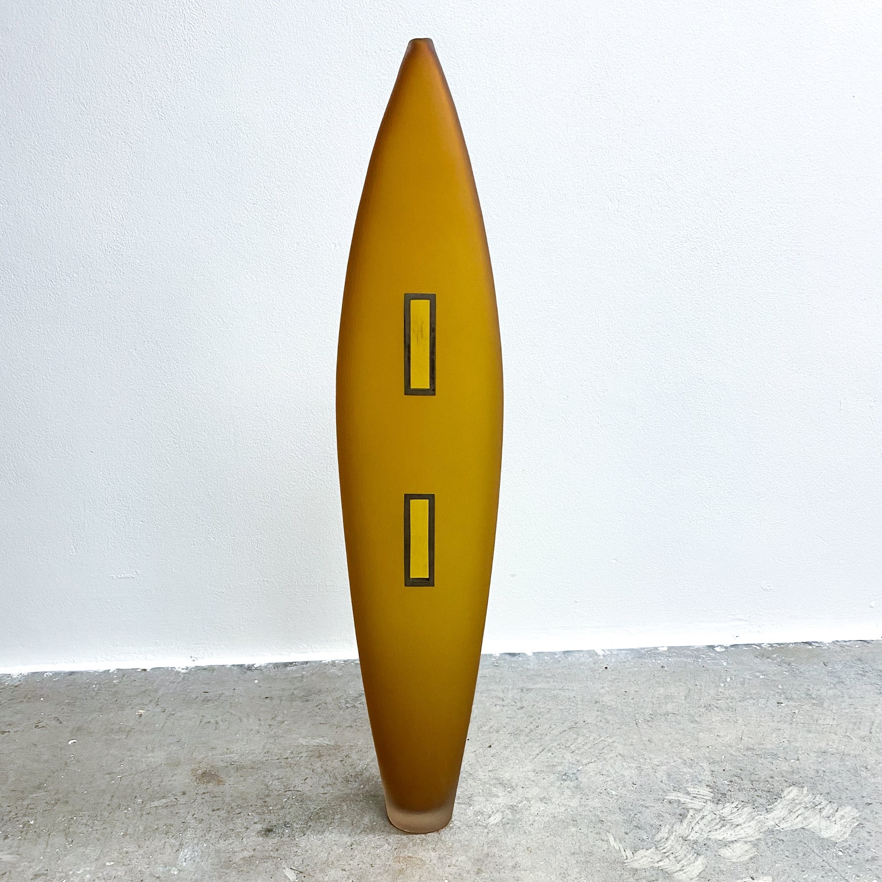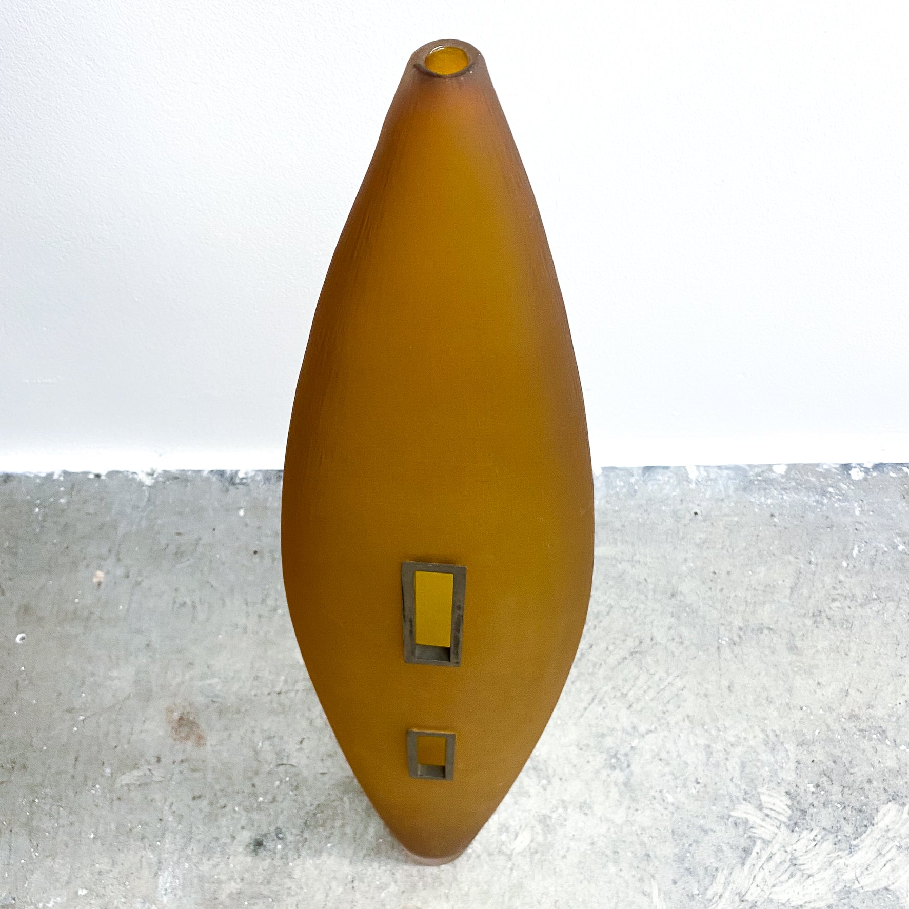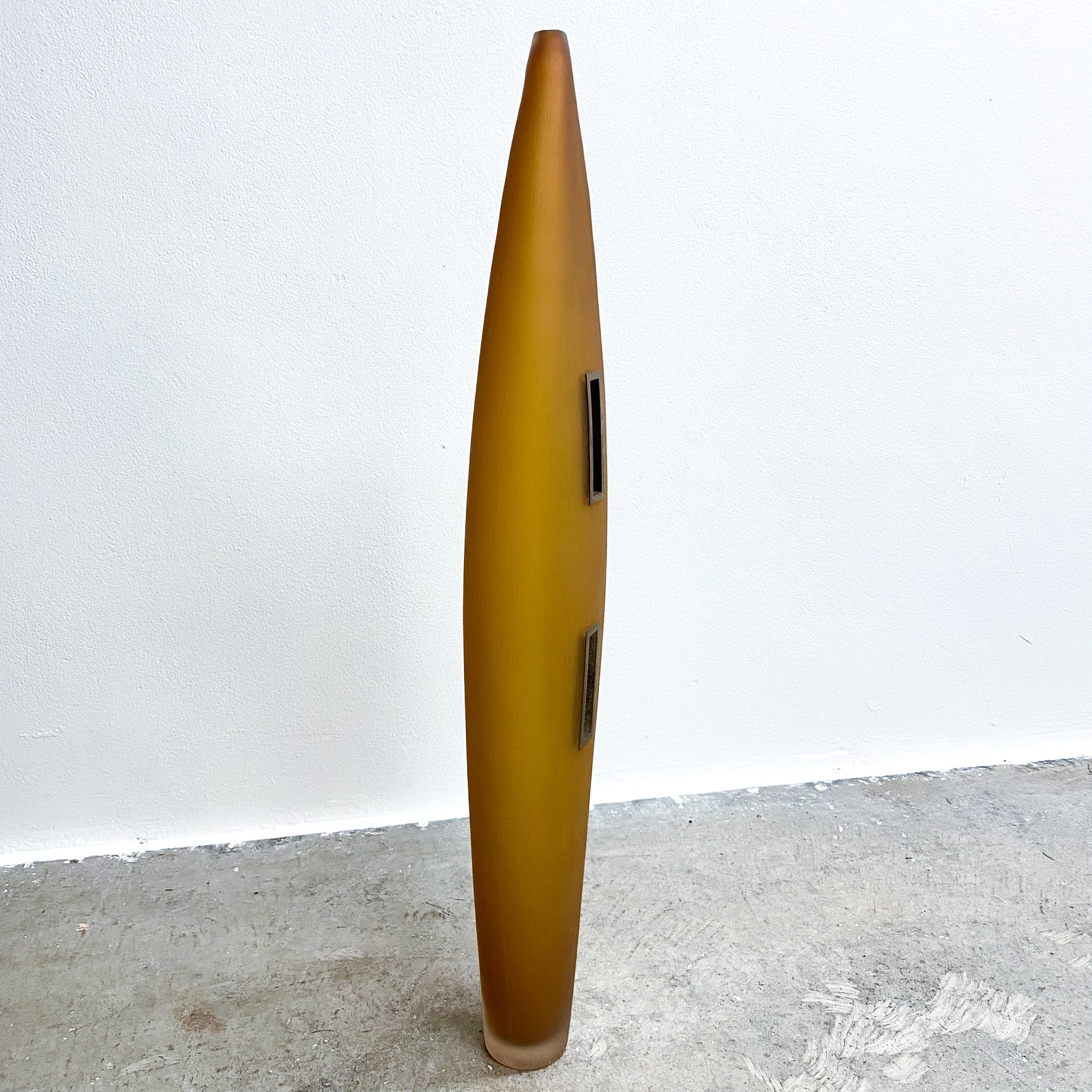 Amazing sculptural post modern amber art glass floor vase with metal framed cut outs.