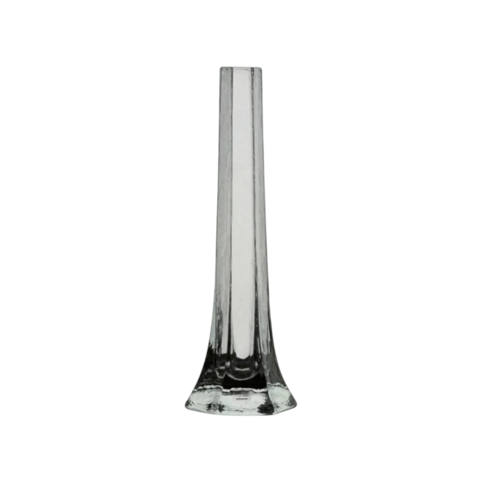 Tall clear glass bud vase of elongated cylindrical form with subtly tapering neck and thickened, gently flared base. Retains the original SEA Sweden label. The vertical emphasis, clarity of glass and restrained geometry are characteristic of Swedish modernist production by SEA during the mid- to late-20th century.