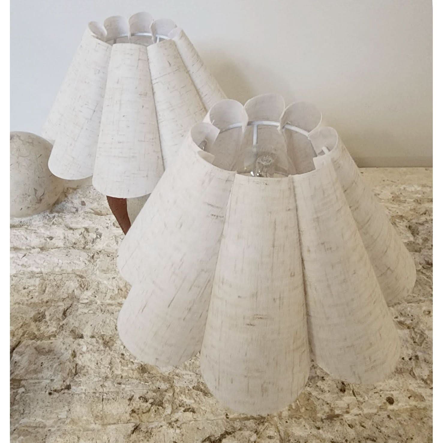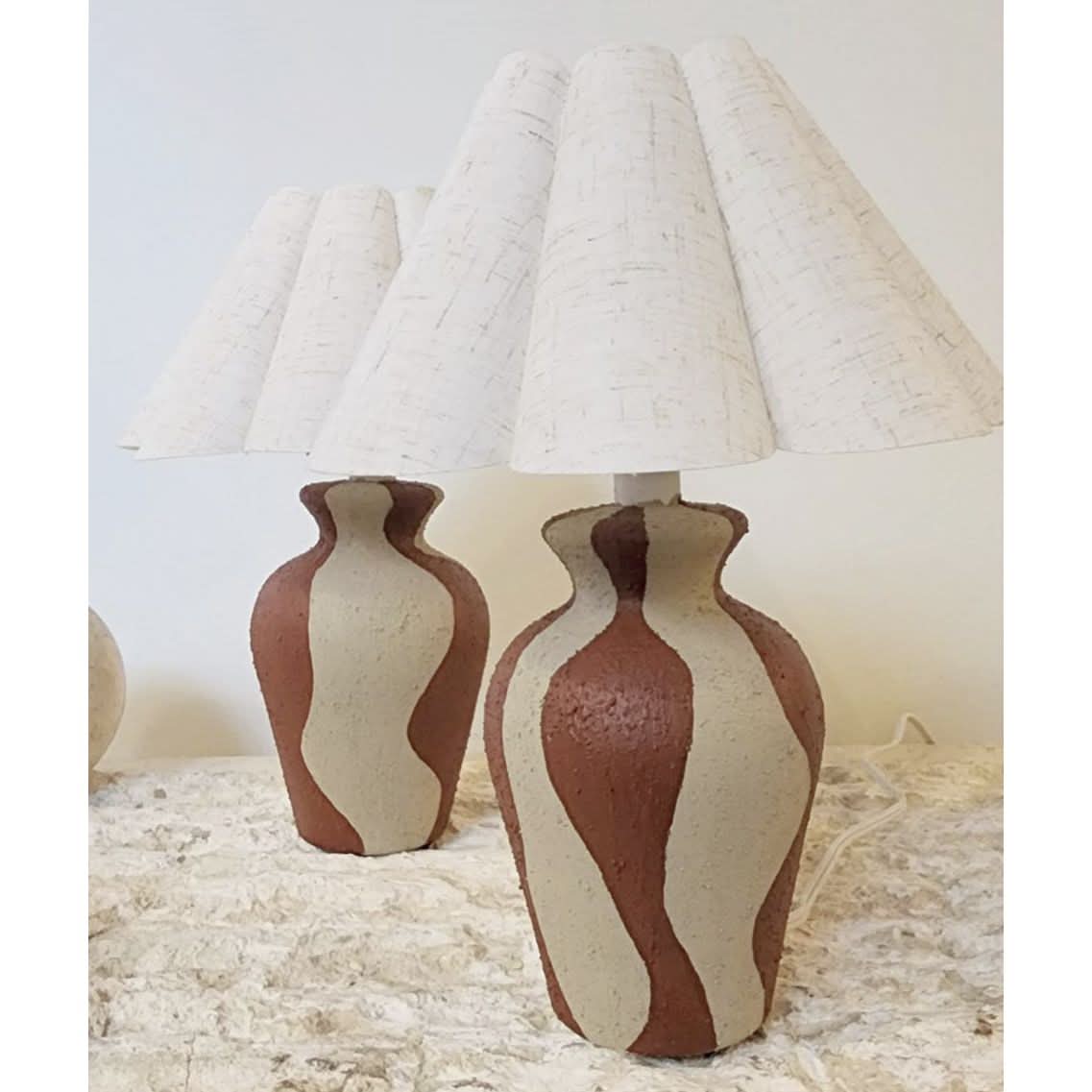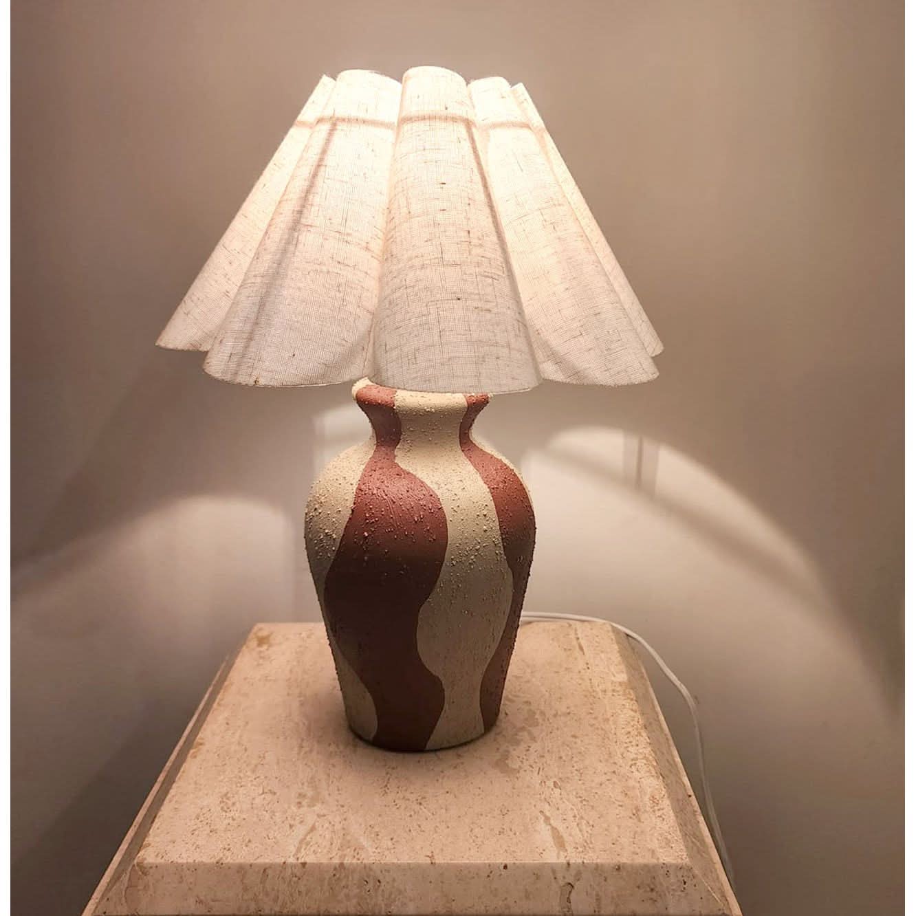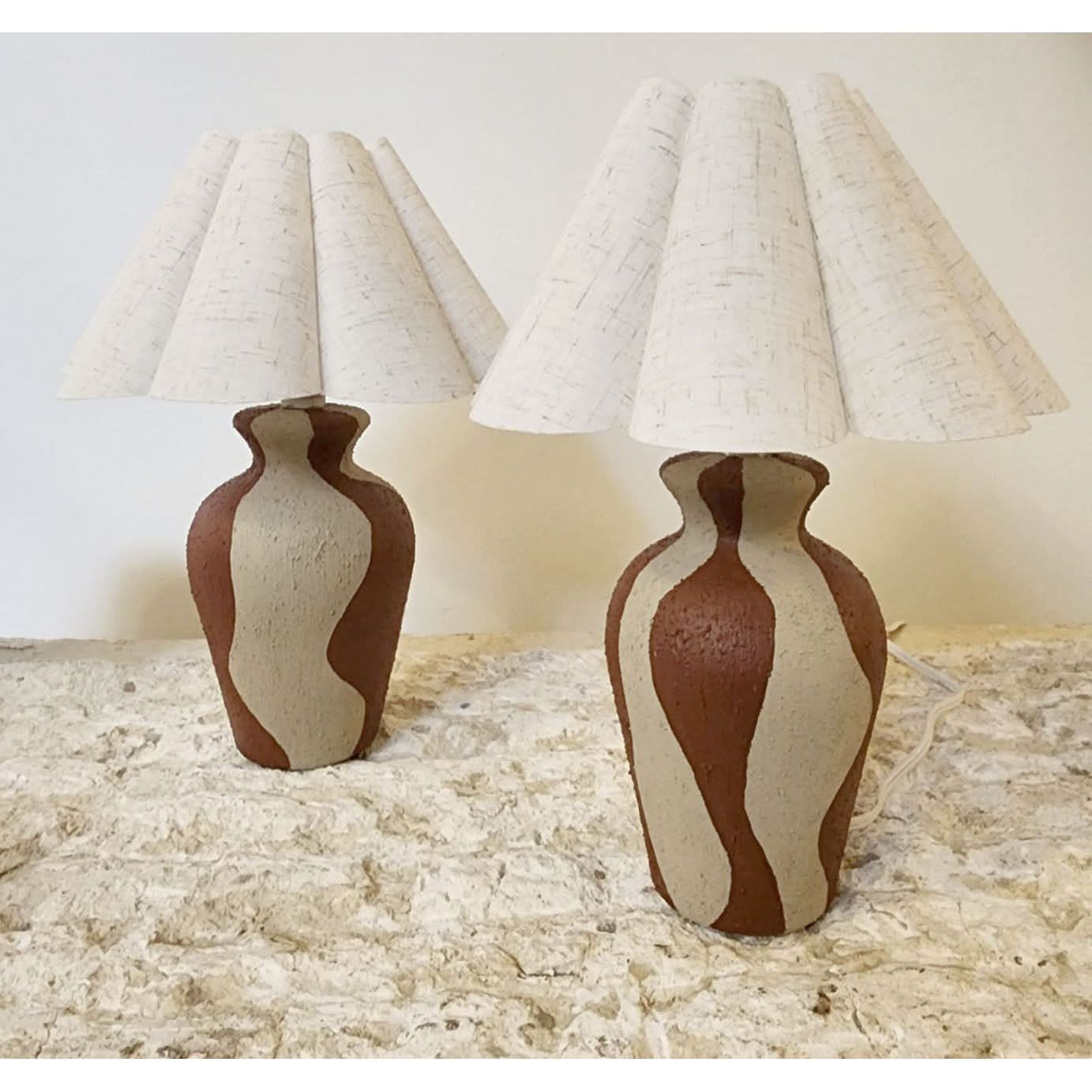 Pair of small upcycled ceramic bases, hand-painted with a wavy pattern, rock texture finish, paired with brand-new tulip pleated linen lampshades.