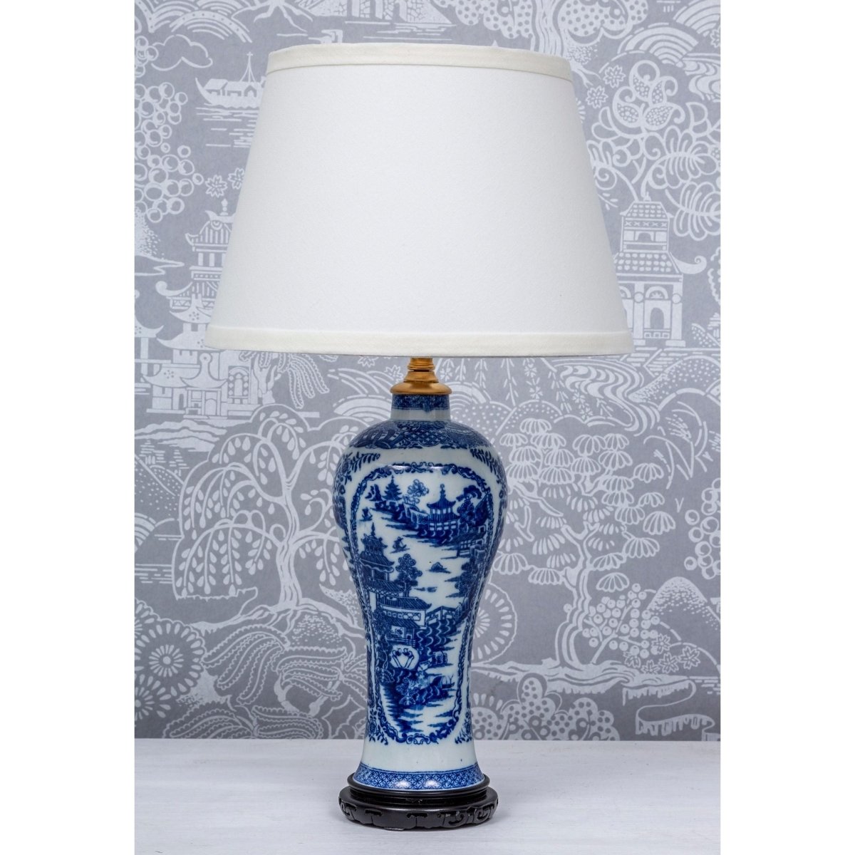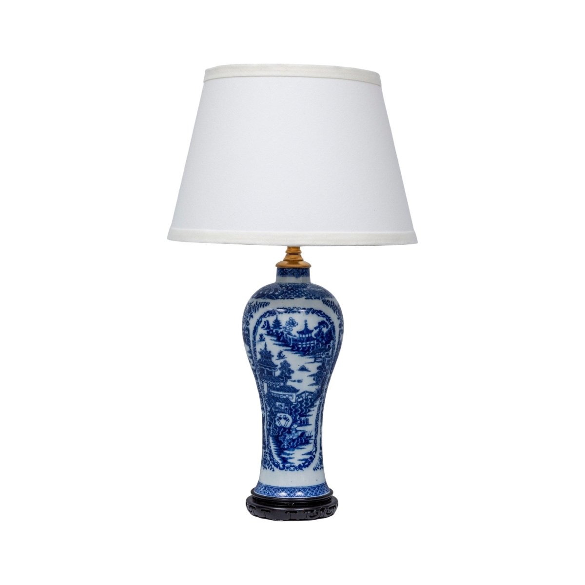 A charming miniature blue and white Chinese porcelain table lamp, with ivory silk shade with carved timber black painted base