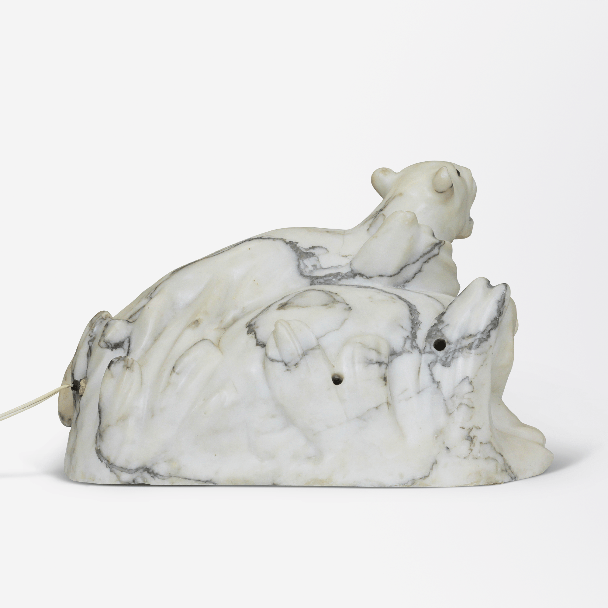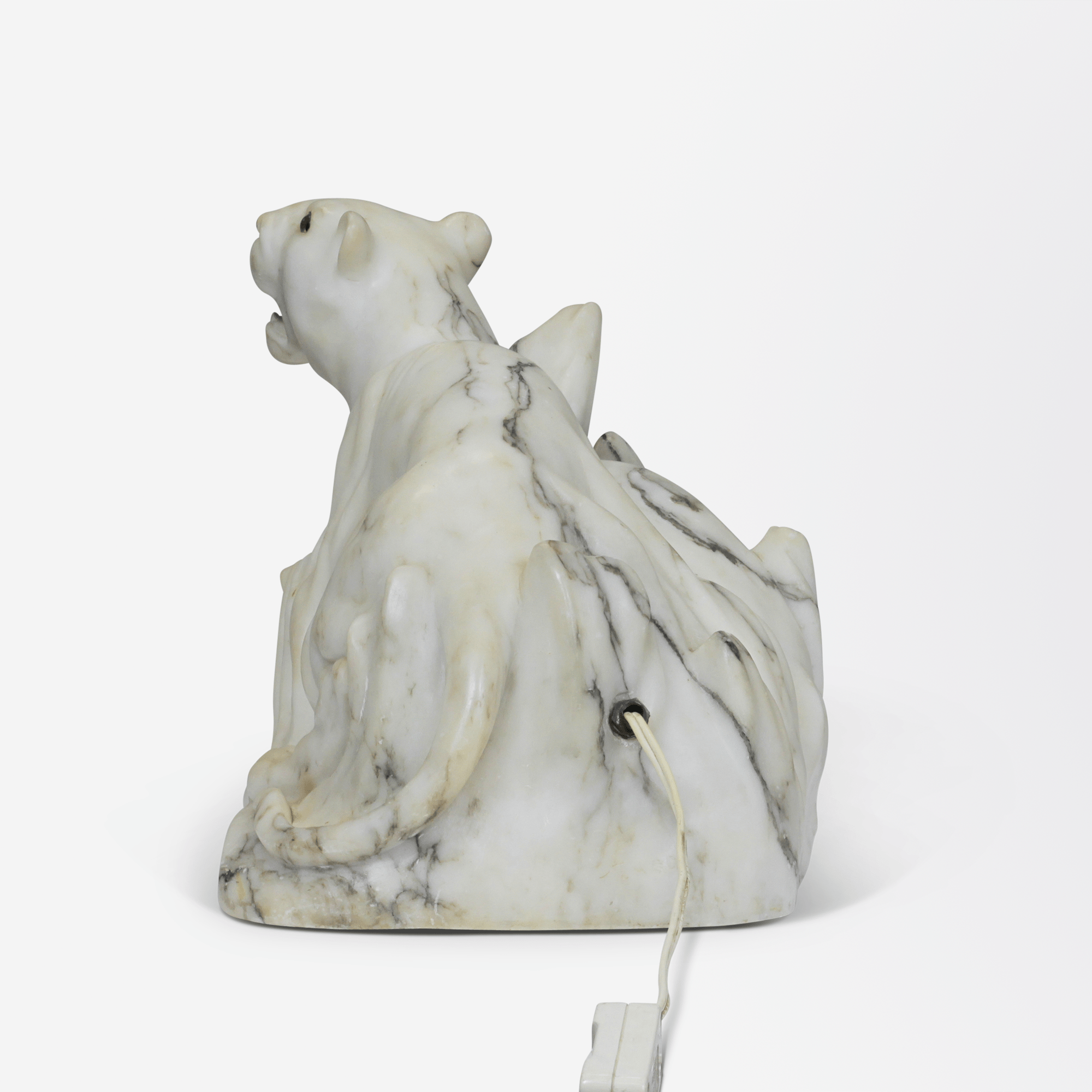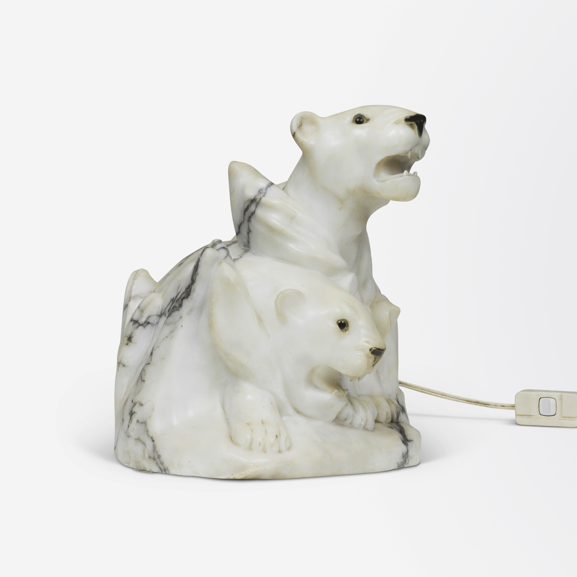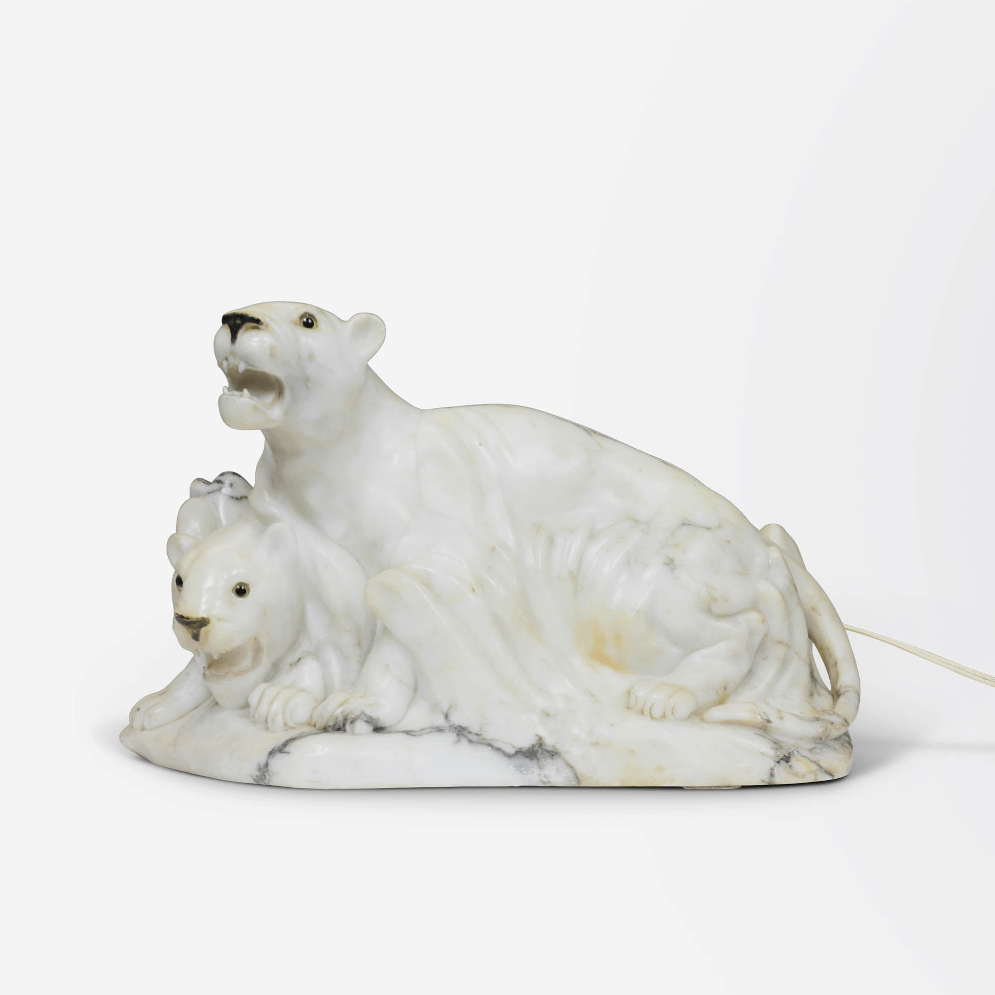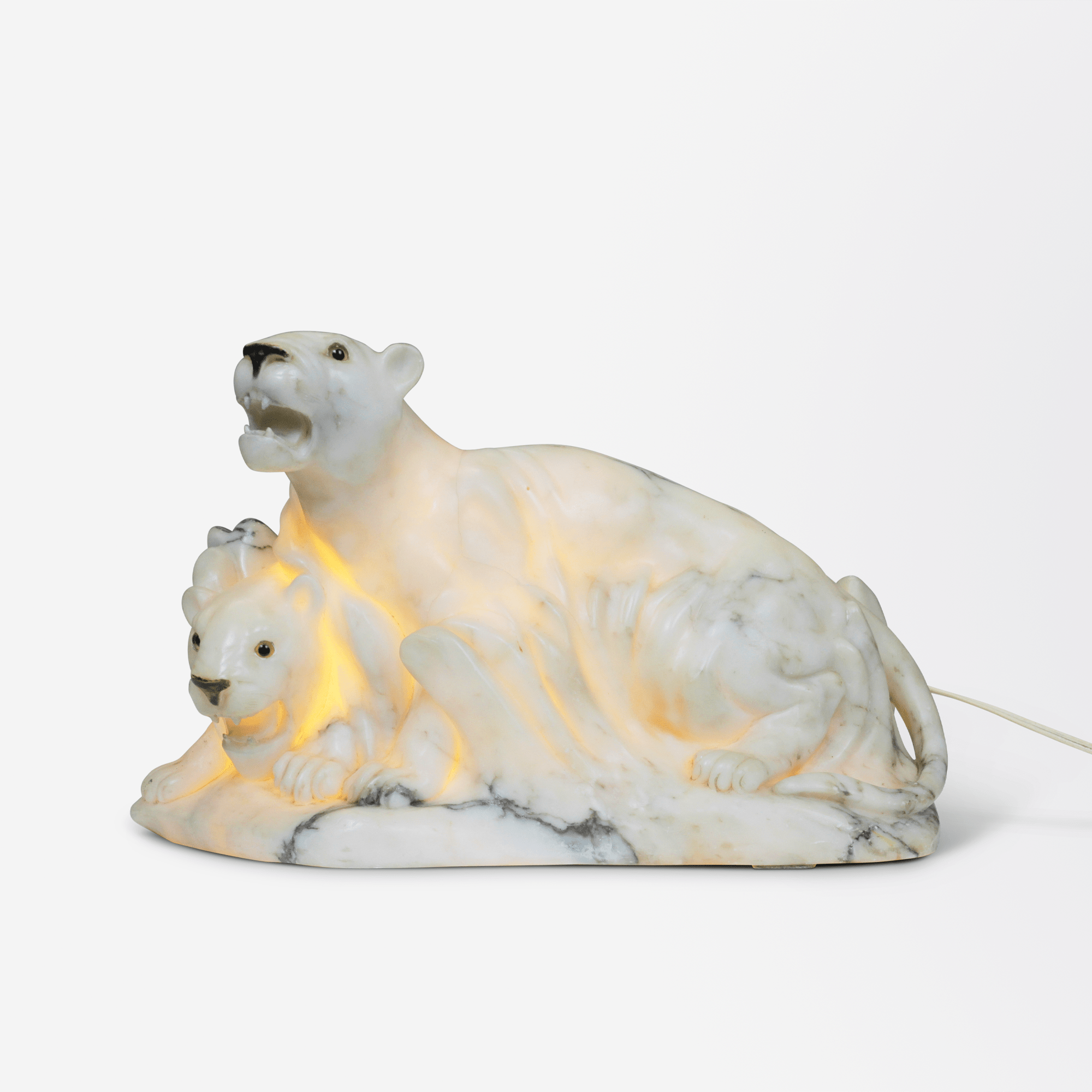 A large, early 20th-century marble table lamp in the form of two lionesses with glass eyes, and grey to black veins through white marble. Rewired for Australian standards.