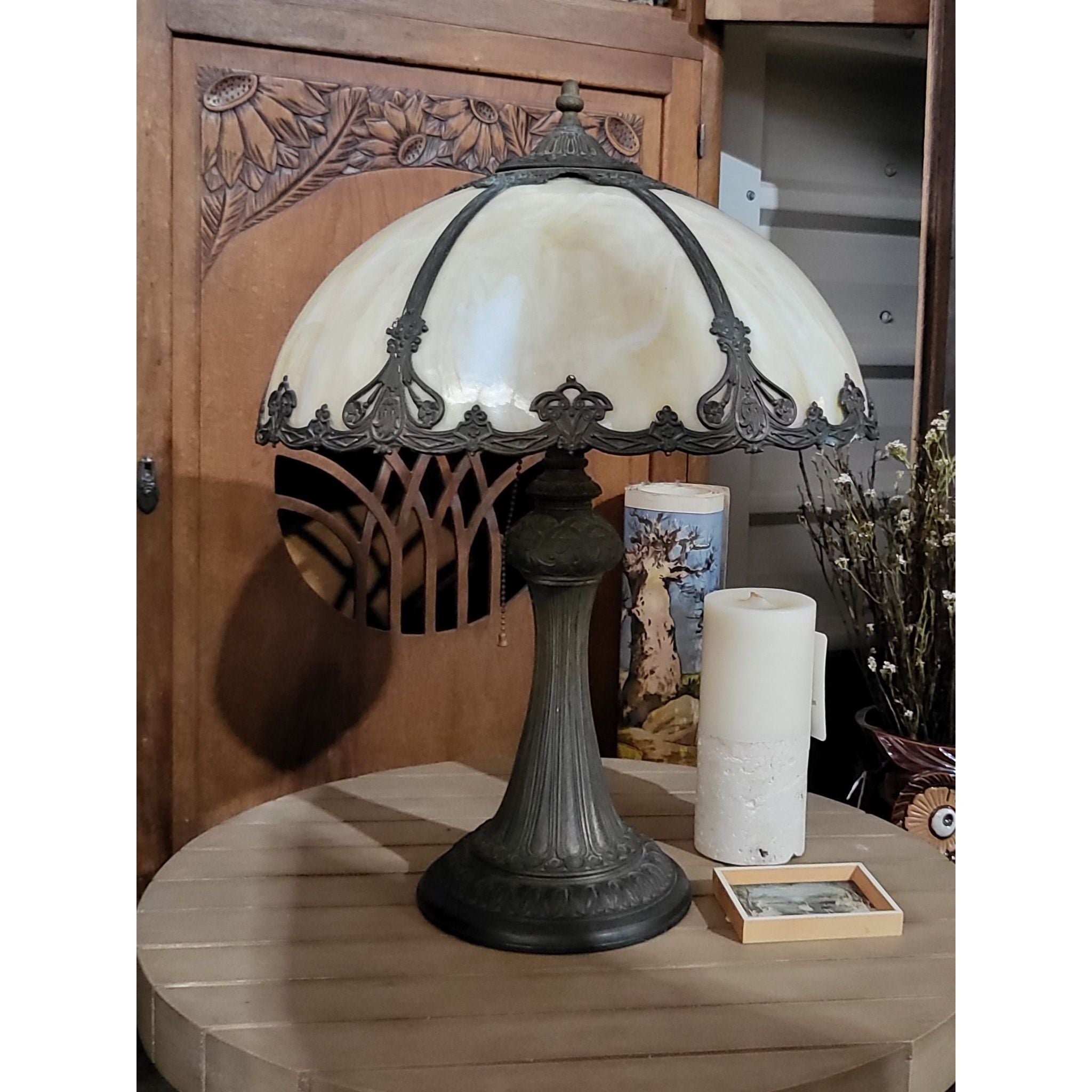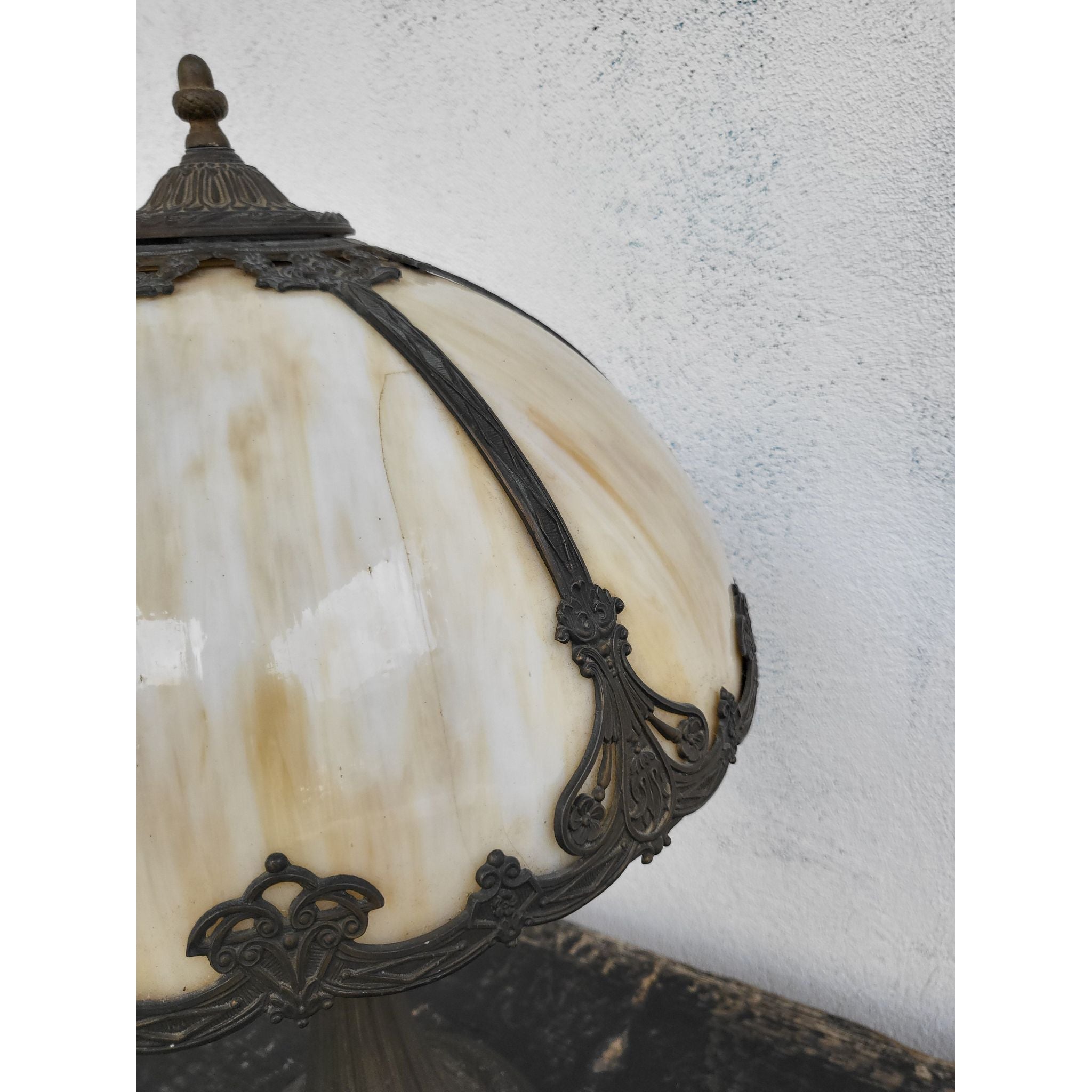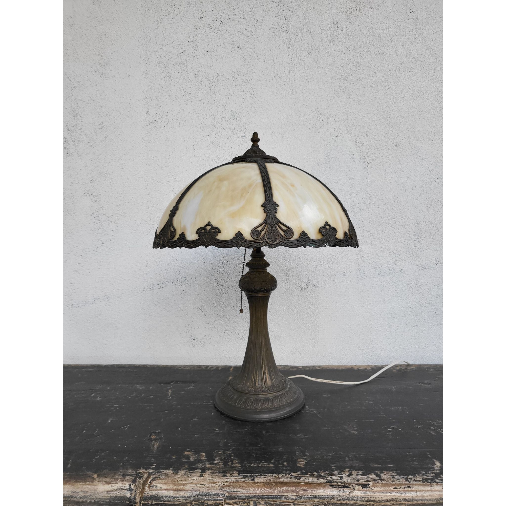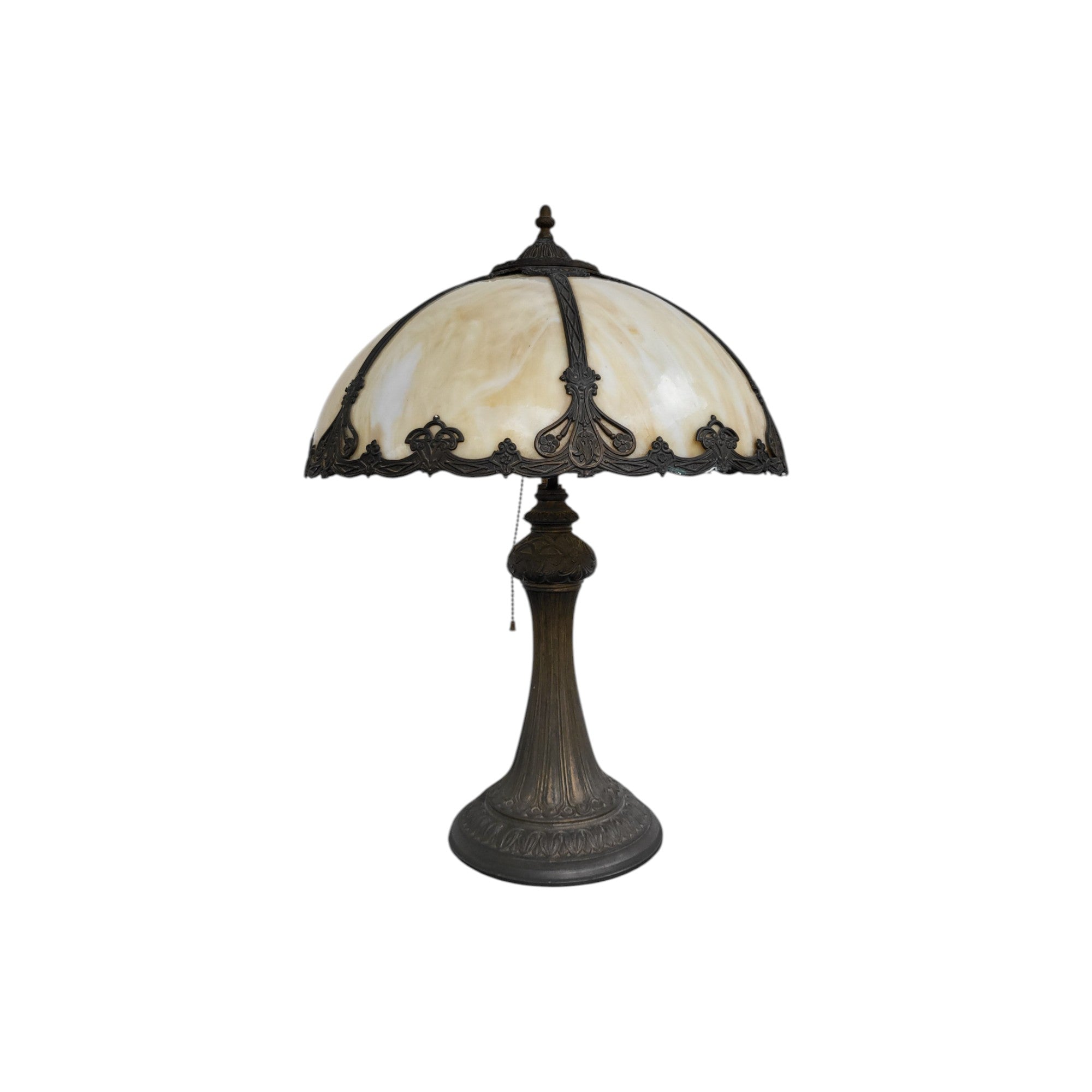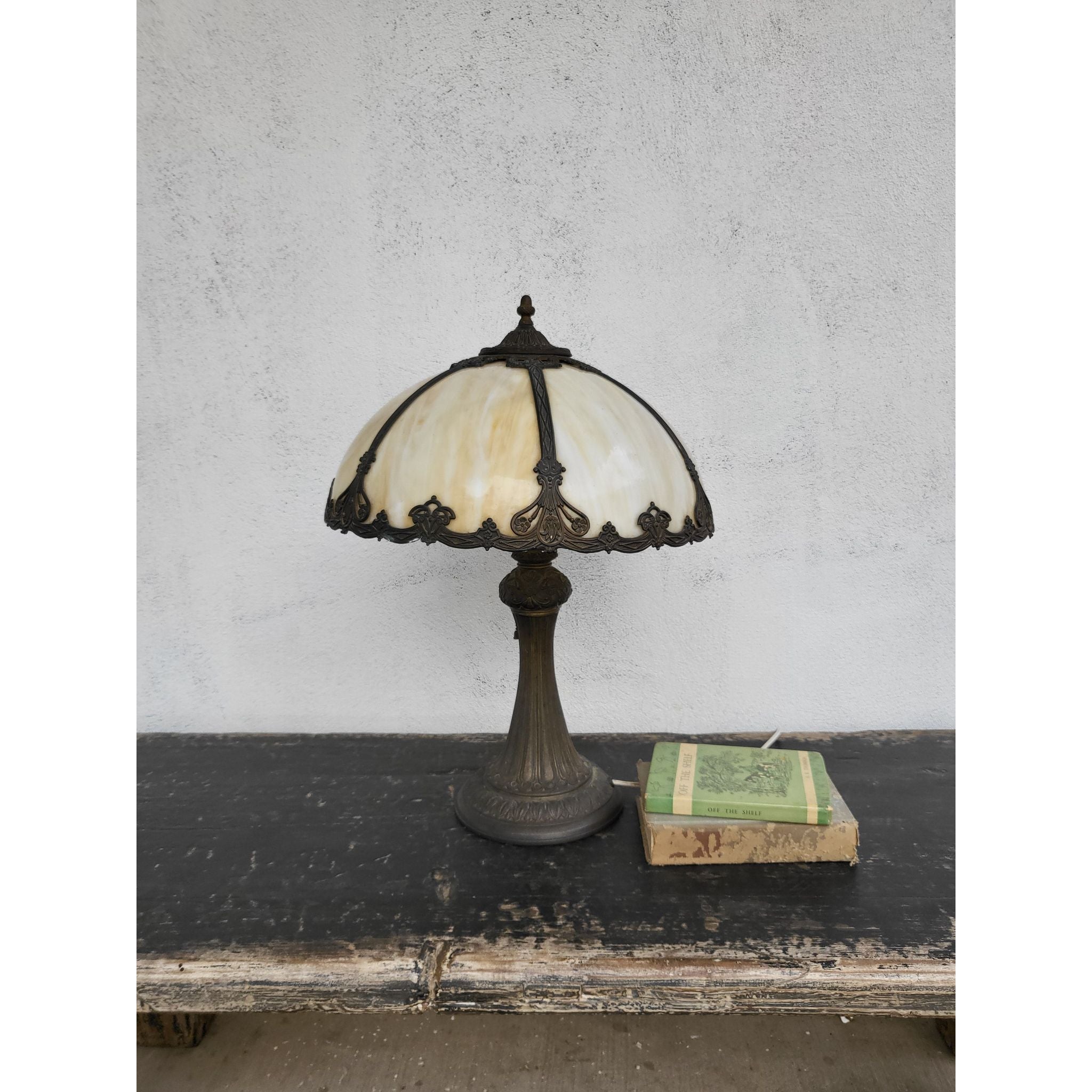 This antique slag glass lamp captures the romance of the early 20th century, with its softly glowing marbled shade and intricate Art Nouveau metalwork.