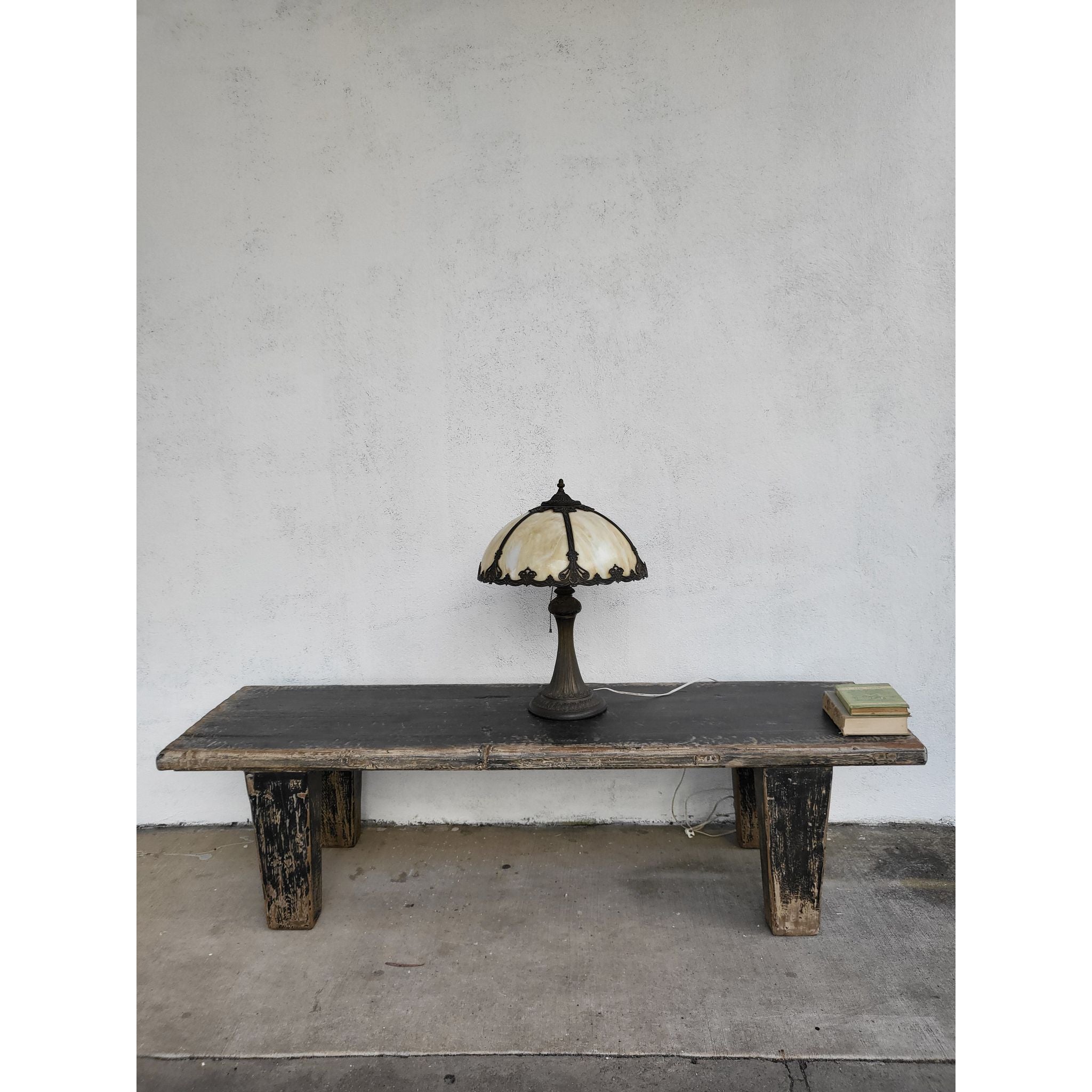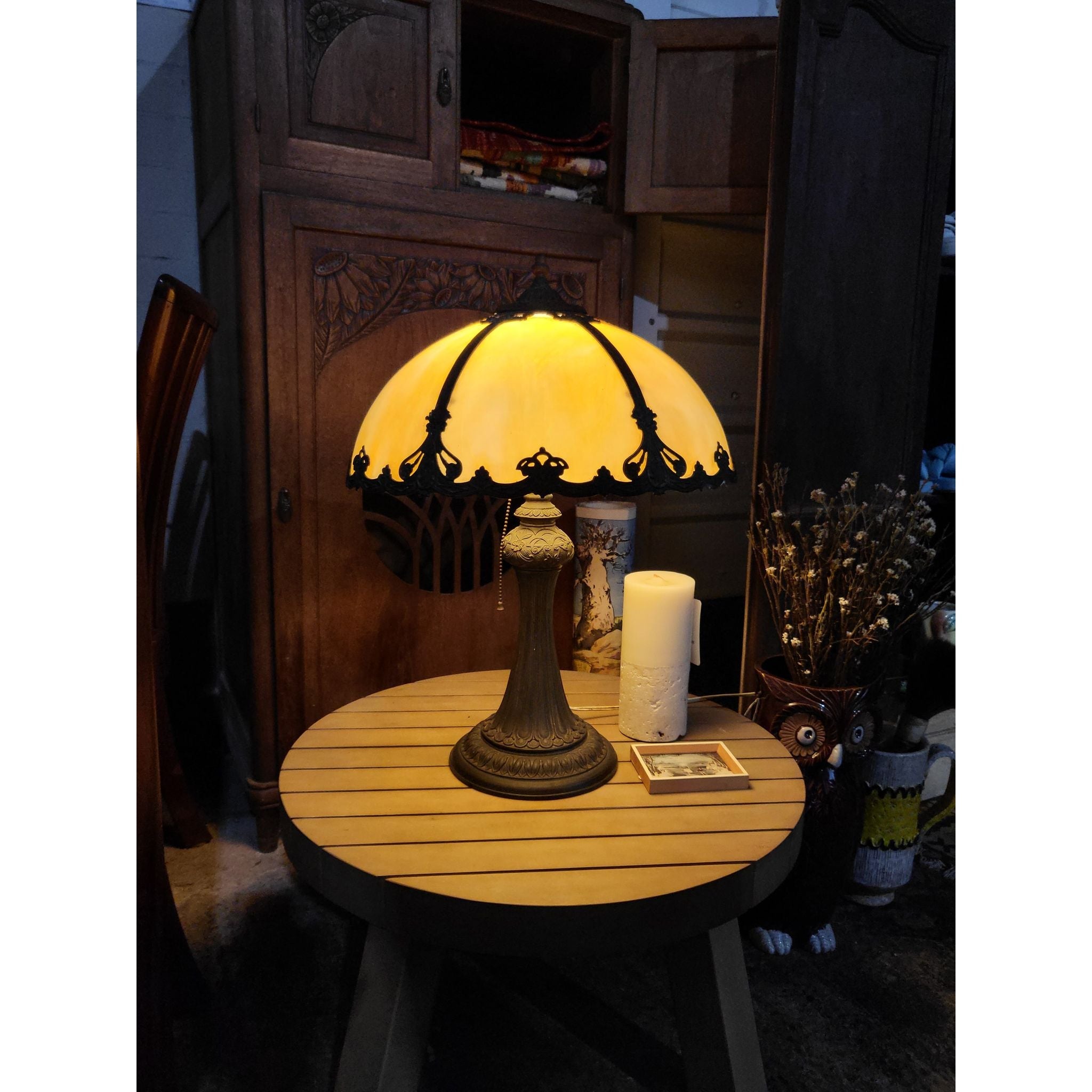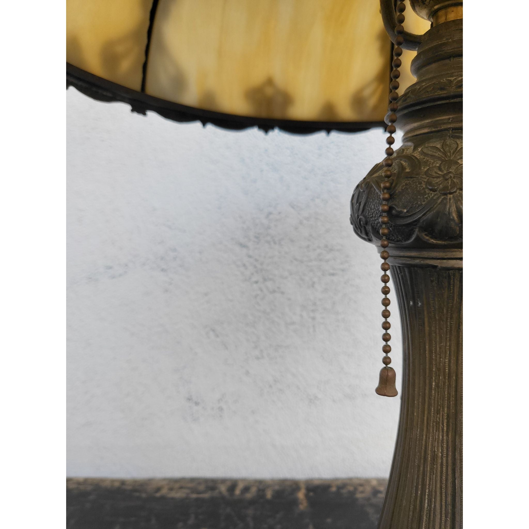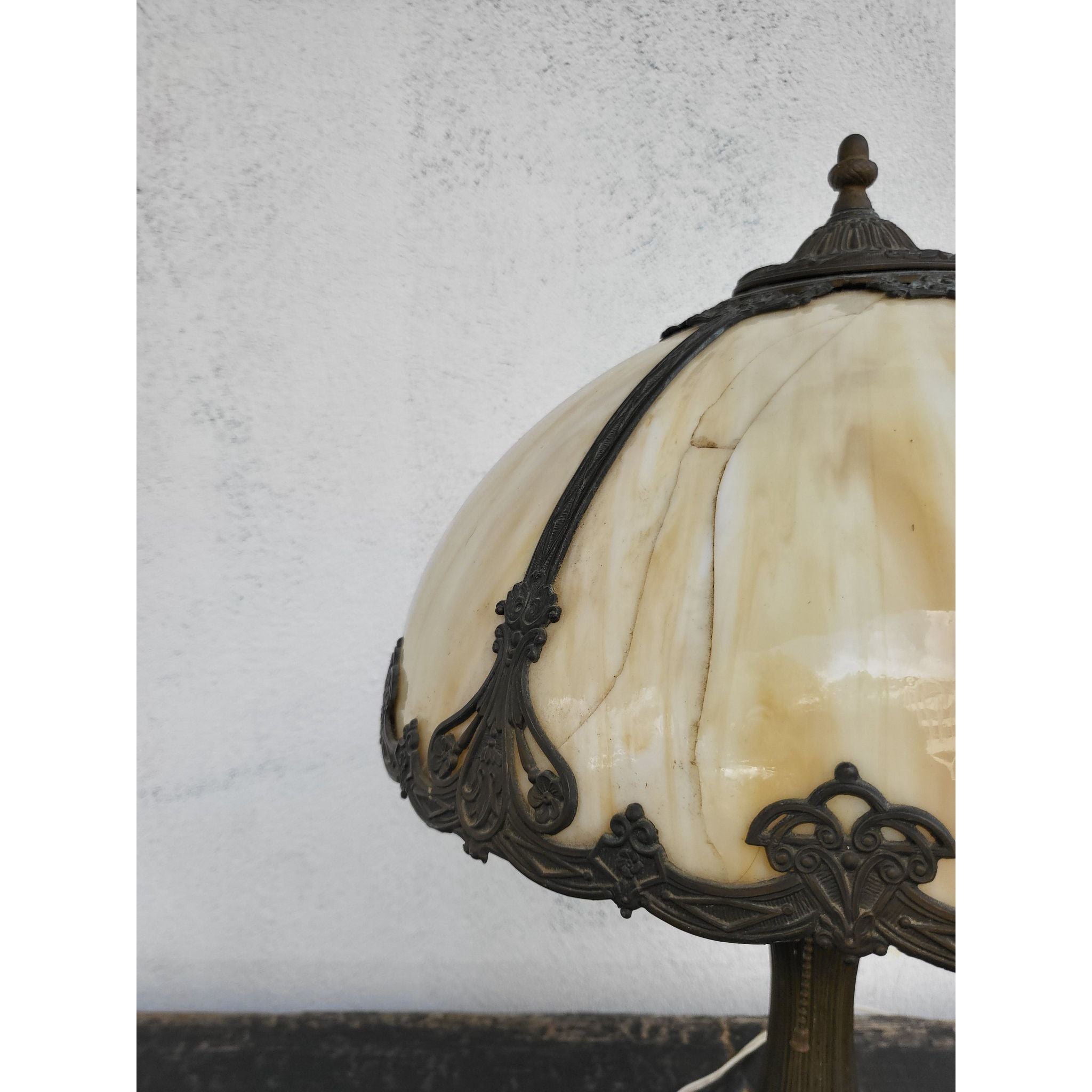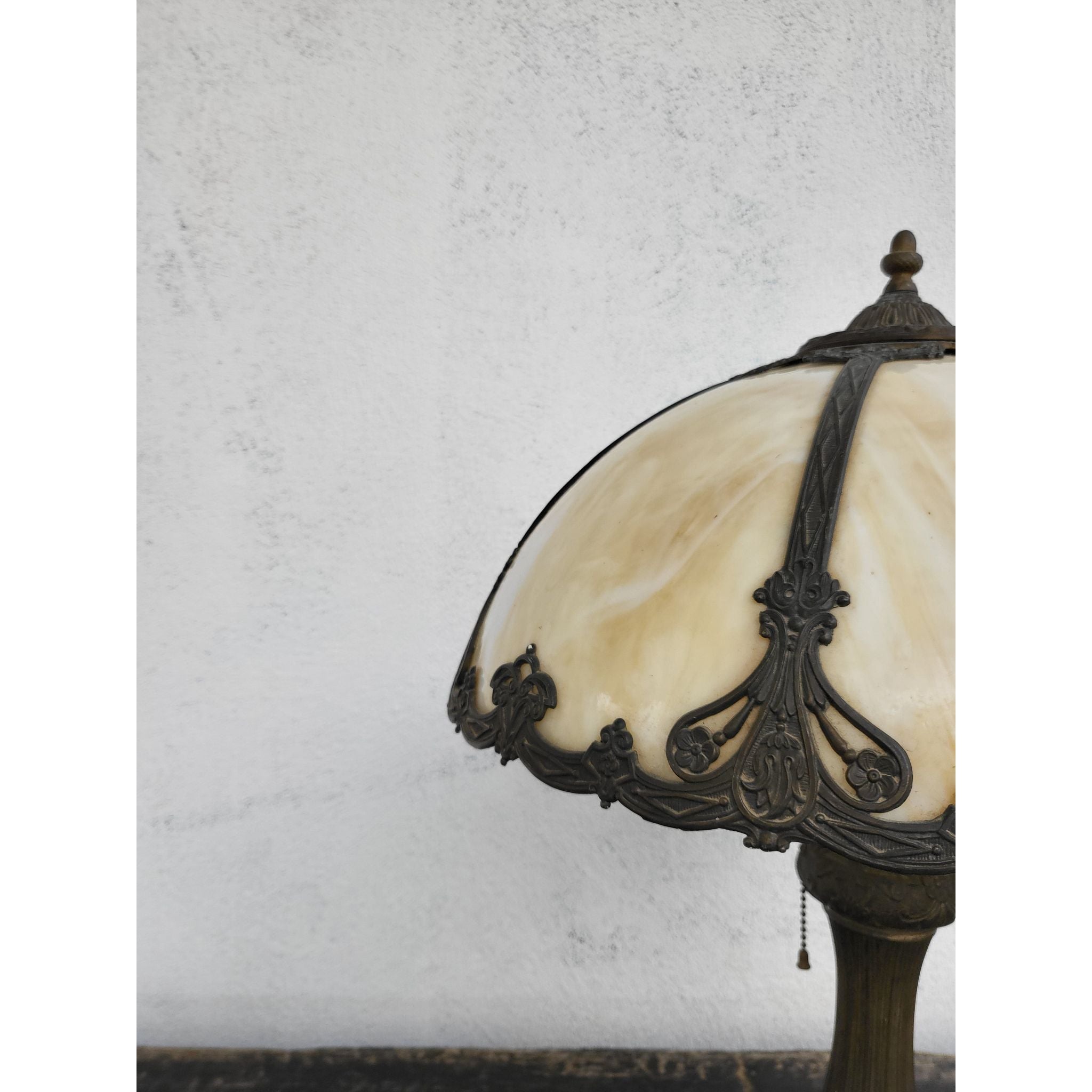 This antique slag glass lamp captures the romance of the early 20th century, with its softly glowing marbled shade and intricate Art Nouveau metalwork.