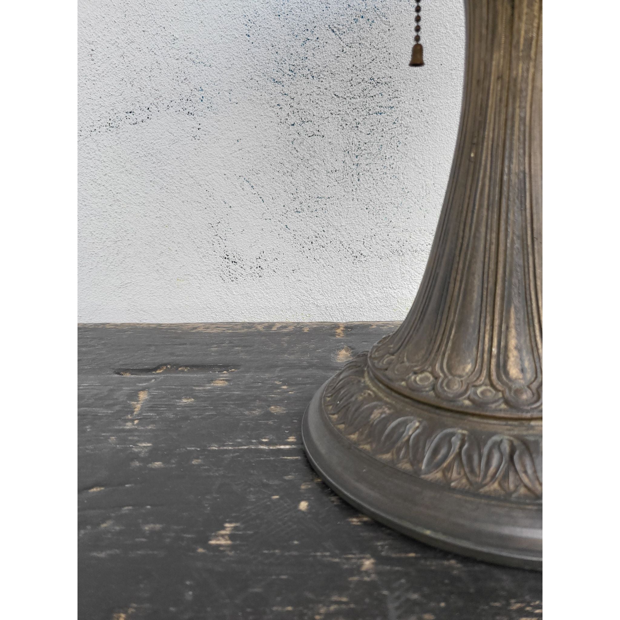 The cast-metal base is heavily decorated with scrolling motifs and a flared foot, giving the lamp both stability and presence. When lit, the slag glass comes alive with a warm, inviting glow - a perfect marriage of function and artistry.