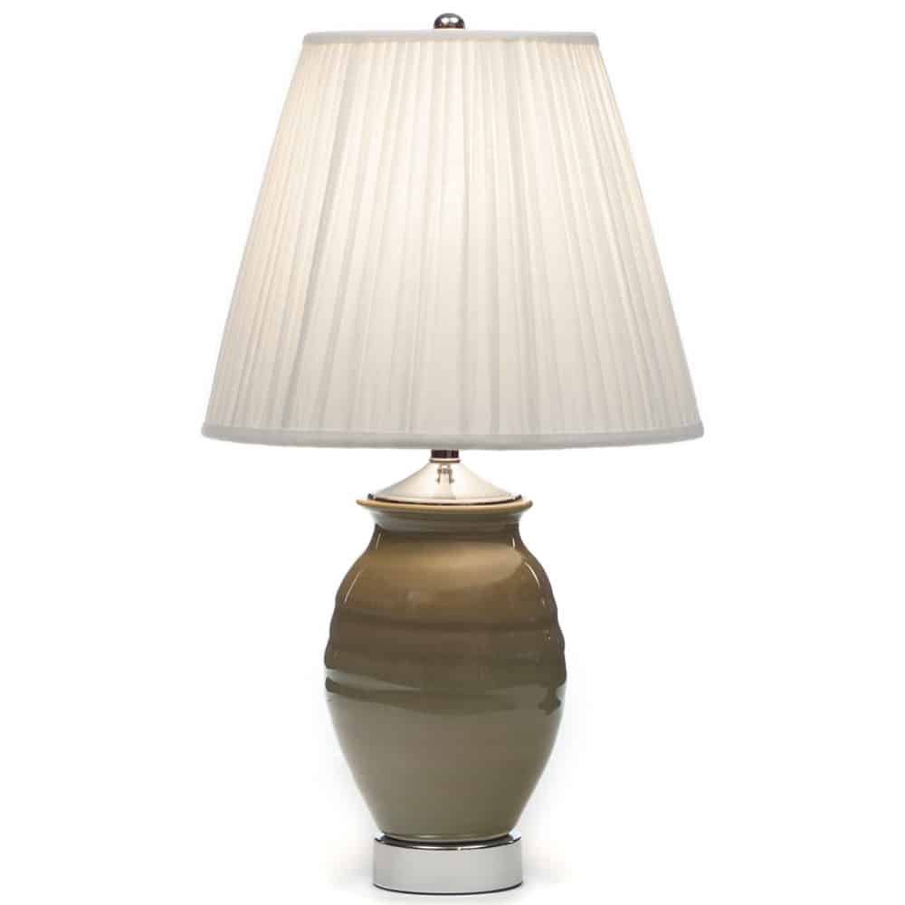 The lamp features a handmade body of glazed pottery. The handmade white linen shade complements the artisan workmanship of the lamp. It would make a statement in the living room as a bespoke piece in a contemporary decor. For the new home owner think about this as a starting point for personalising your home.