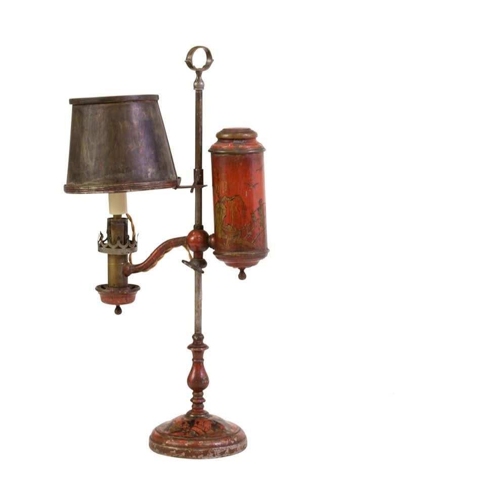 vertical tank and burner adjustable on the central shaft, original conical shade, weighted base. Retains its original red-painted surface with gilt chinoiserie decoration. France, Second half 19th century