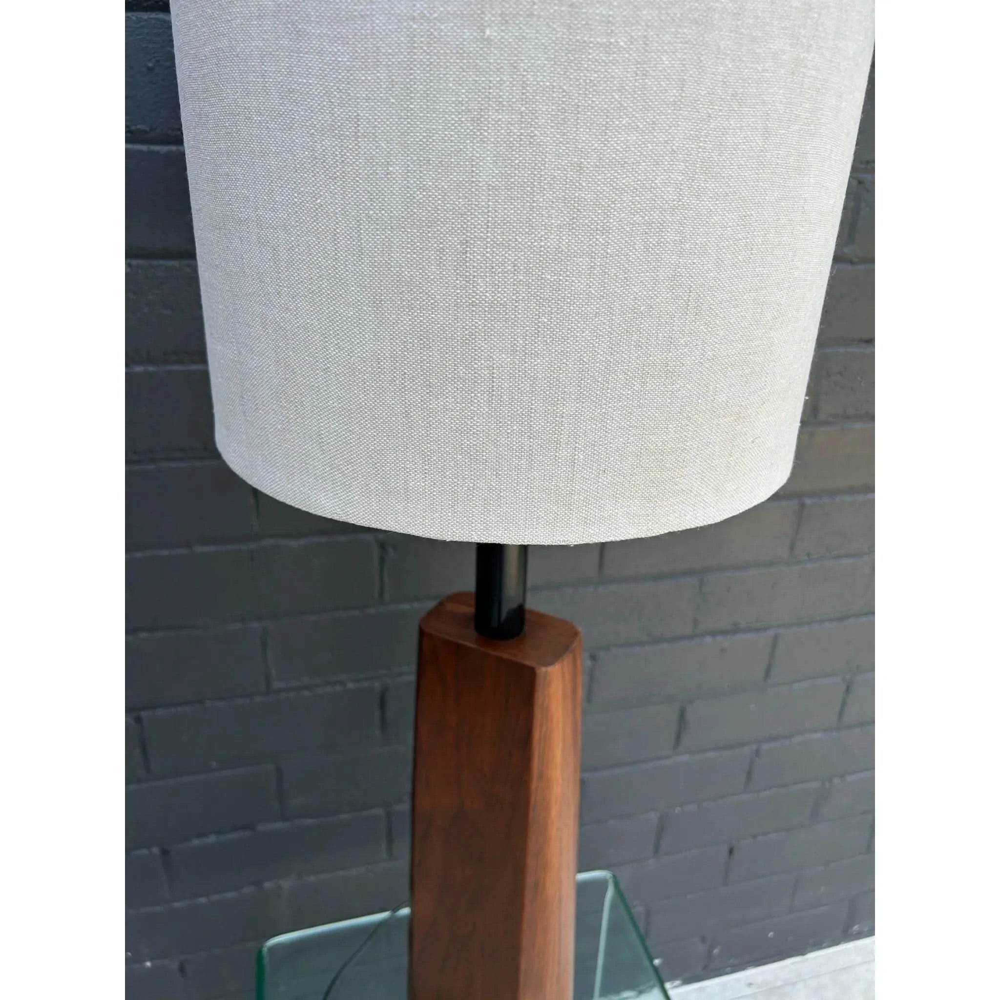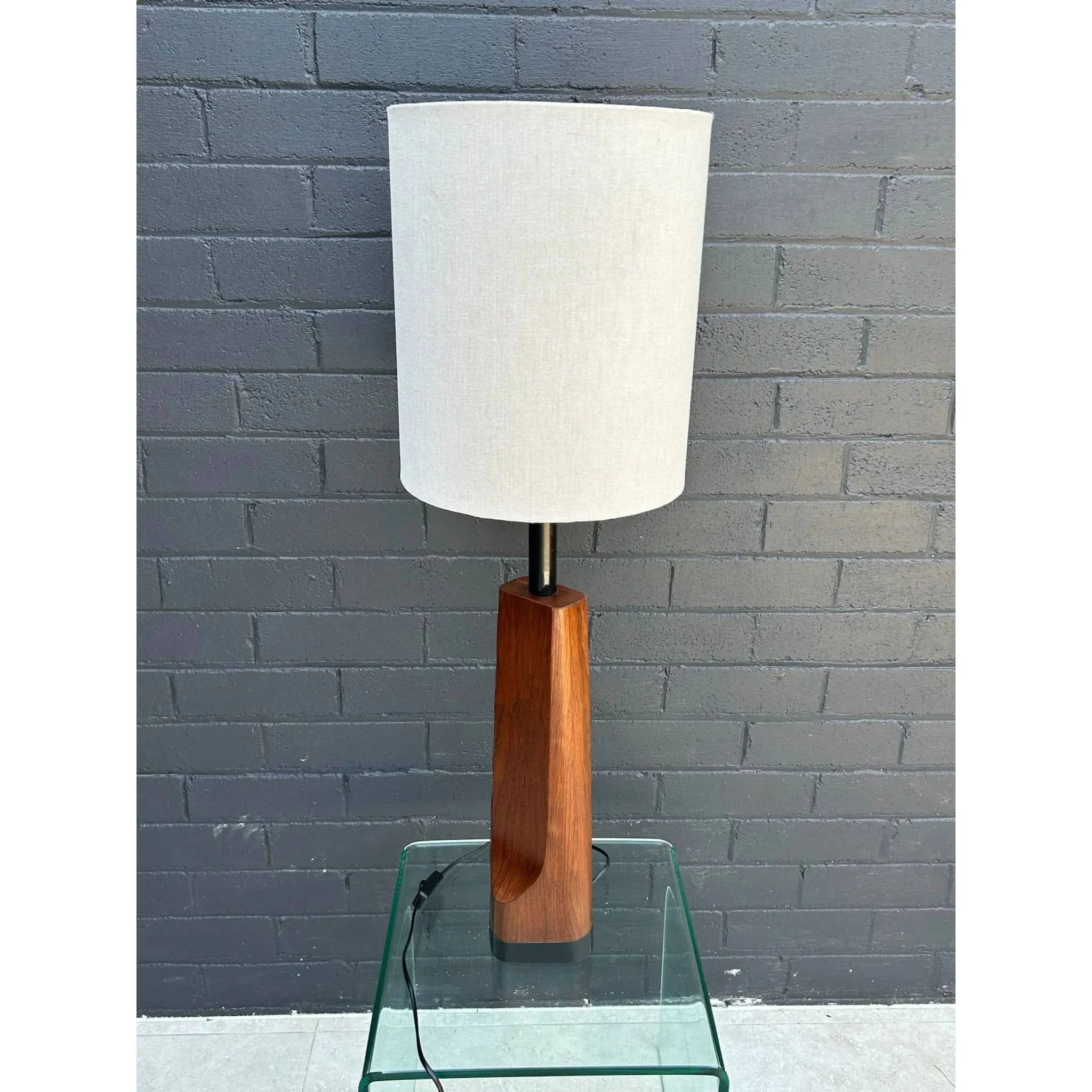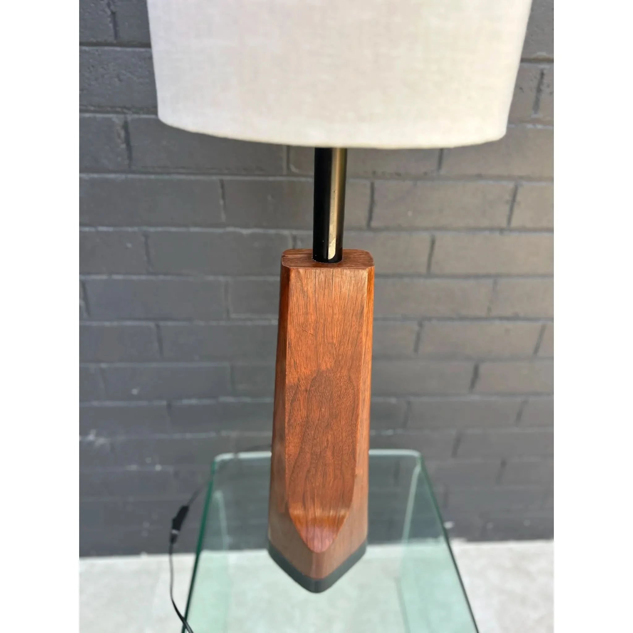 These rare sculpted lamps were manufactured by Laurel Lamps in the mid 1960s in New Jersey. The lamp is made of a walnut veneer moulded to a metal base with a black leather strip along the bottom of the base. This lamp was first offered in the walnut finish before being offered in chrome. The lamp is in good vintage condition with a few minor wear marks consistent with age. The drum shade is made of linen and is new. I have used a standard lampshade (original was a harp mount lampshade), converted by using E27 adapters. The lamp has also been re-wired to the Australian standard. Maker’s sticker with manufacturer’s name and issue was sadly removed as it is illegal to display old American voltage stickers after a rewire. Please see photos for authenticity.