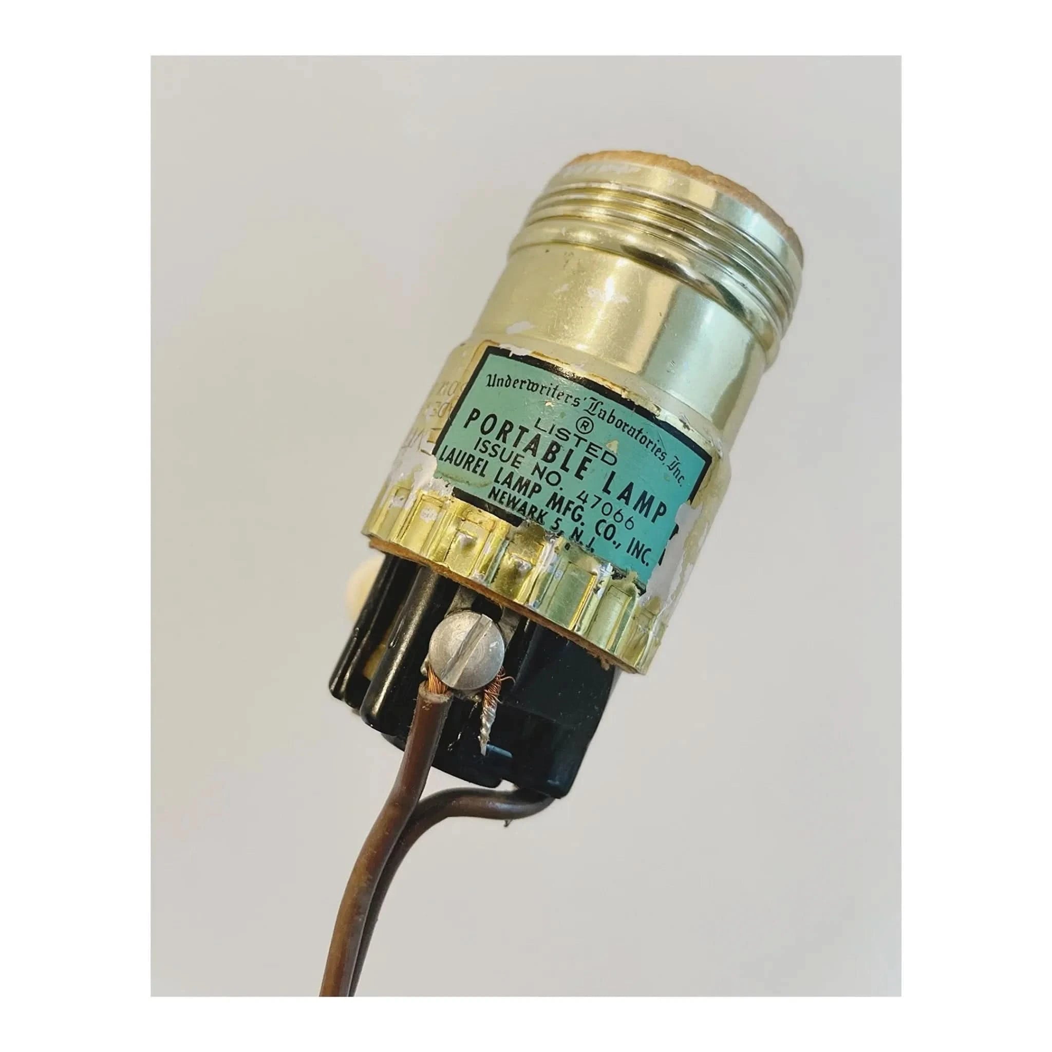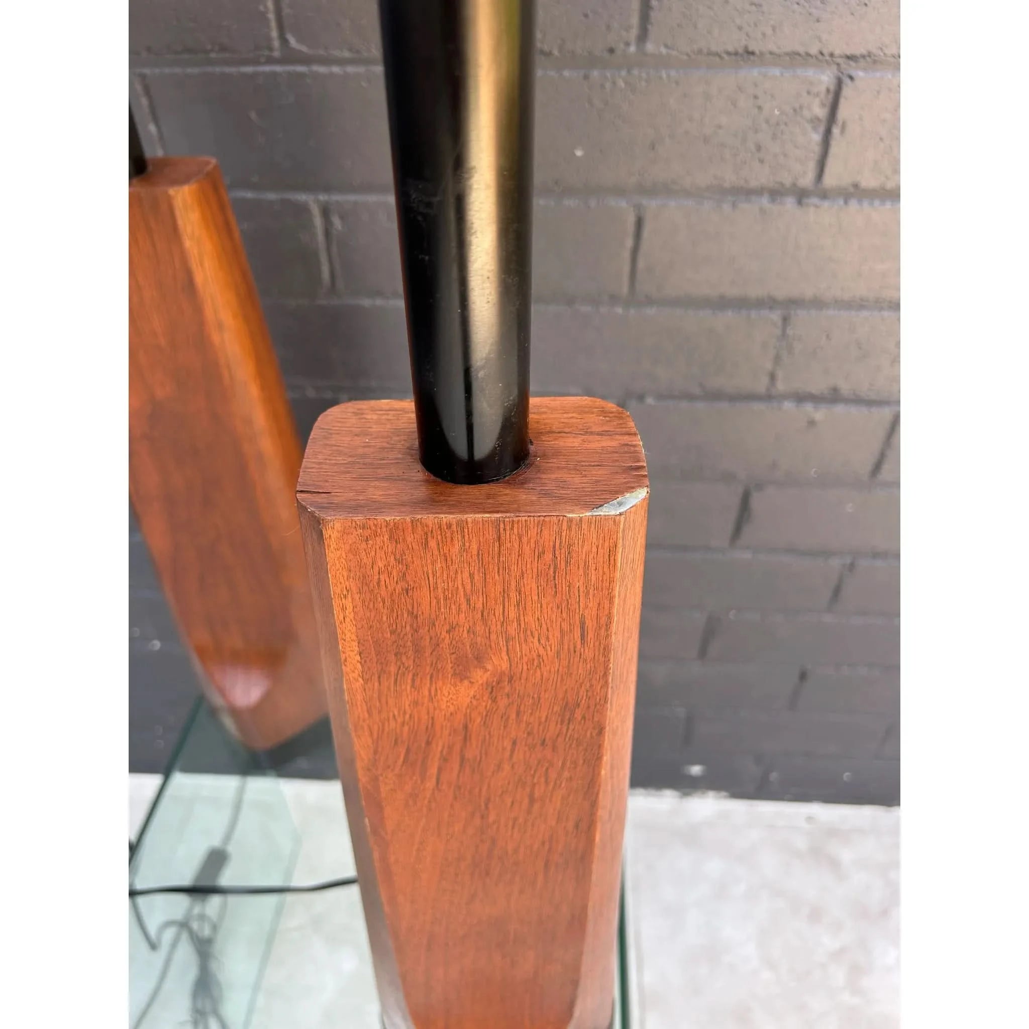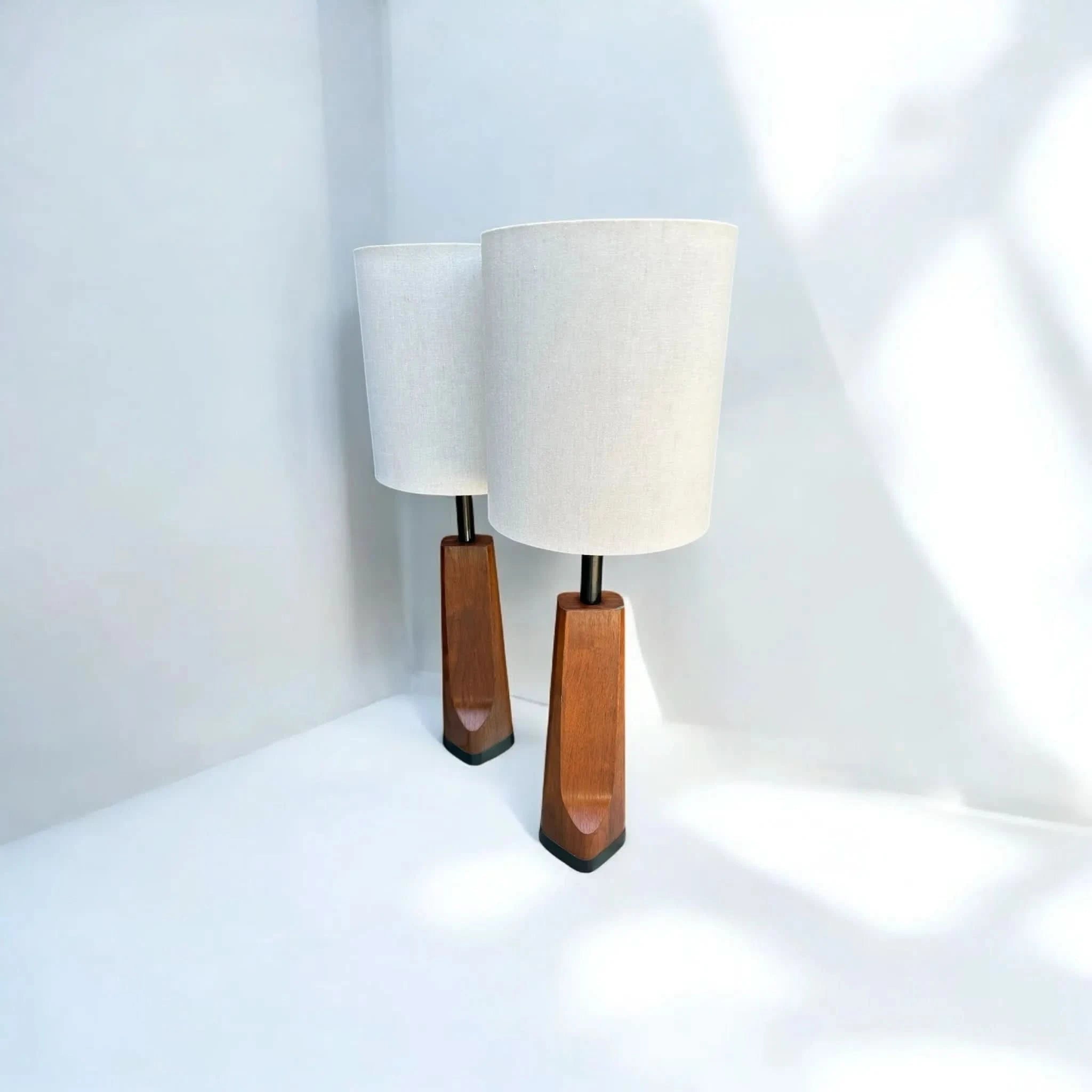 These rare sculpted lamps were manufactured by Laurel Lamps in the mid 1960s in New Jersey. The lamp is made of a walnut veneer moulded to a metal base with a black leather strip along the bottom of the base. This lamp was first offered in the walnut finish before being offered in chrome. The lamp is in good vintage condition with a few minor wear marks consistent with age. The drum shade is made of linen and is new. I have used a standard lampshade (original was a harp mount lampshade), converted by using E27 adapters. The lamp has also been re-wired to the Australian standard. Maker’s sticker with manufacturer’s name and issue was sadly removed as it is illegal to display old American voltage stickers after a rewire. Please see photos for authenticity.