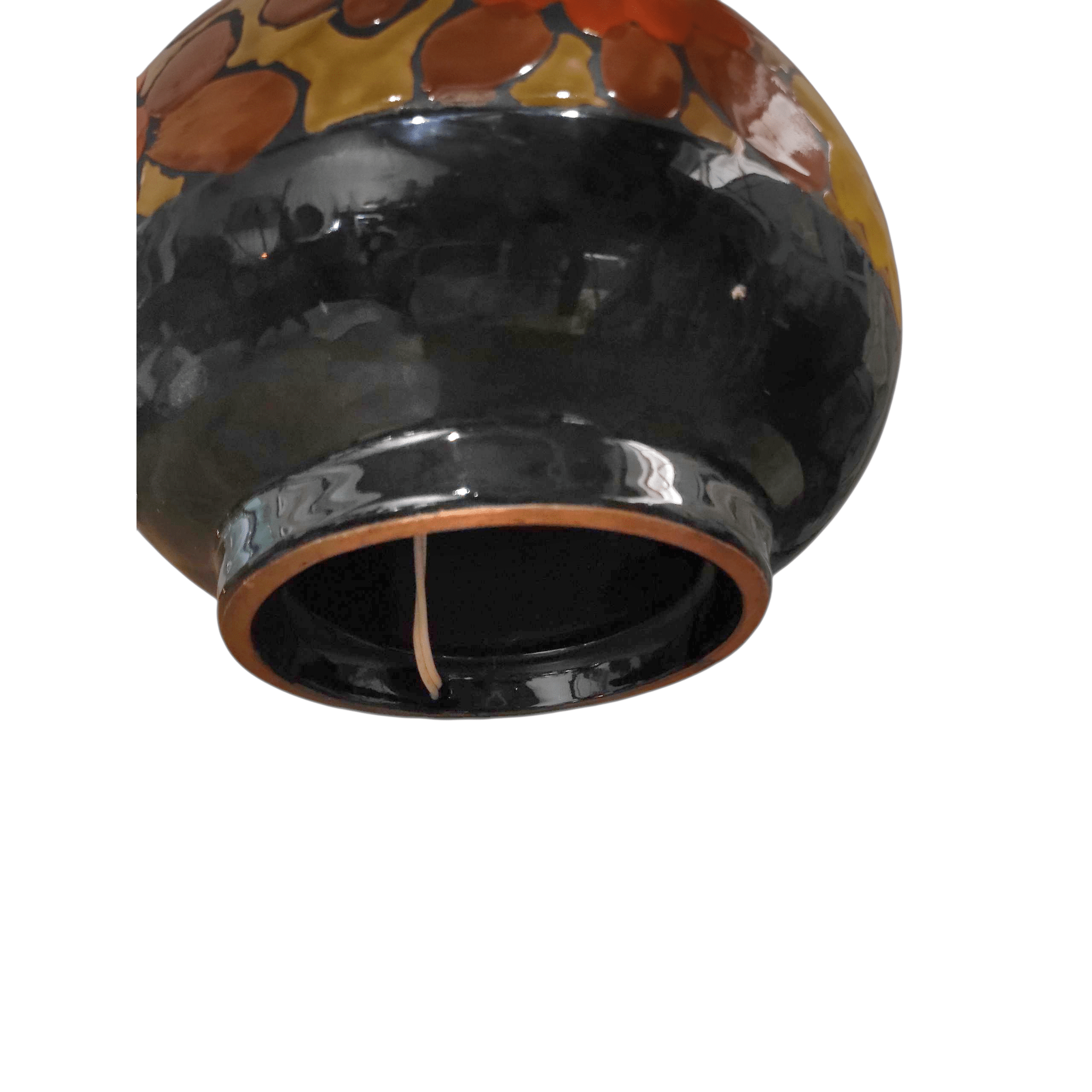 Featuring a bulbous base with bold retro florals in warm tones of sunset orange, butter yellow, and earthy brown, it embodies the playful optimism of 1960s–70s design.