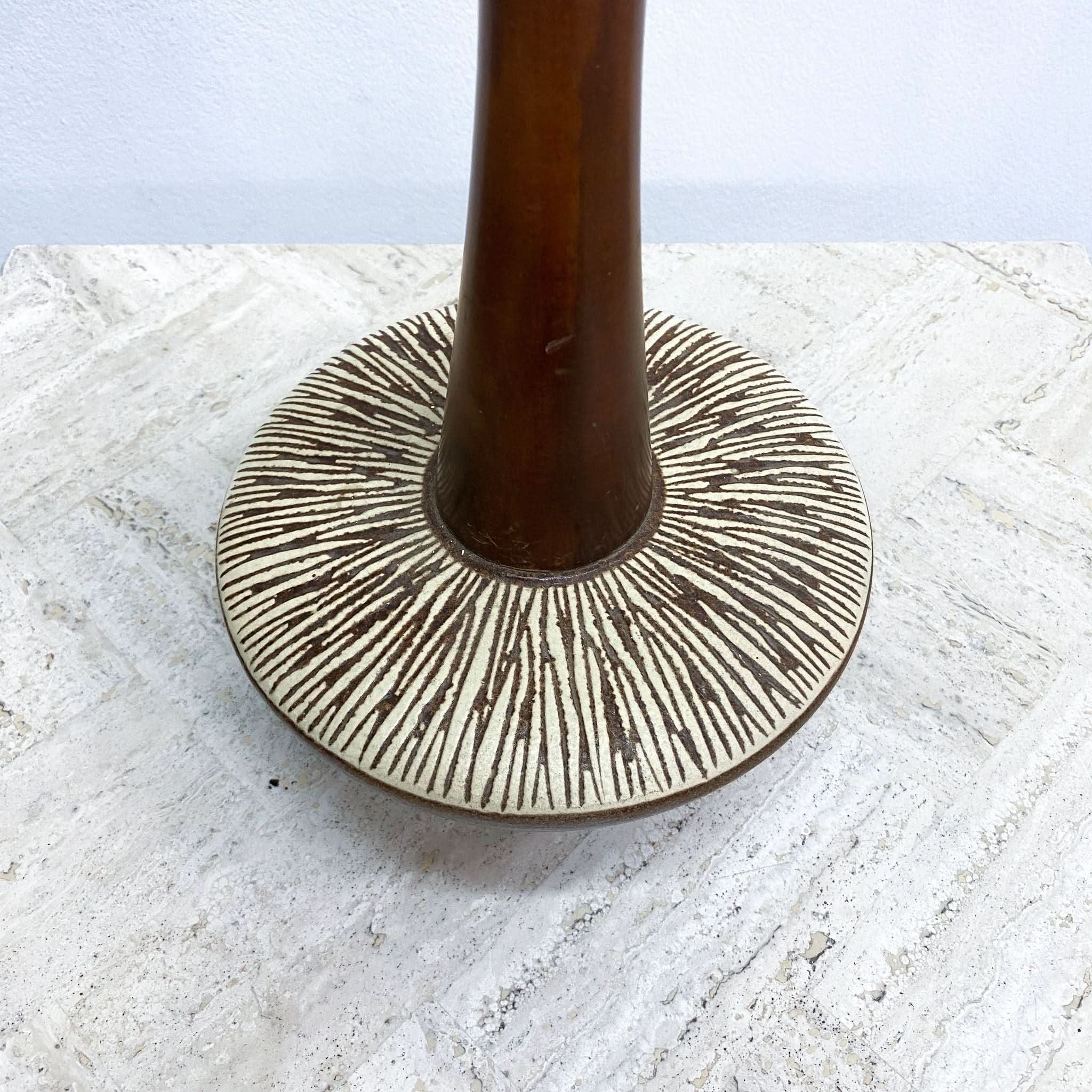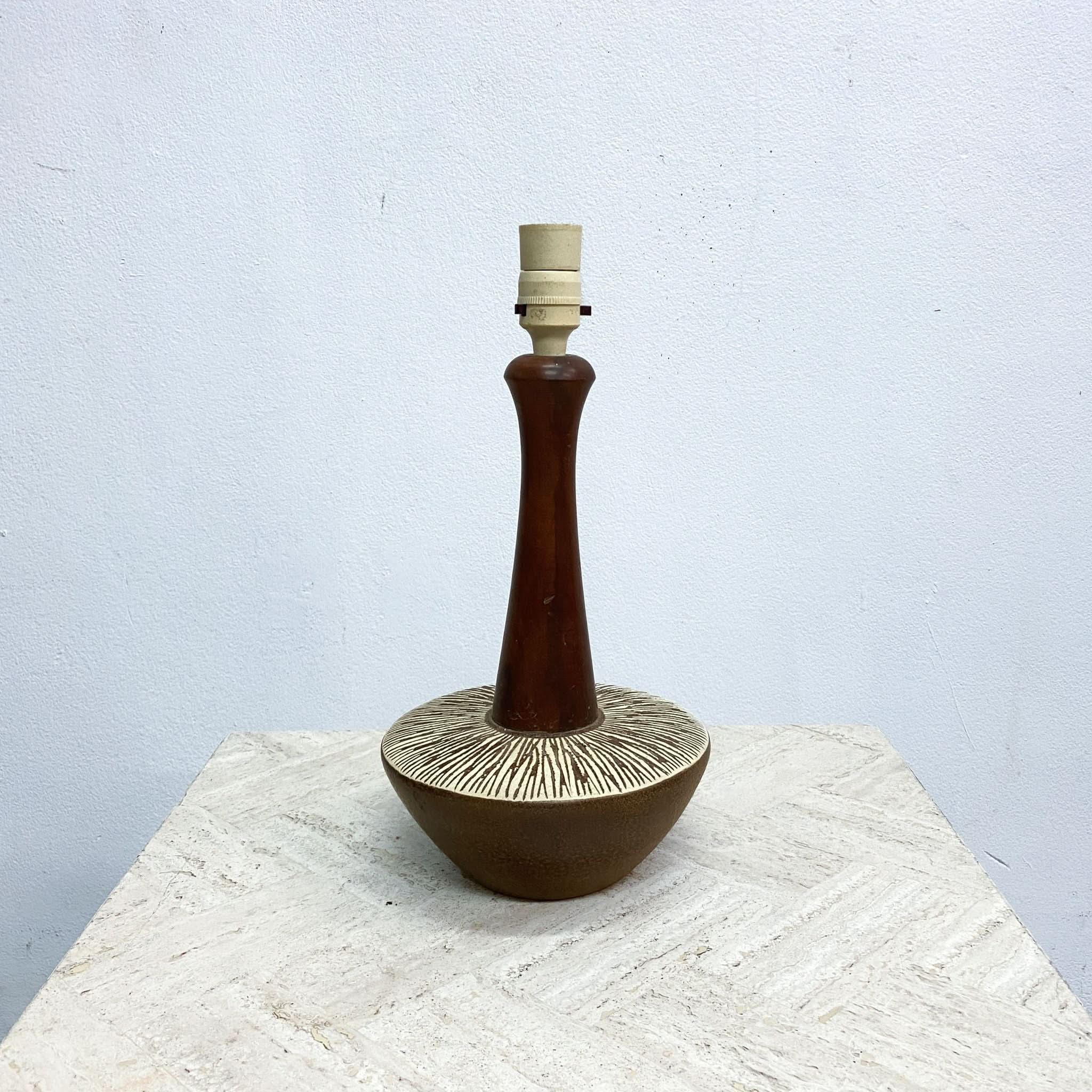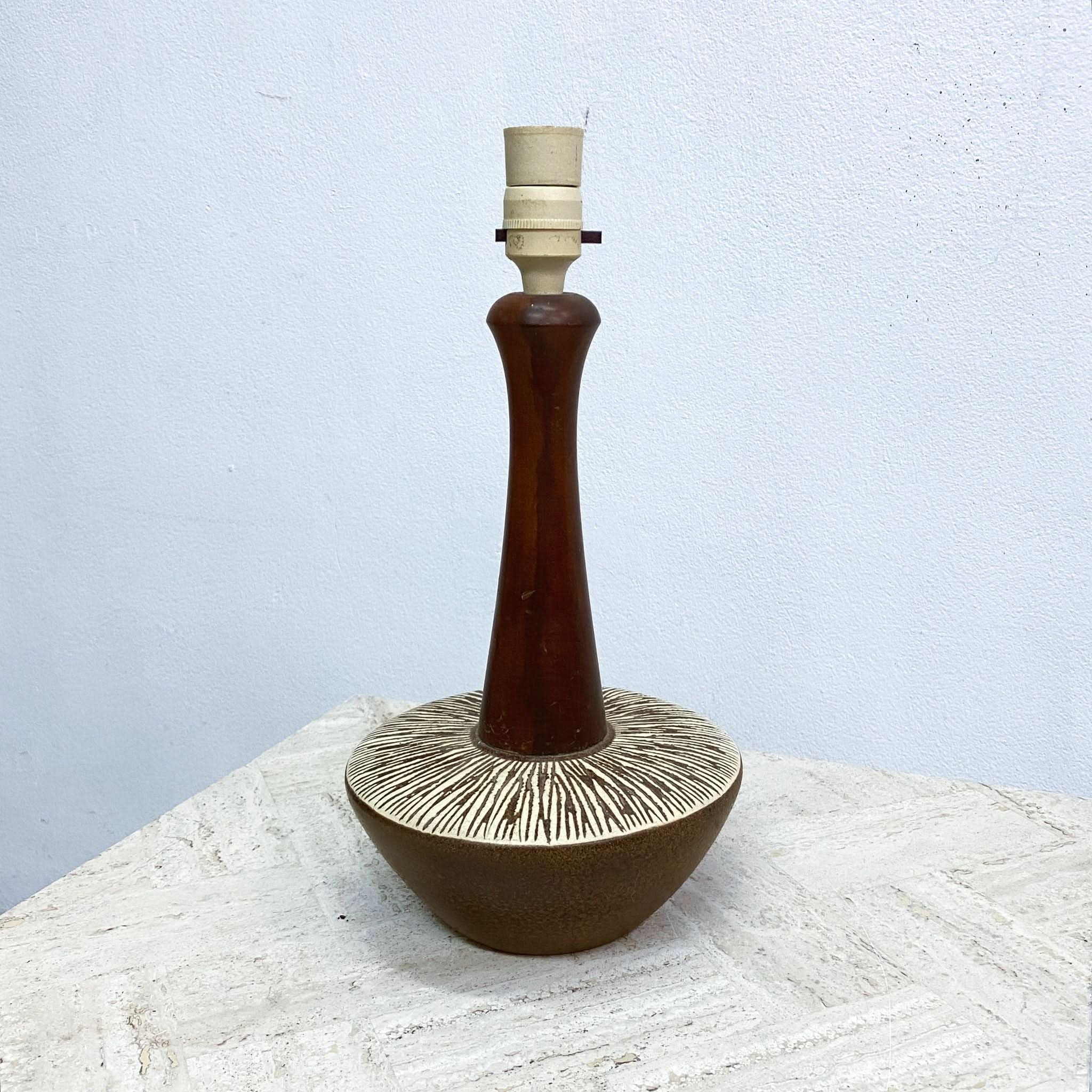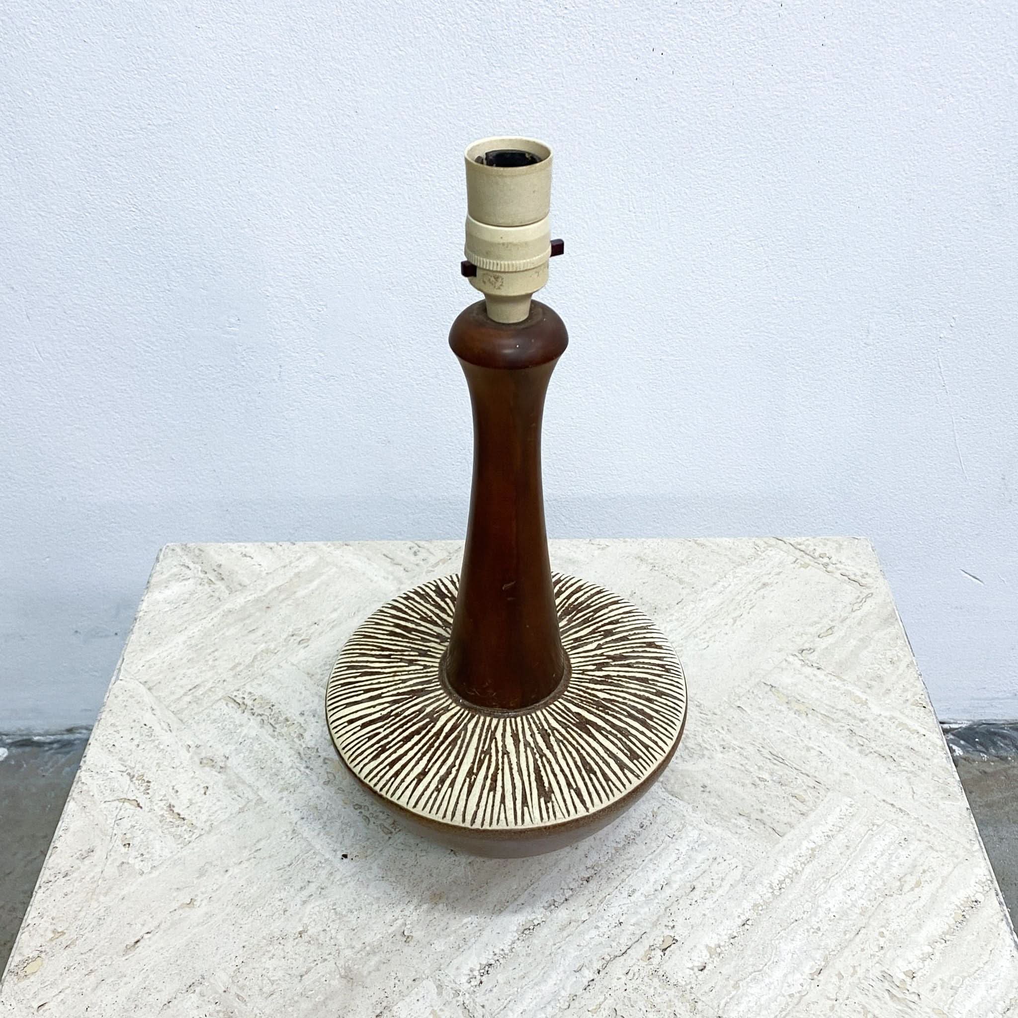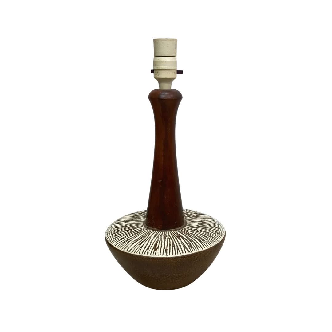 Great mid century 1960s table lamp with etched and glazed ceramic base and wooden neck.  In very good original condition