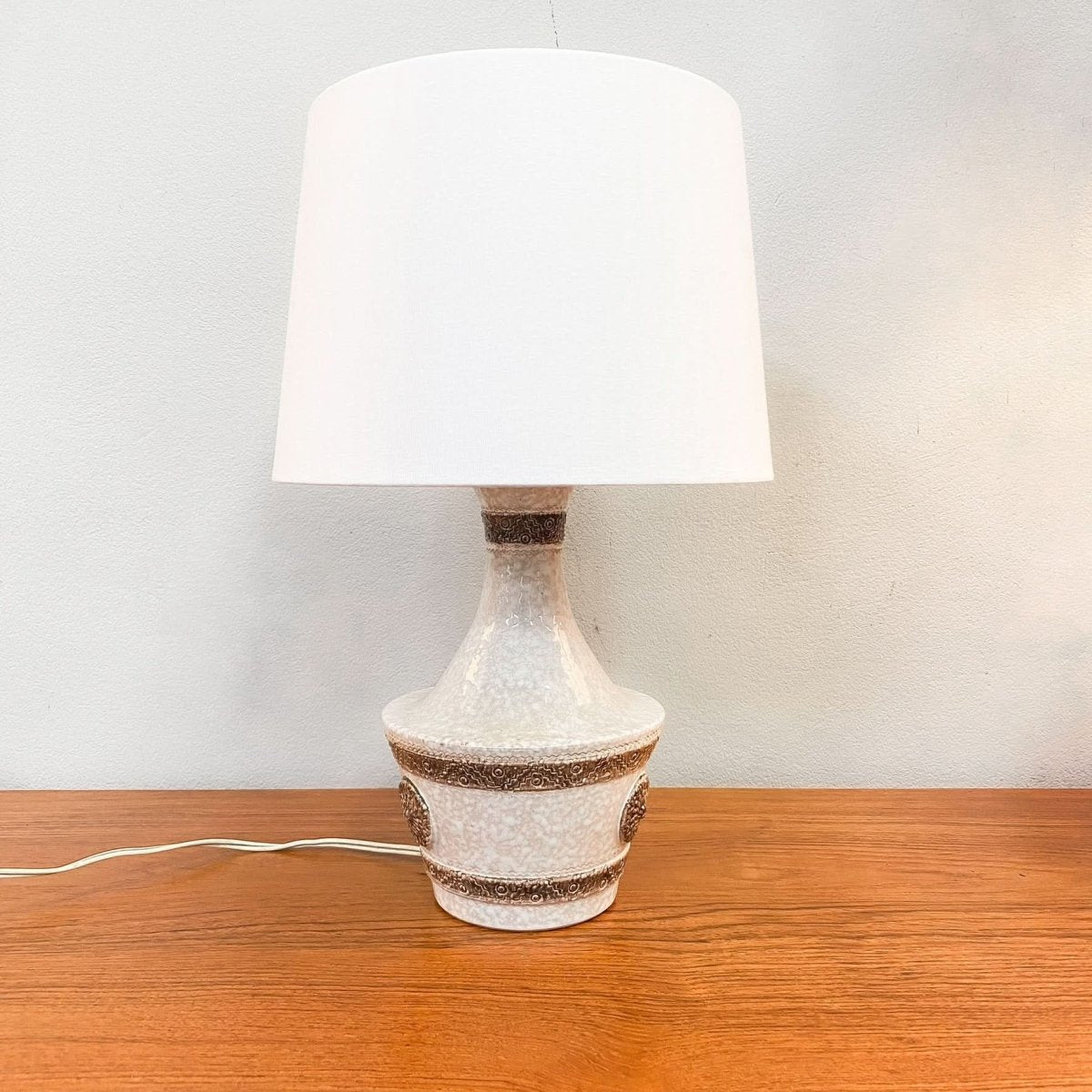 Mid Century ceramic Italian table lamp with a dappled cream glaze with brown glazed banding and medallion patterns. A great addition to your coastal or lighter coloured interior, has a Mediterranean feel to it.