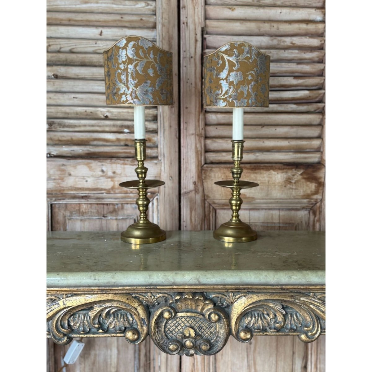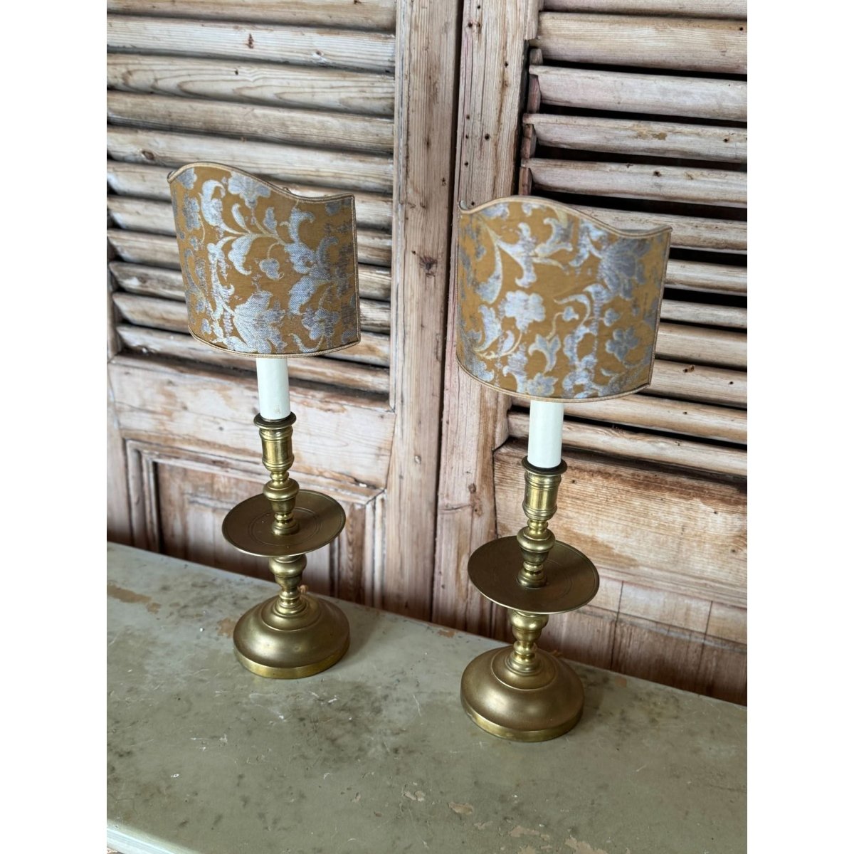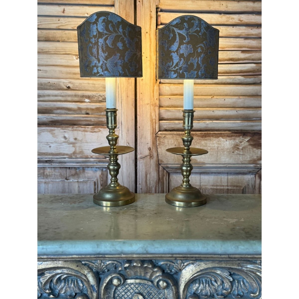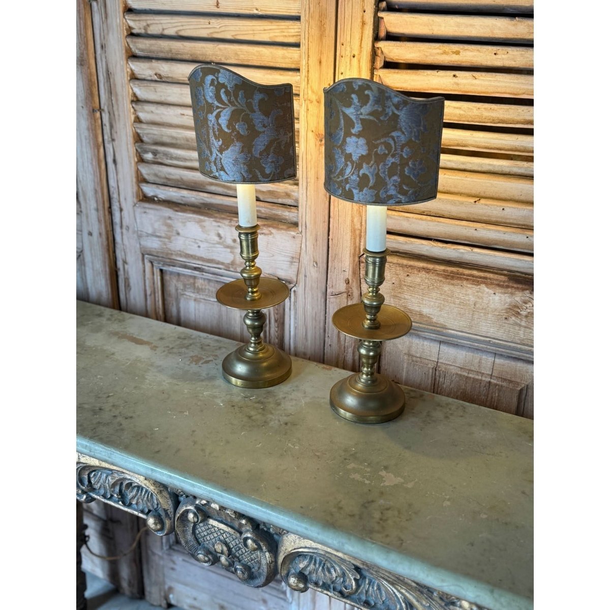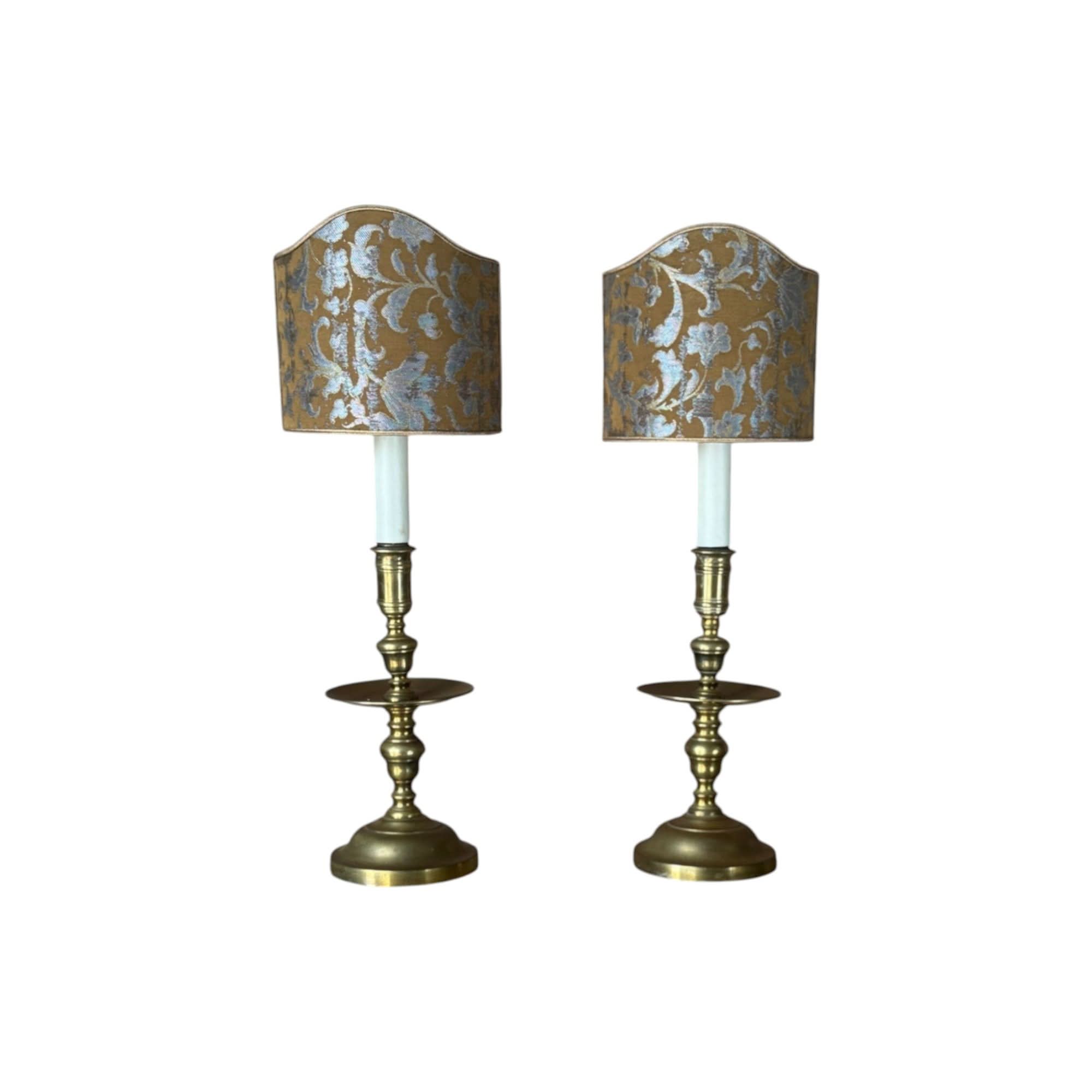 Antique pair of 19th century electrified brass candlestick table lamps in excellent condition. Coupled with new Italian made clip-on shield shades with 'Rubelli' jacquard fabric and gimped edging. Minor tarnishing to bases as expected with age (refer photos).
