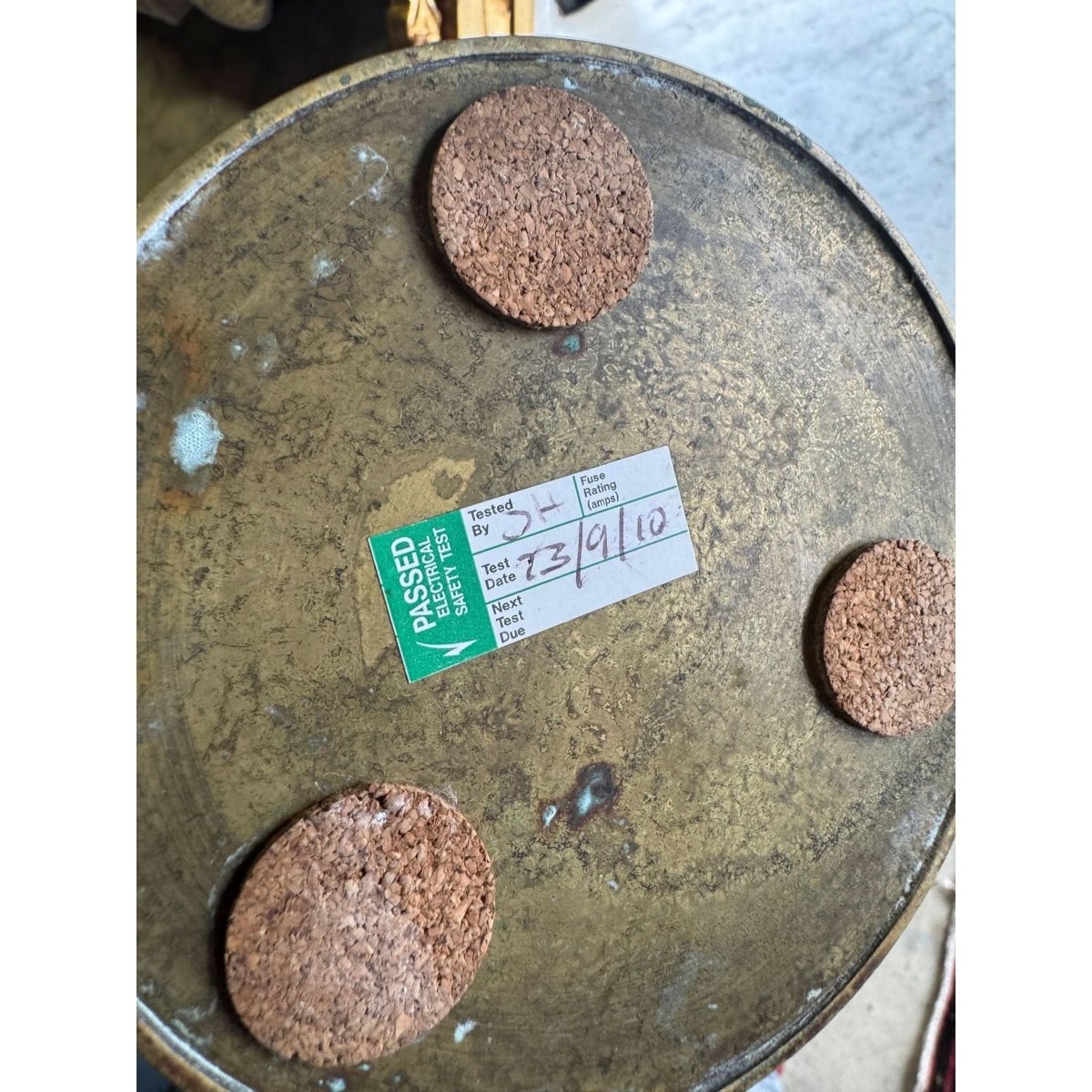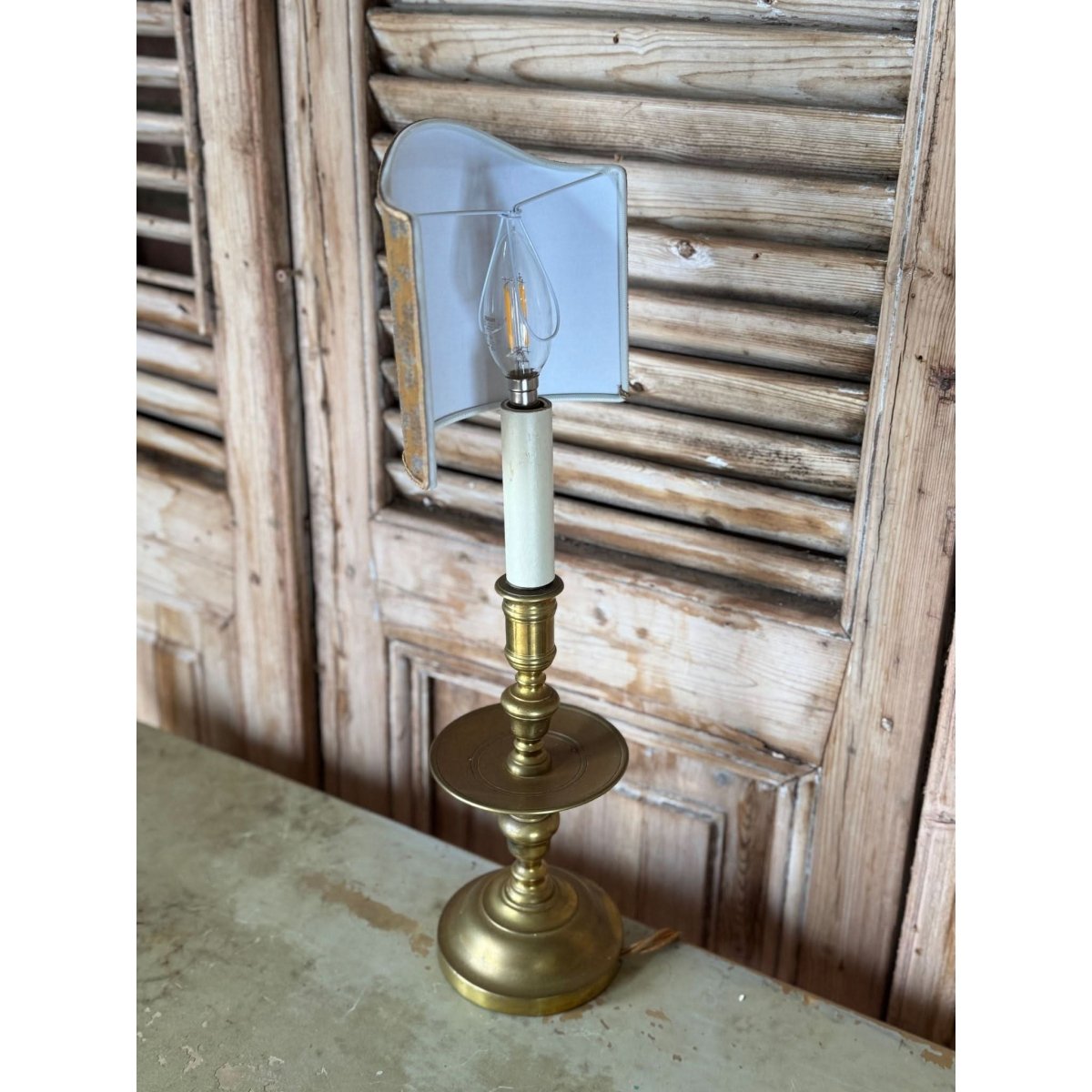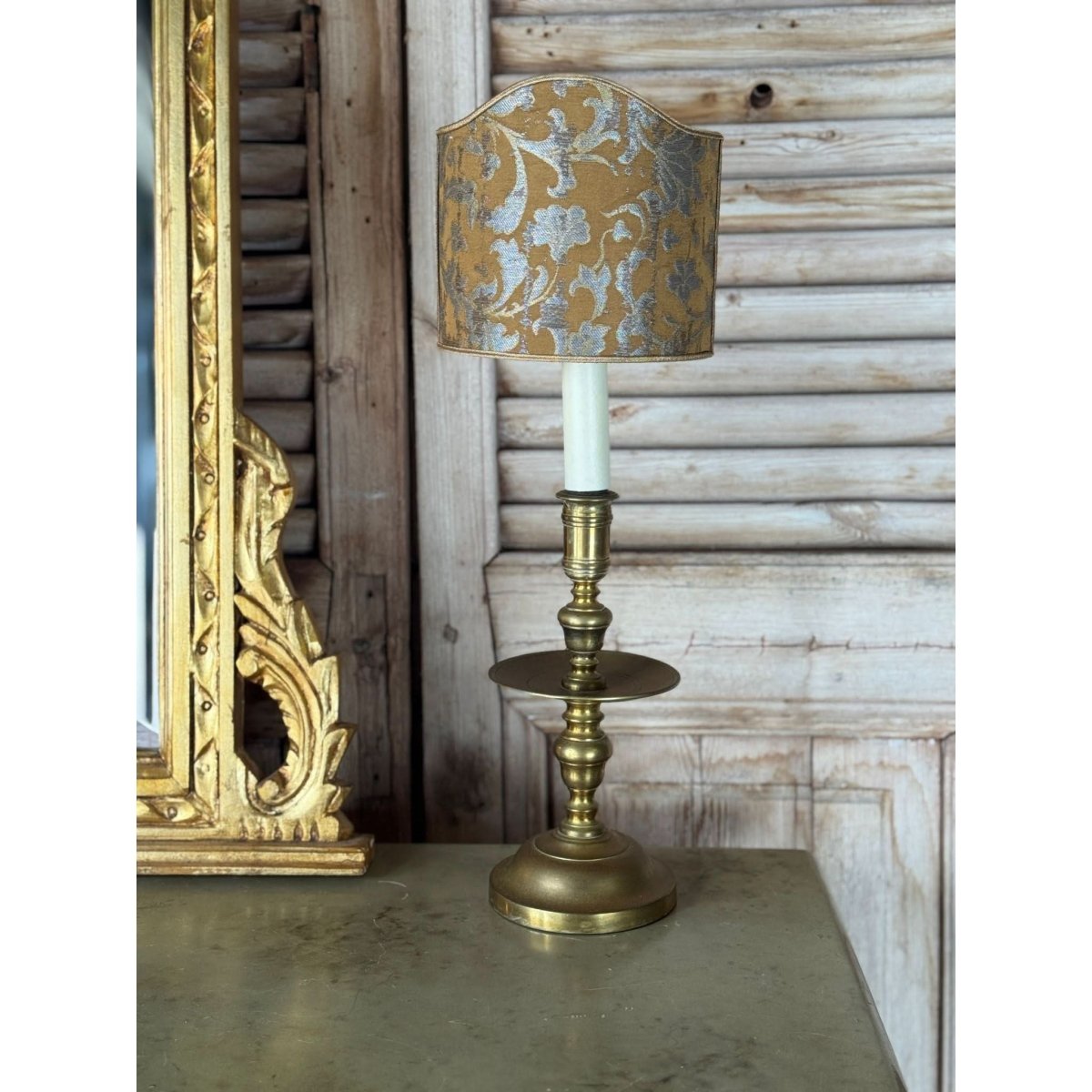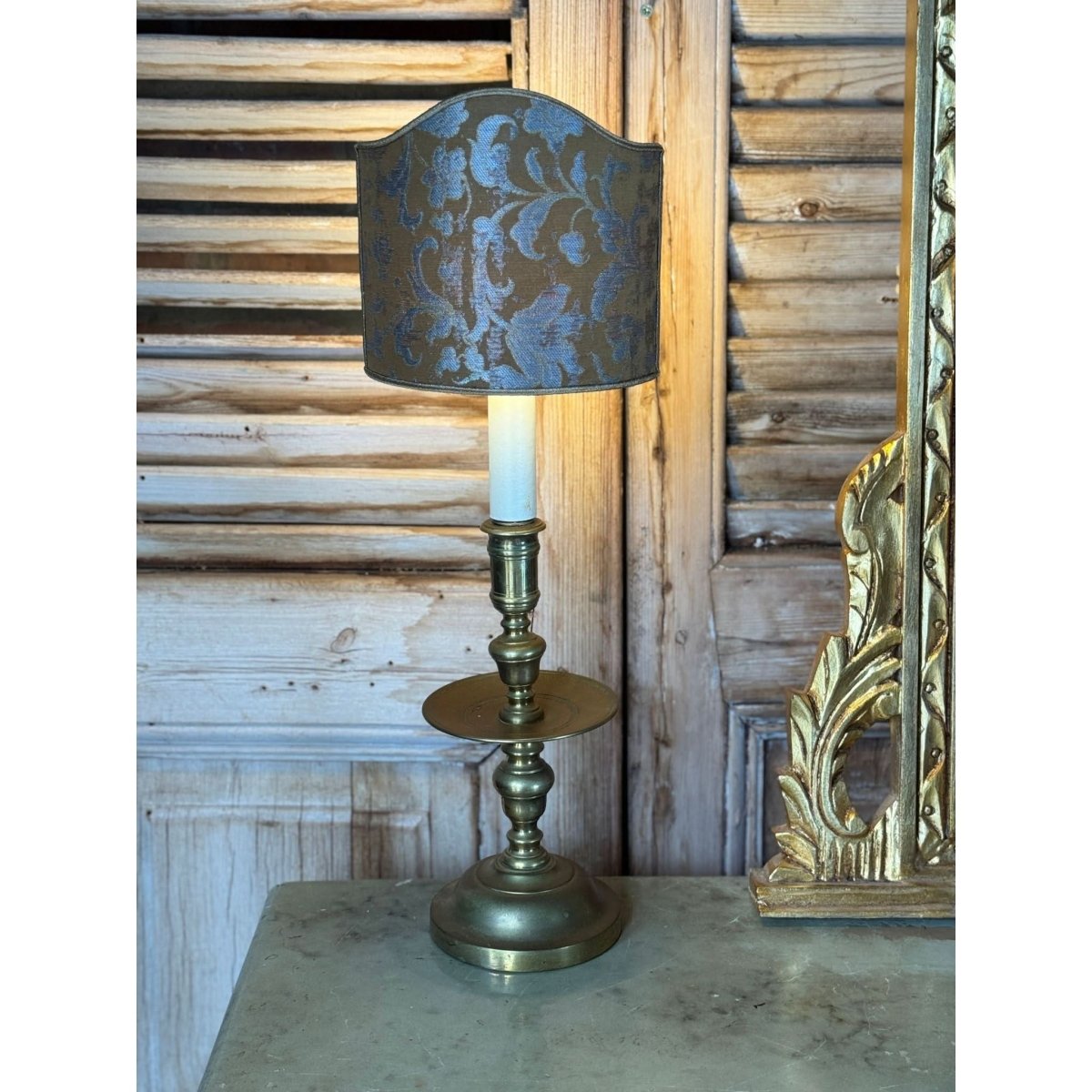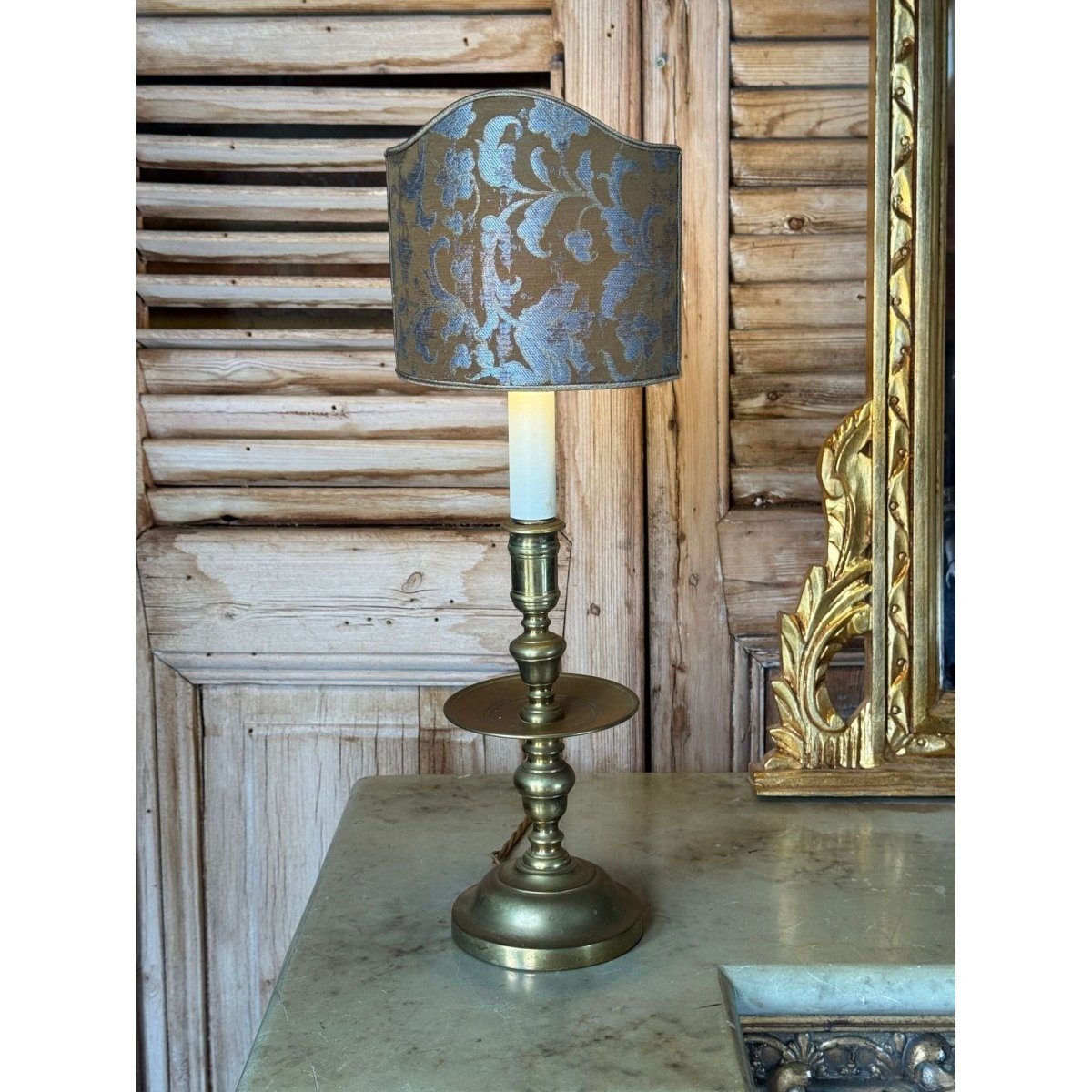 Antique pair of 19th century electrified brass candlestick table lamps in excellent condition. Coupled with new Italian made clip-on shield shades with 'Rubelli' jacquard fabric and gimped edging. Minor tarnishing to bases as expected with age (refer photos).