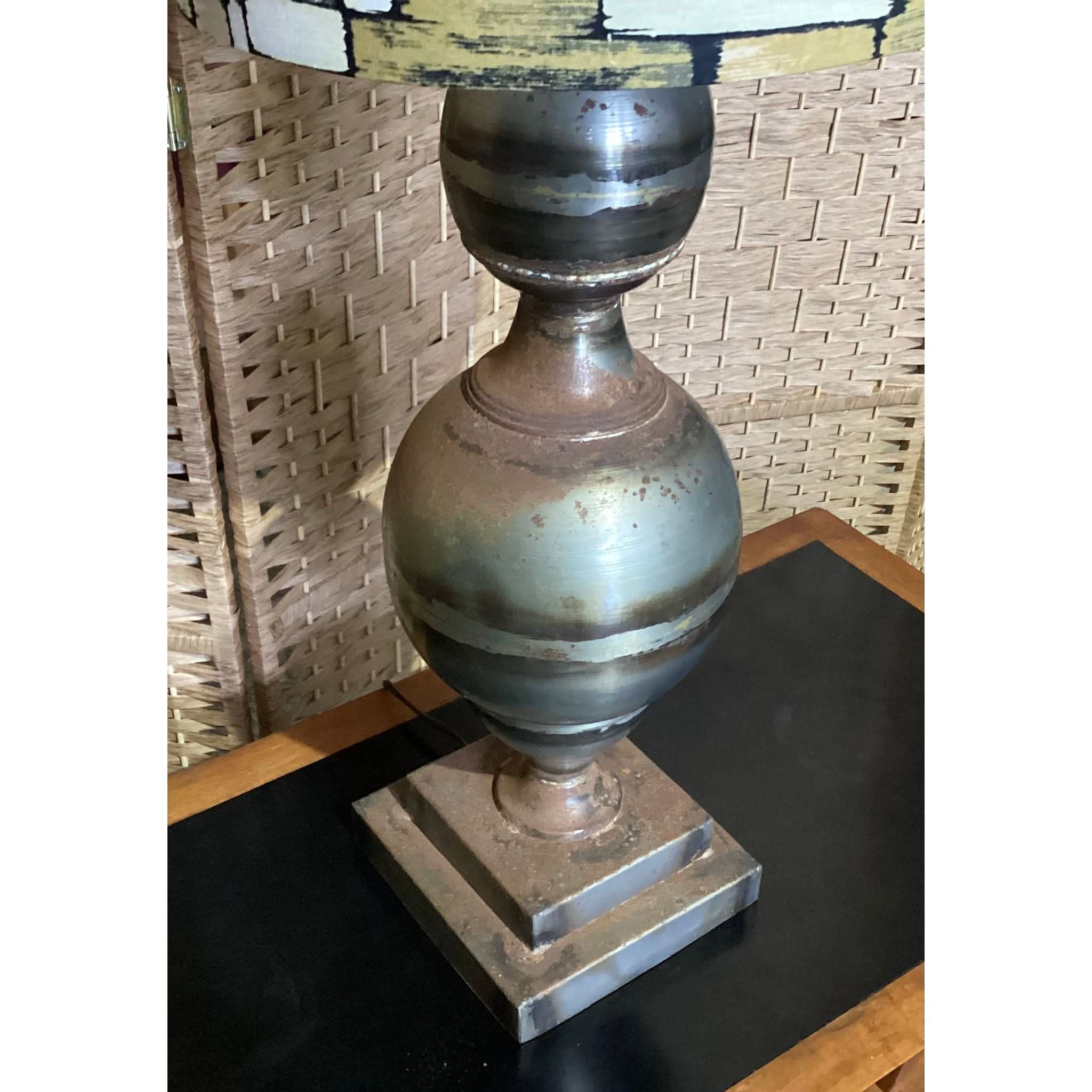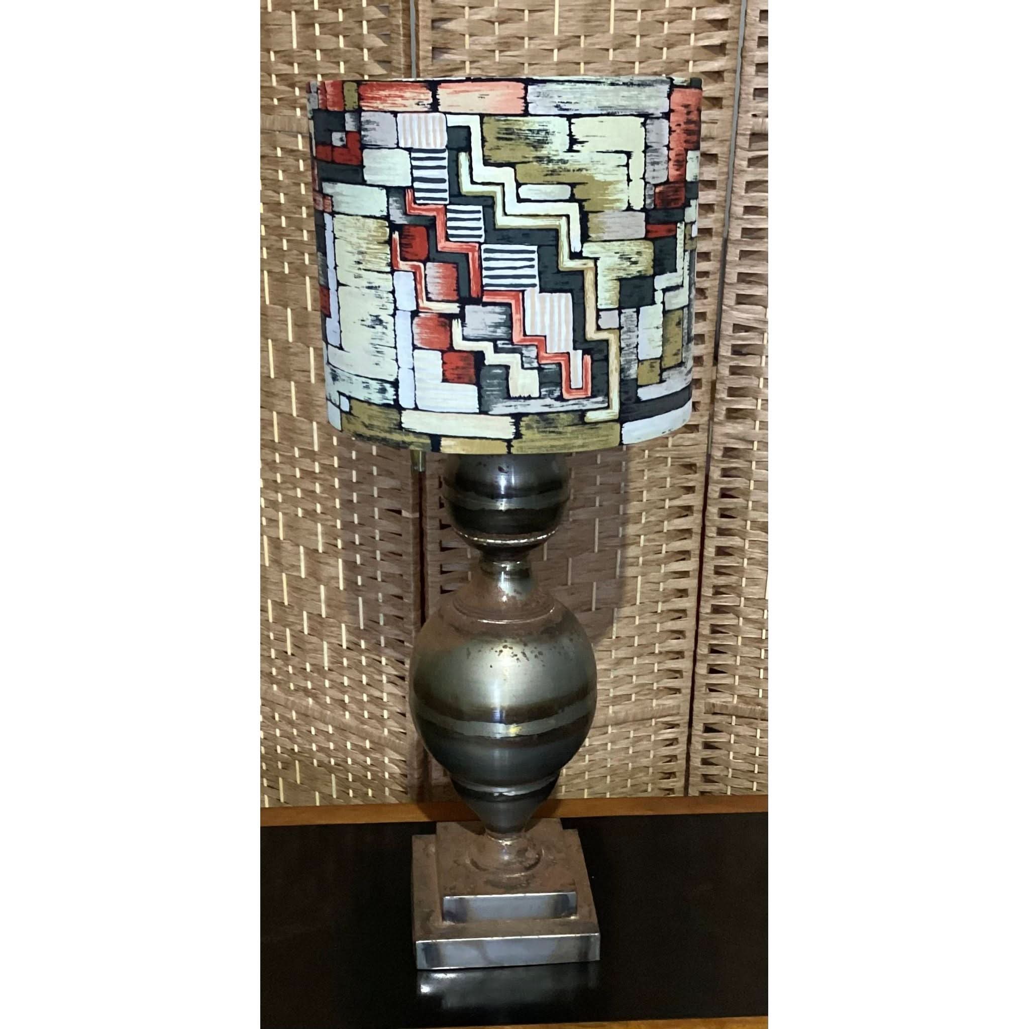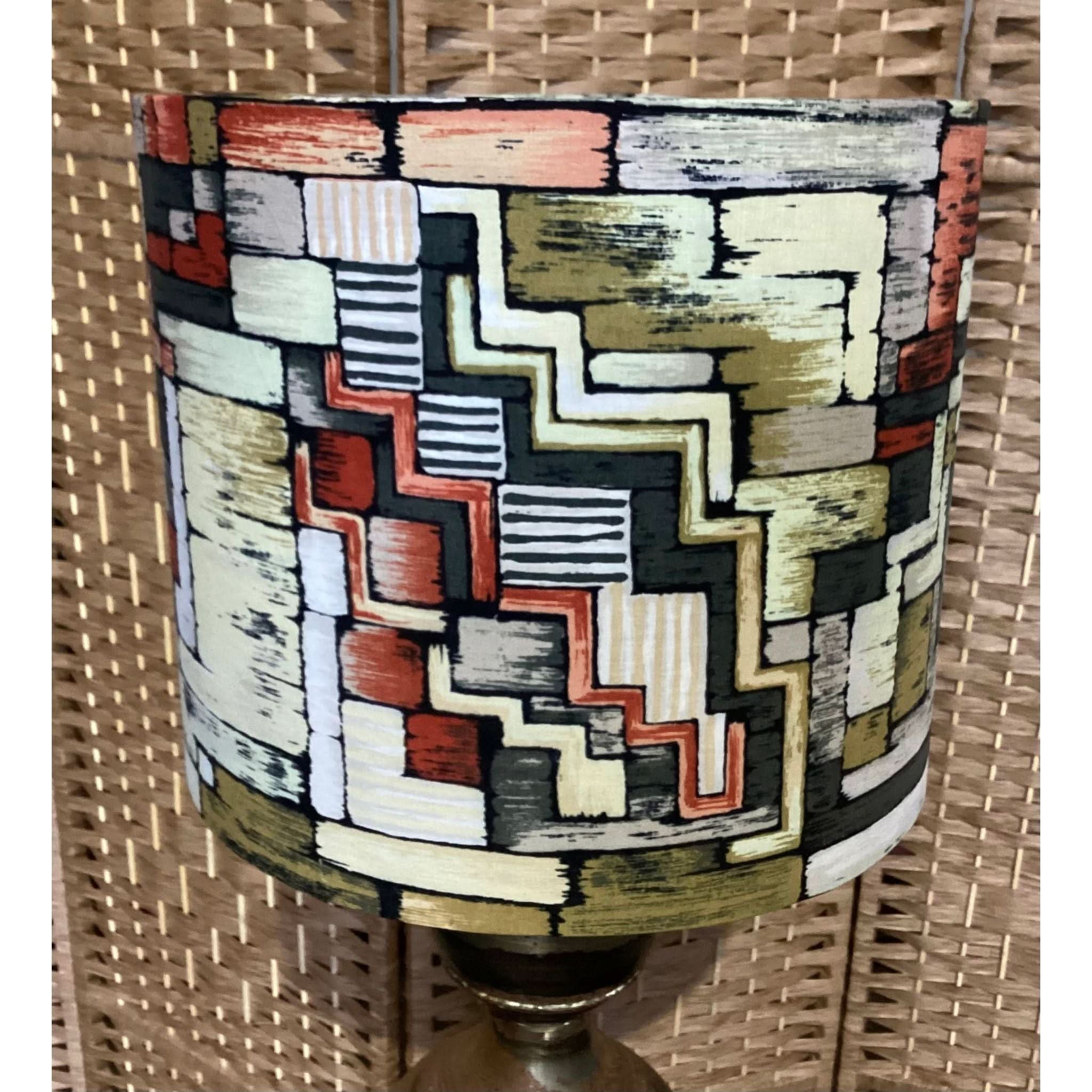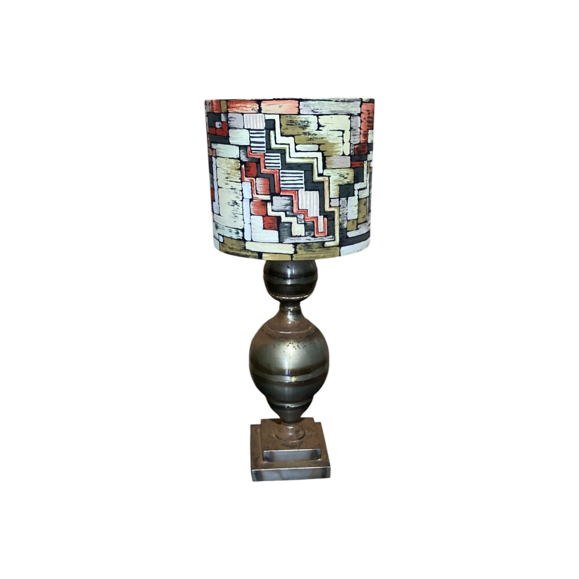 Large brushed metal base with hand made shade in vintage geometric fabric