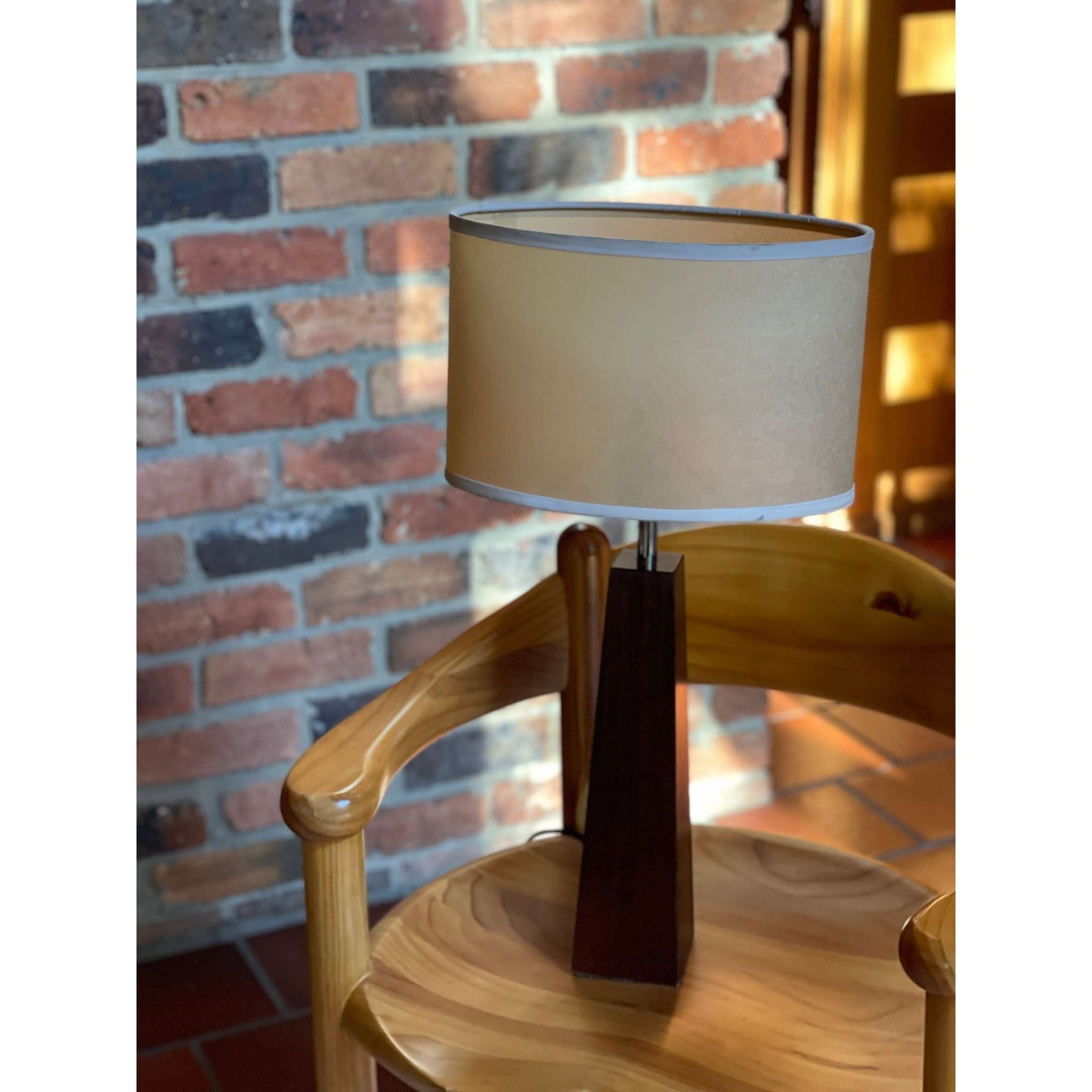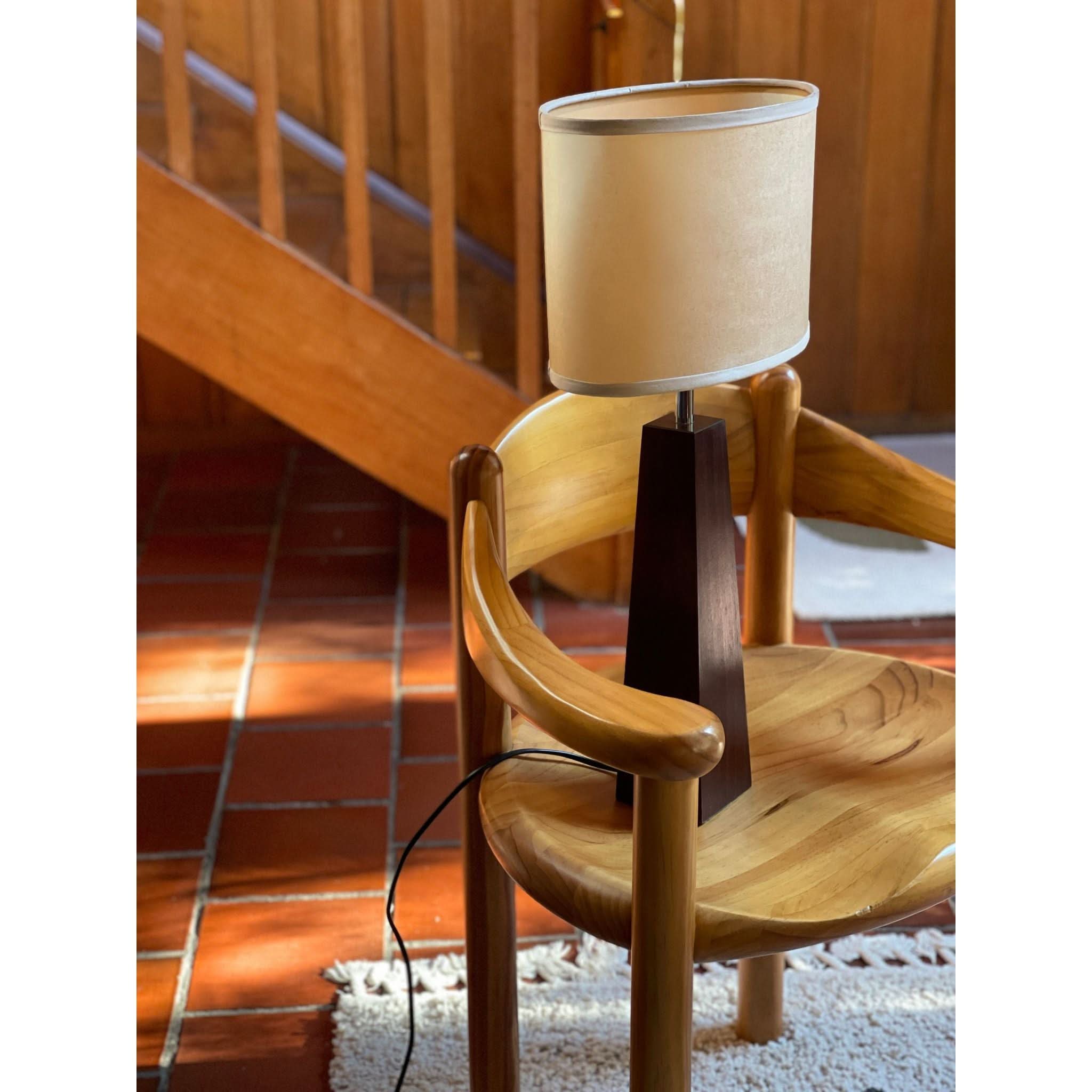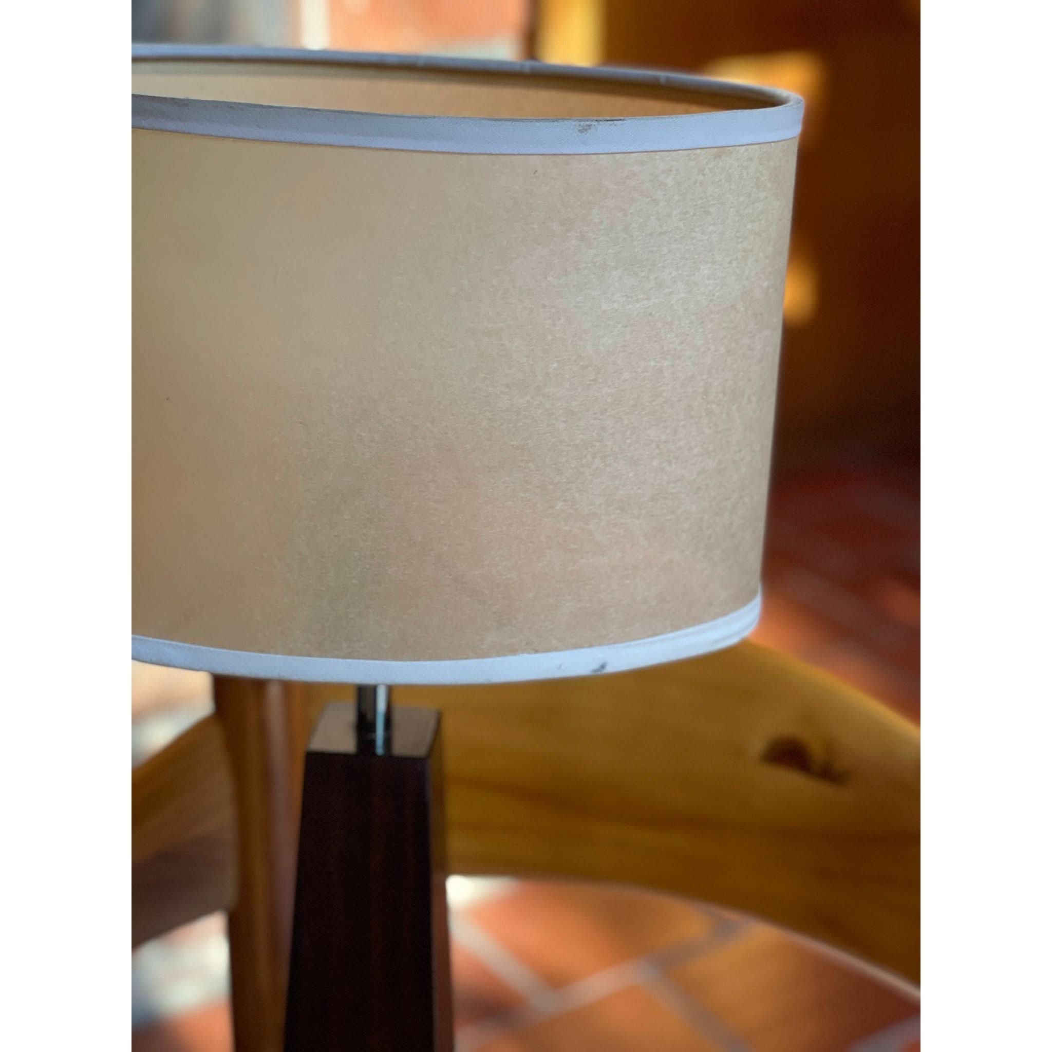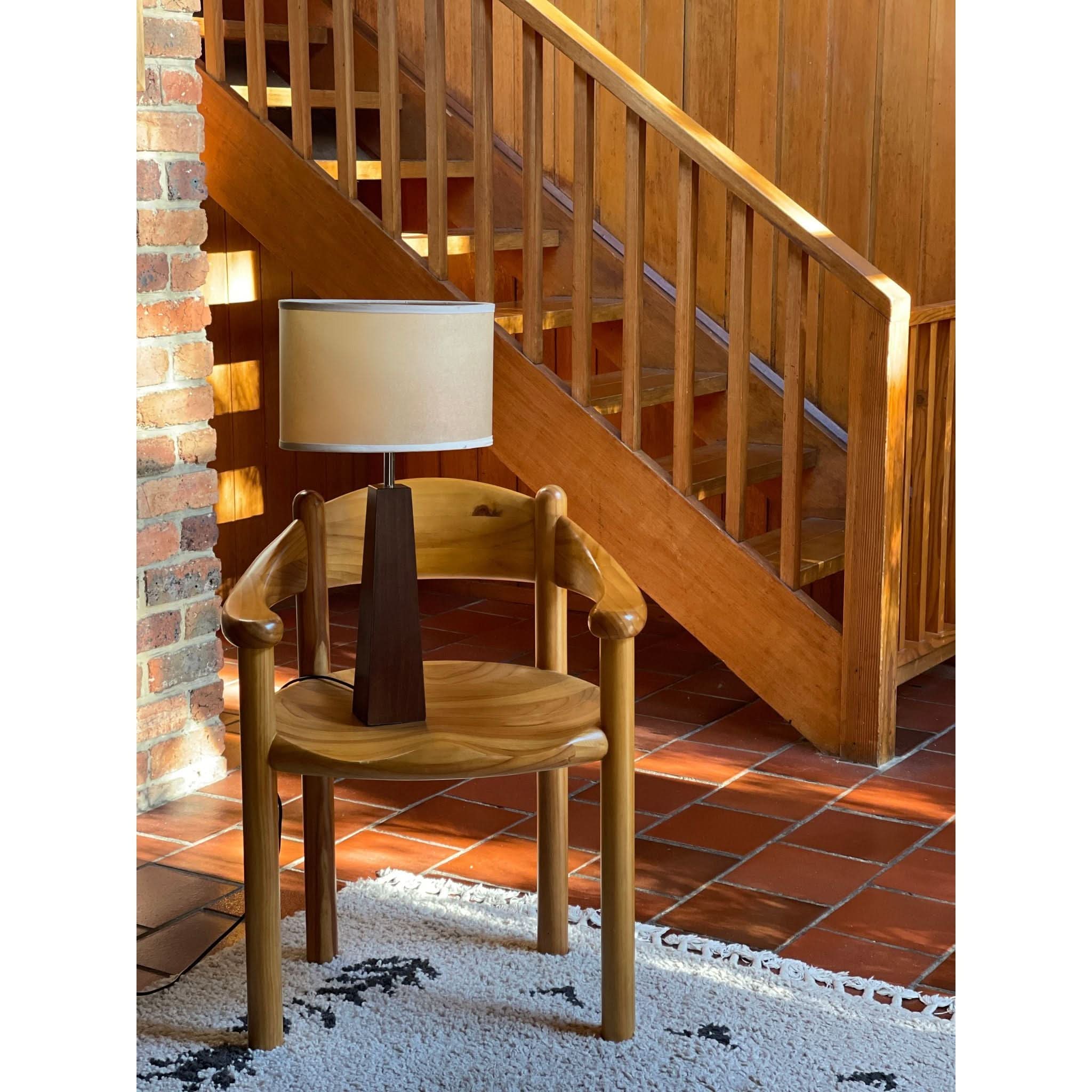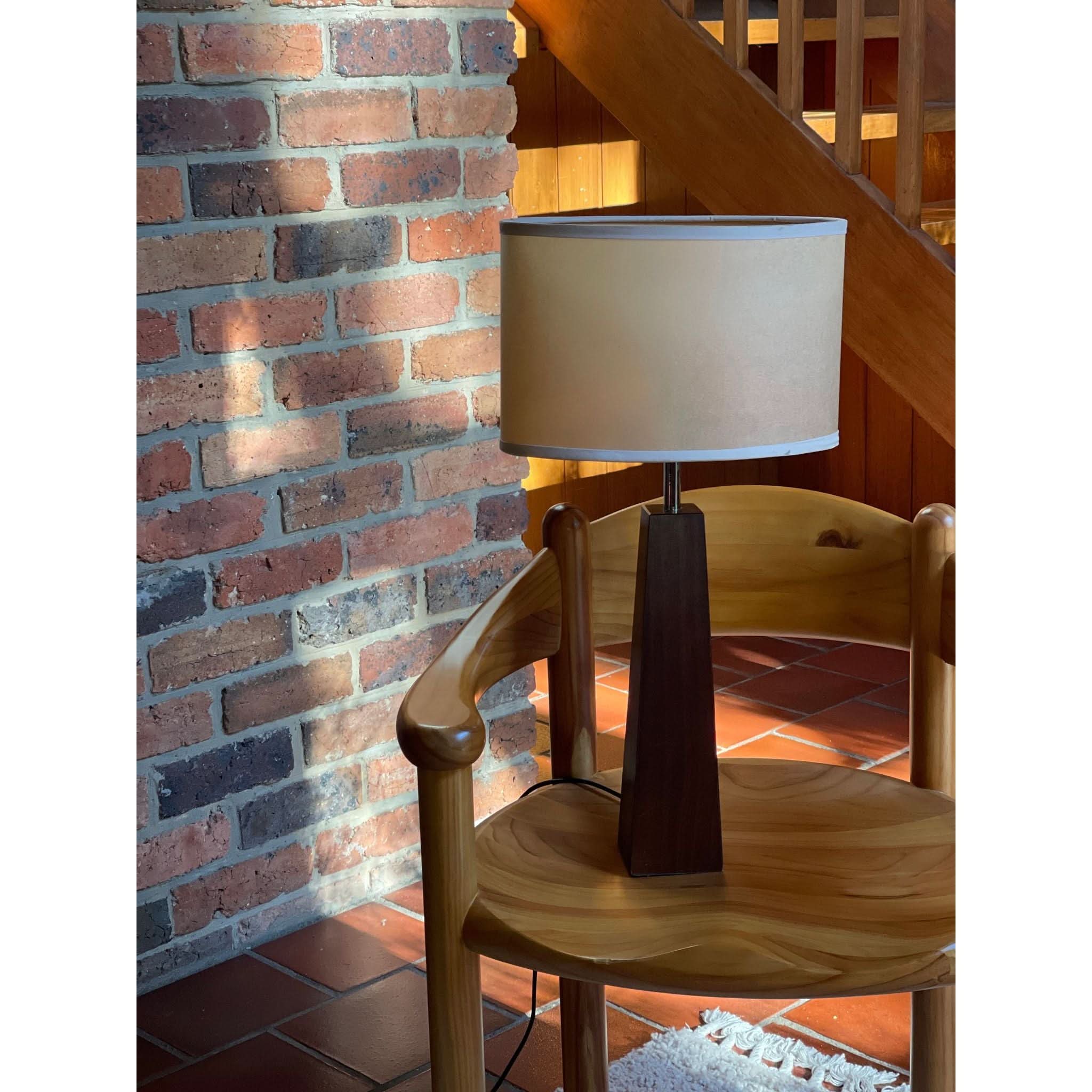 turned timber base and shade both in good vintage condition. there are some small marks to the shade and one to the timber base as photographed, however it presents beautifully. lamp is in good working order.