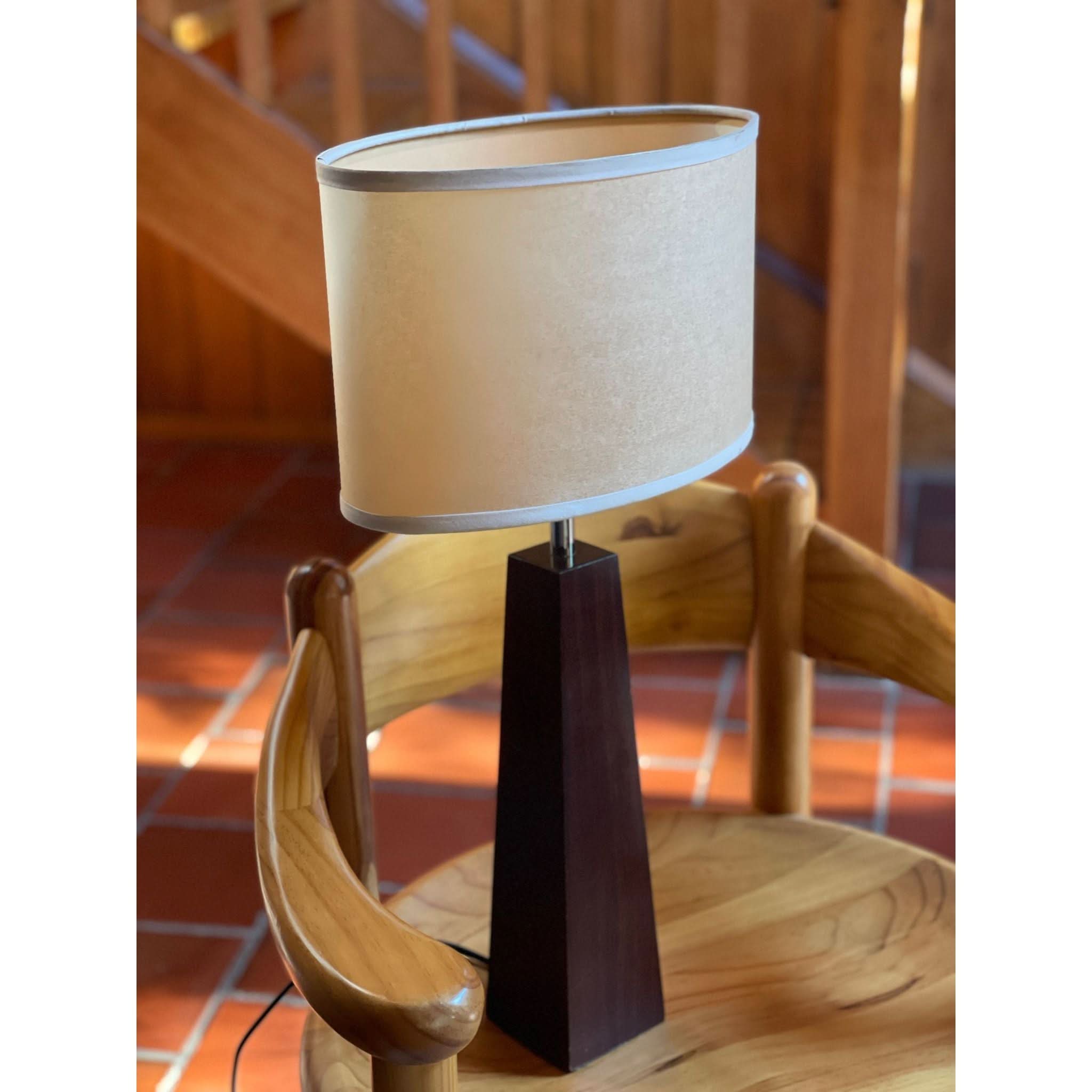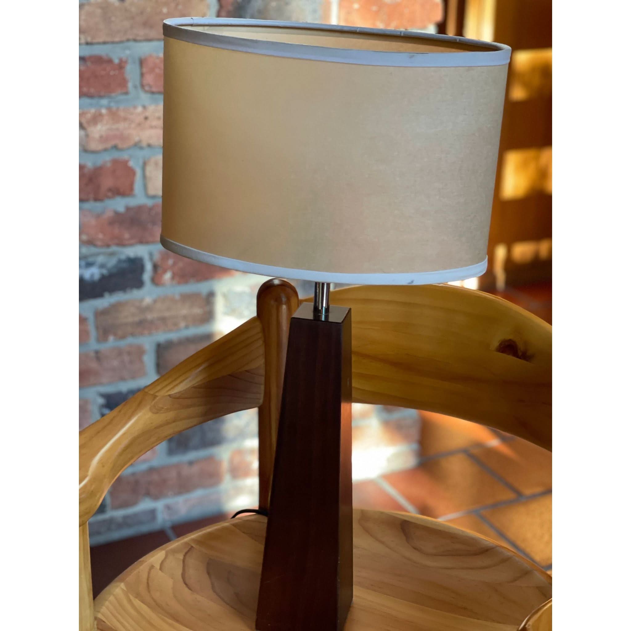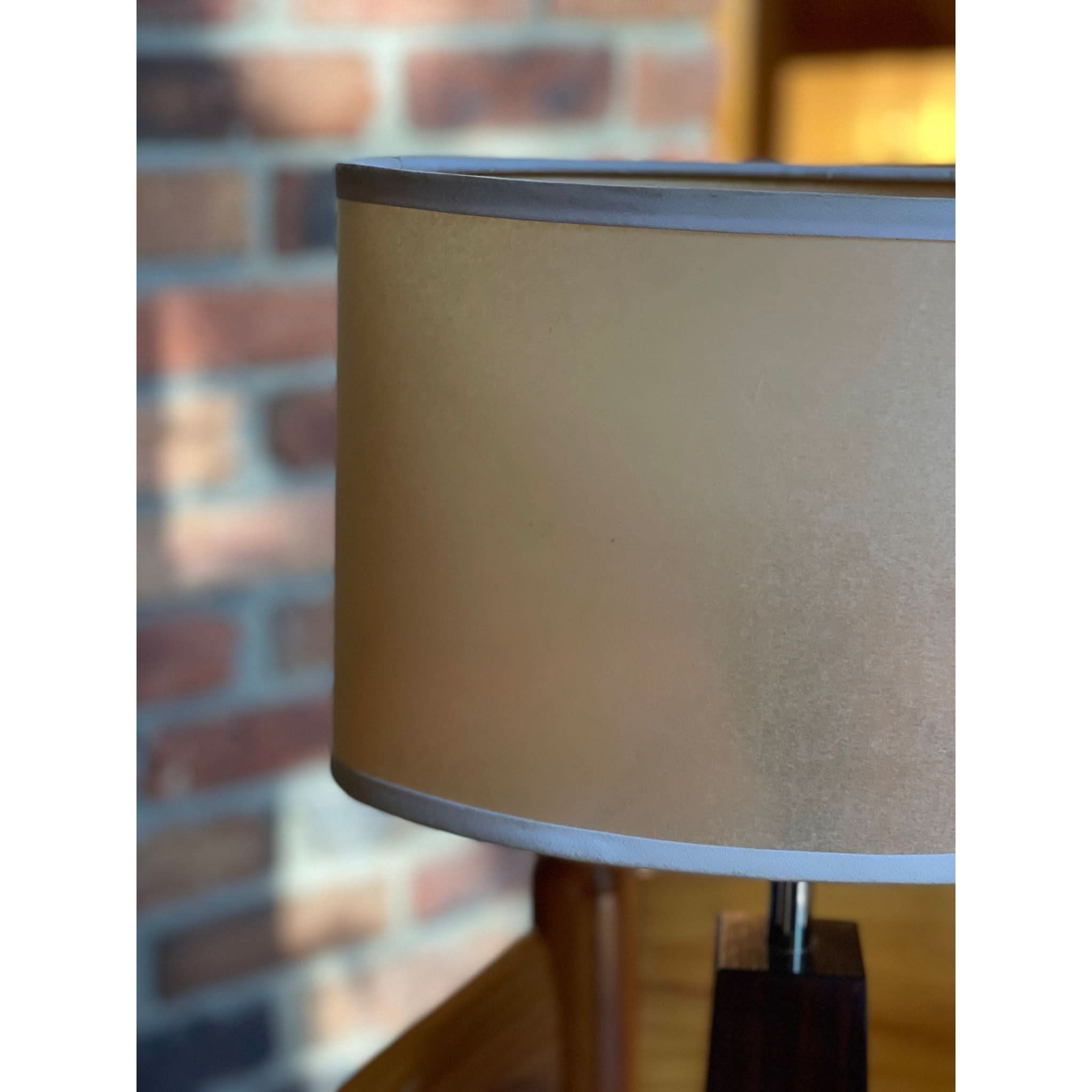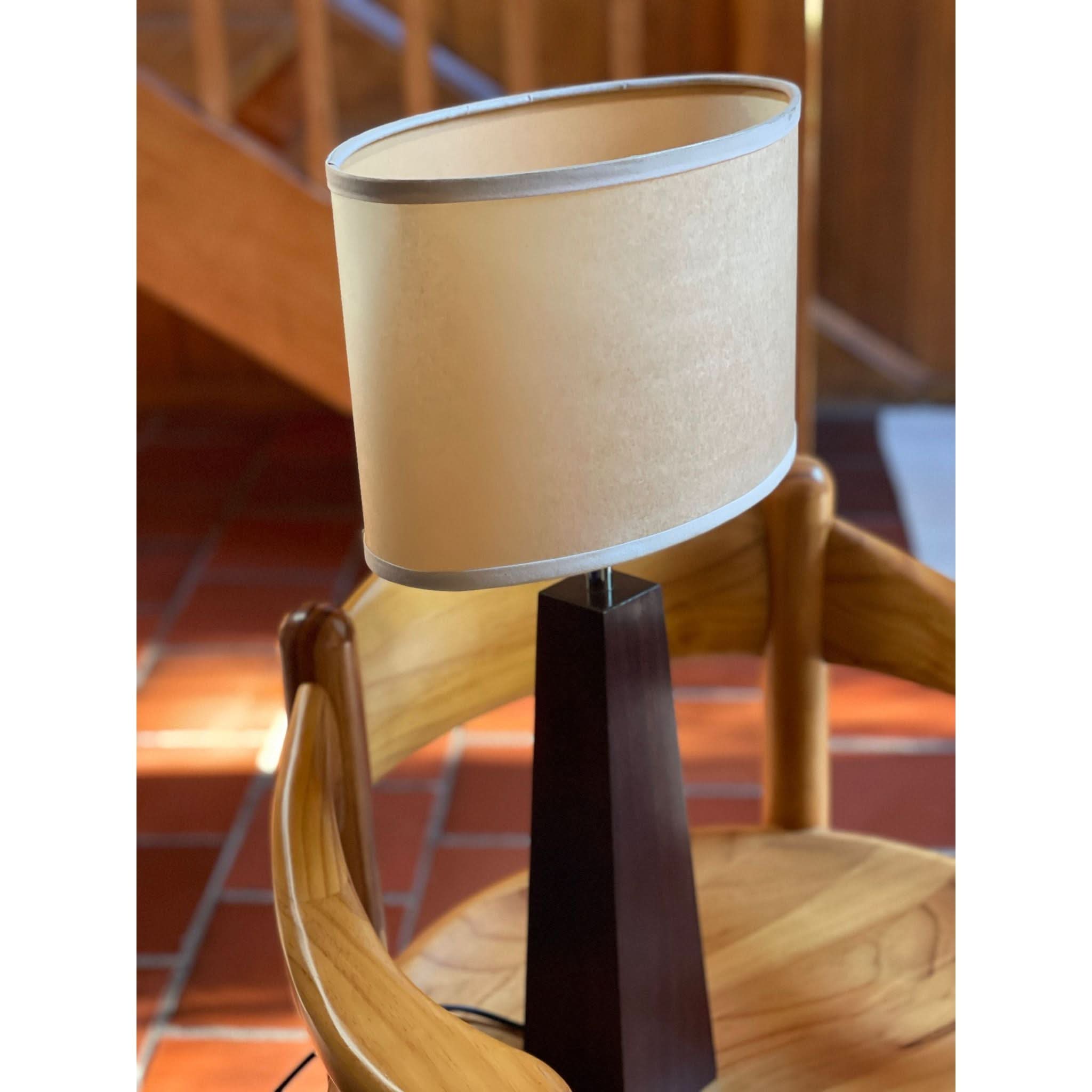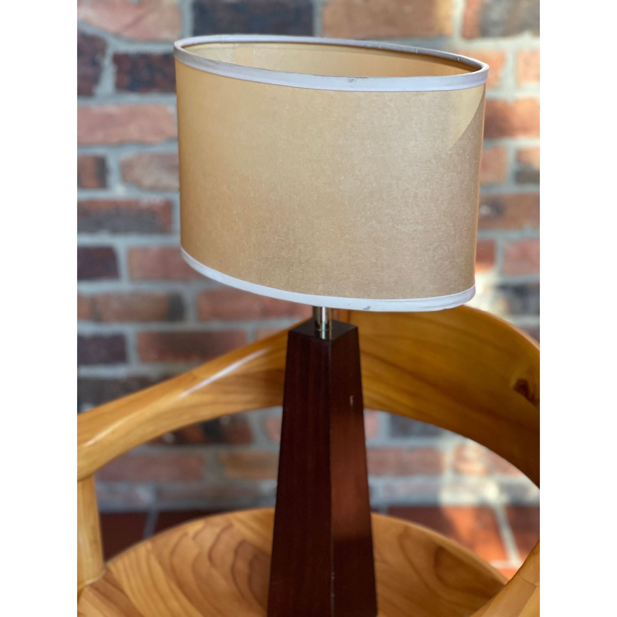 turned timber base and shade both in good vintage condition. there are some small marks to the shade and one to the timber base as photographed, however it presents beautifully. lamp is in good working order.