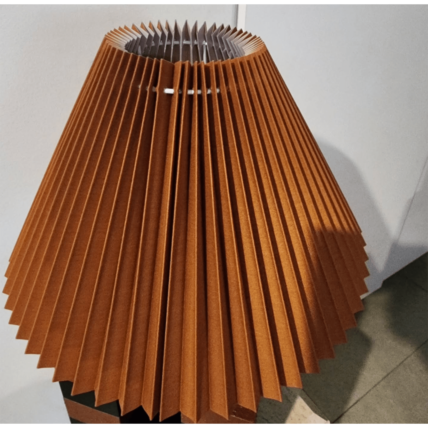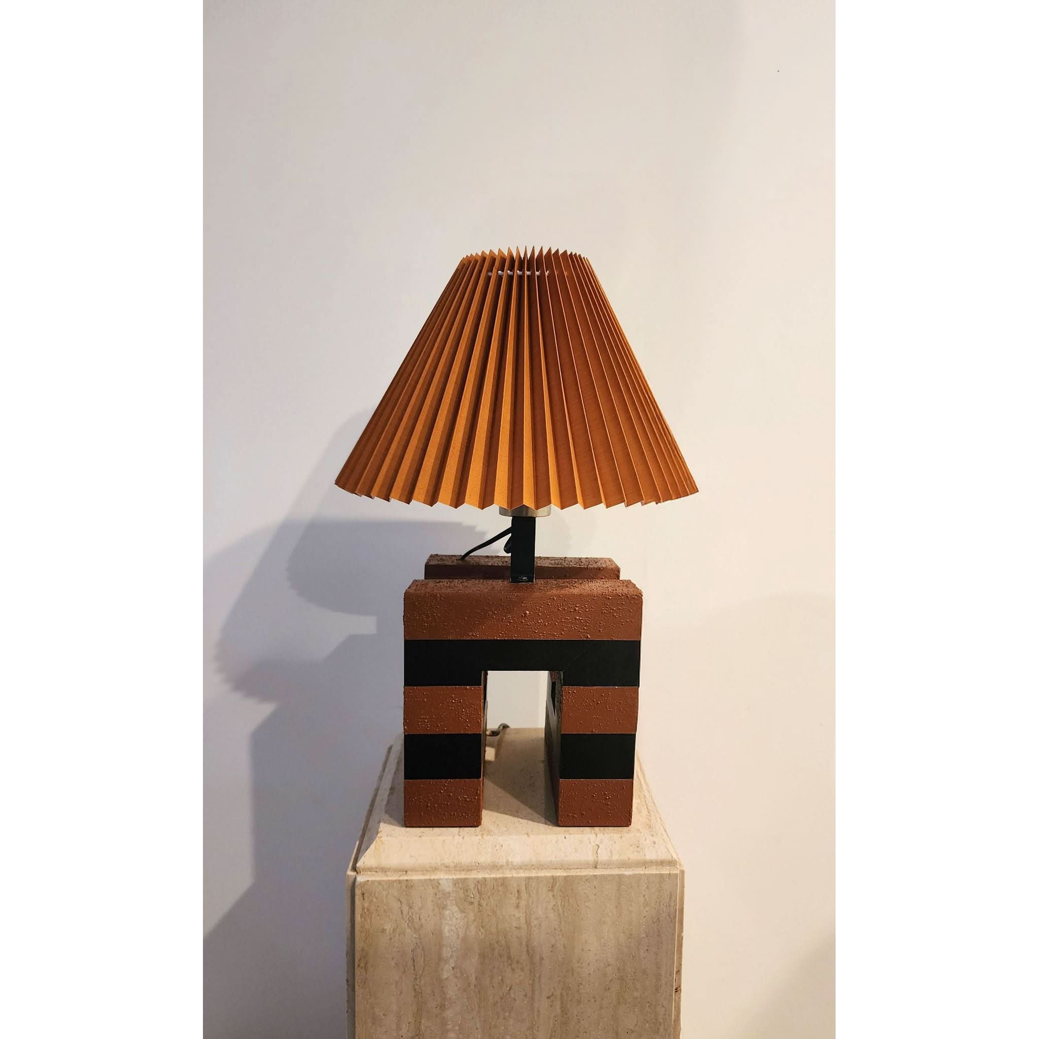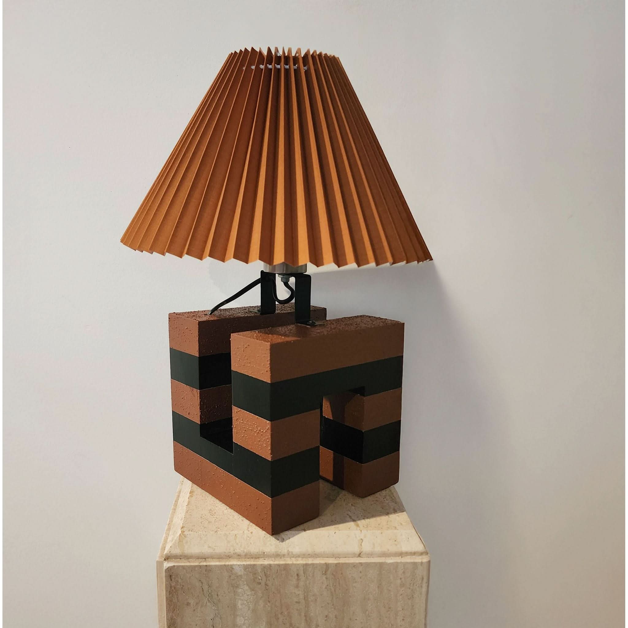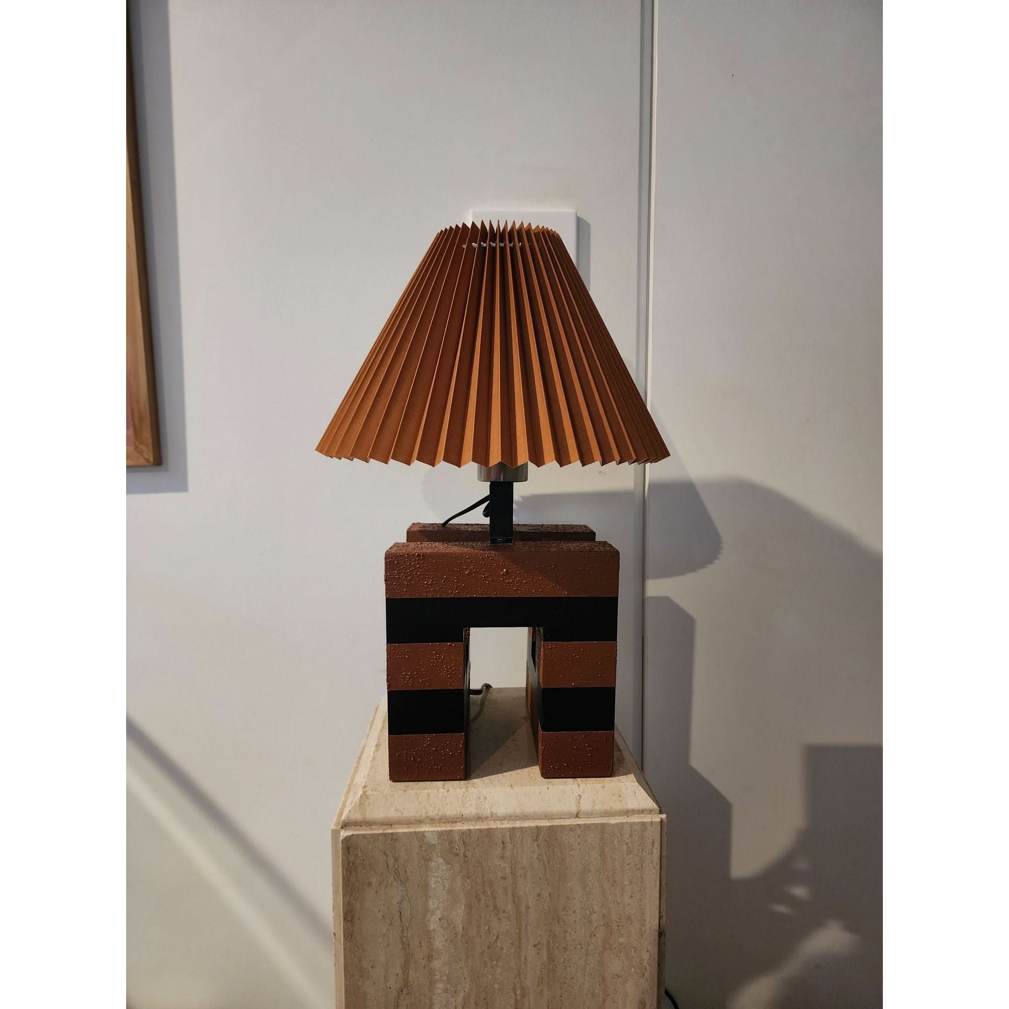 This upcycled wooden lamp base has been carefully handpainted with textured stripes. Lines are not perfect but that's part of the charm. Pleated lampshade is brand new.