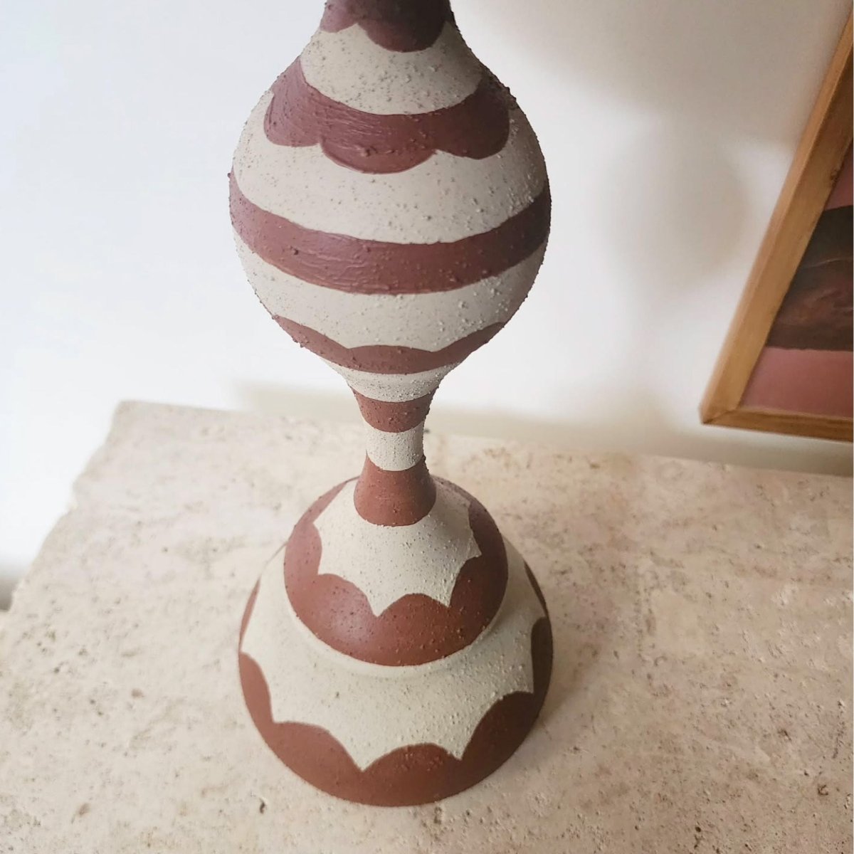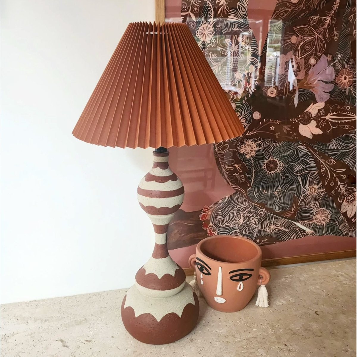Hand-painted, stone-look lamp featuring scallop and stripe detailing. Upcycled base paired with a new terracotta pleated shade.