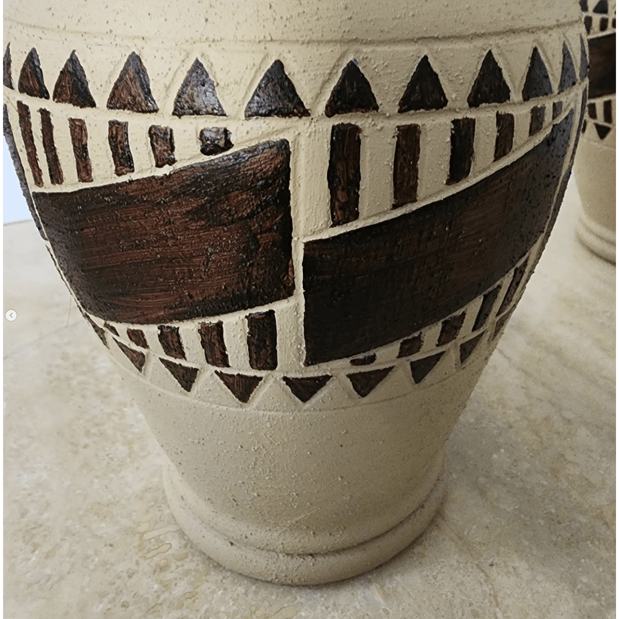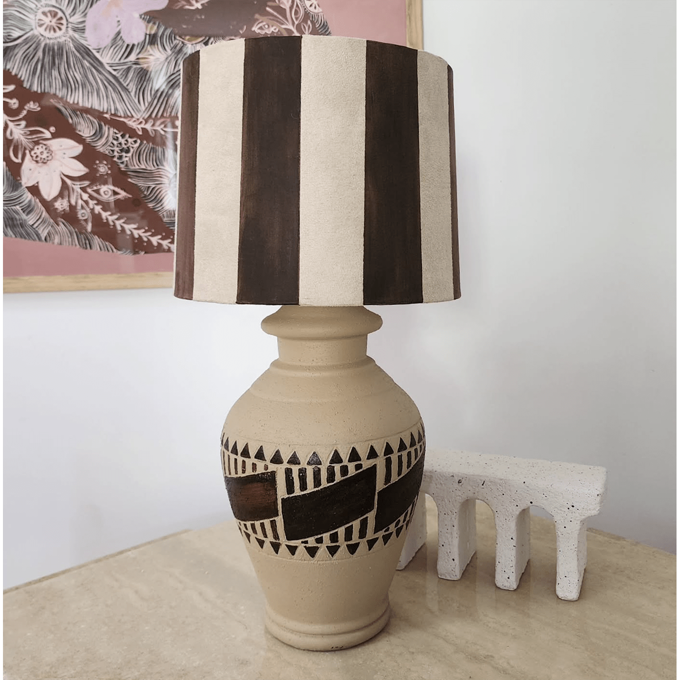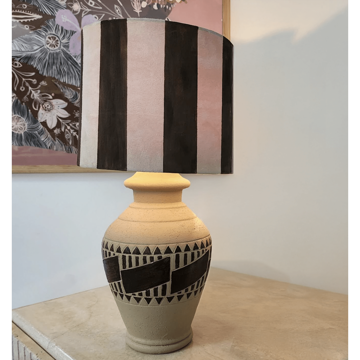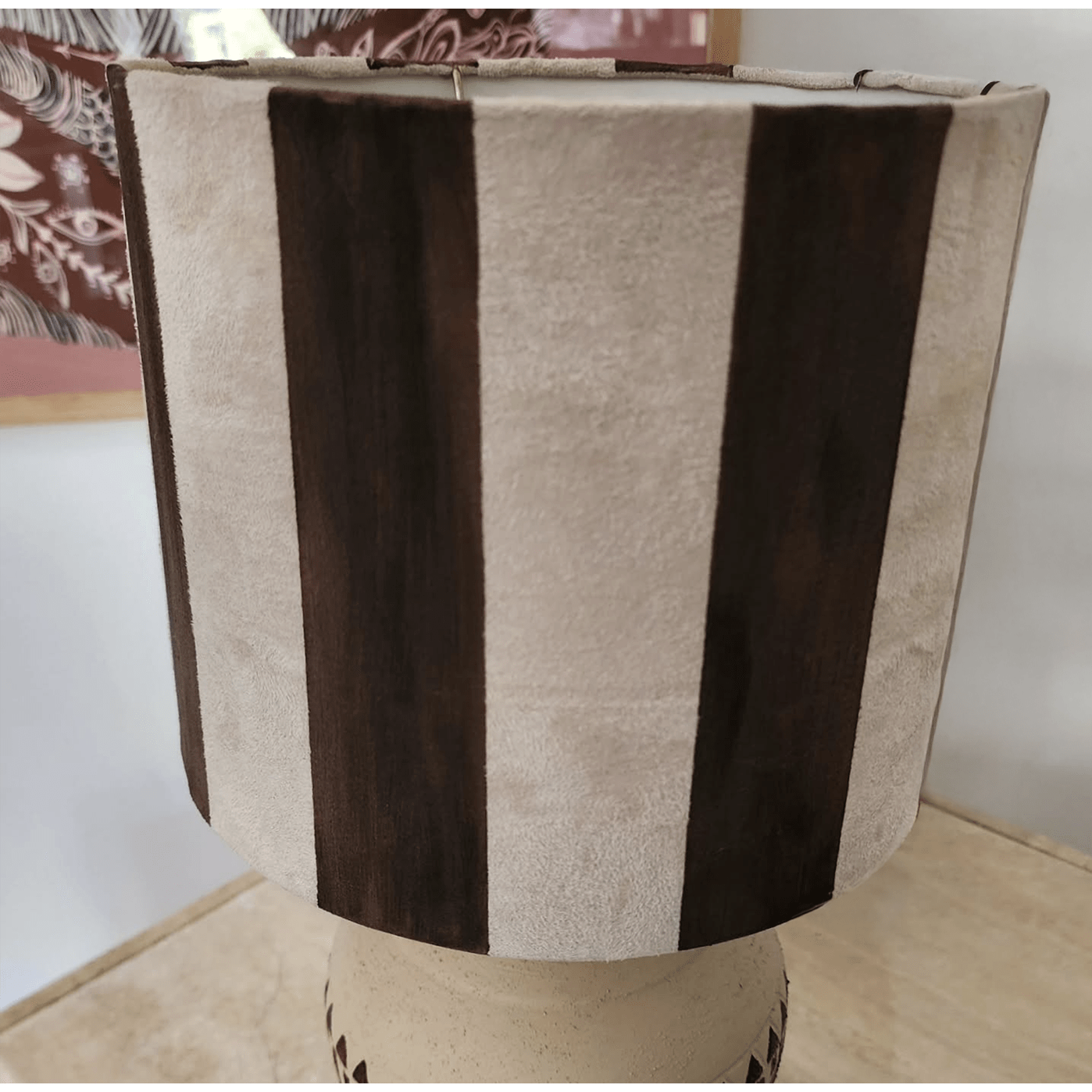 Vintage ceramic table lamp, beautifully upcycled with a stone-look finish and hand-painted details. Topped with a suede lampshade, also hand-painted with striking stripes.