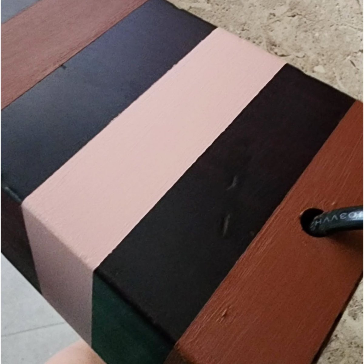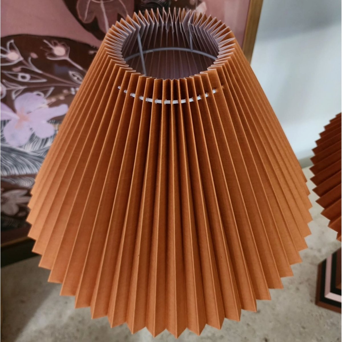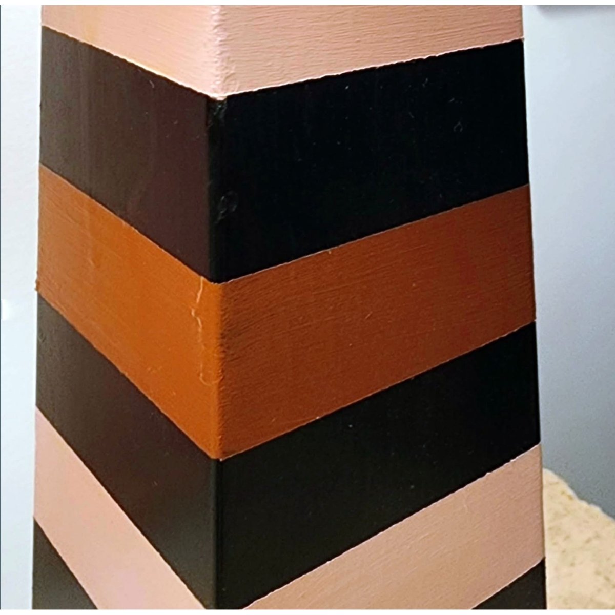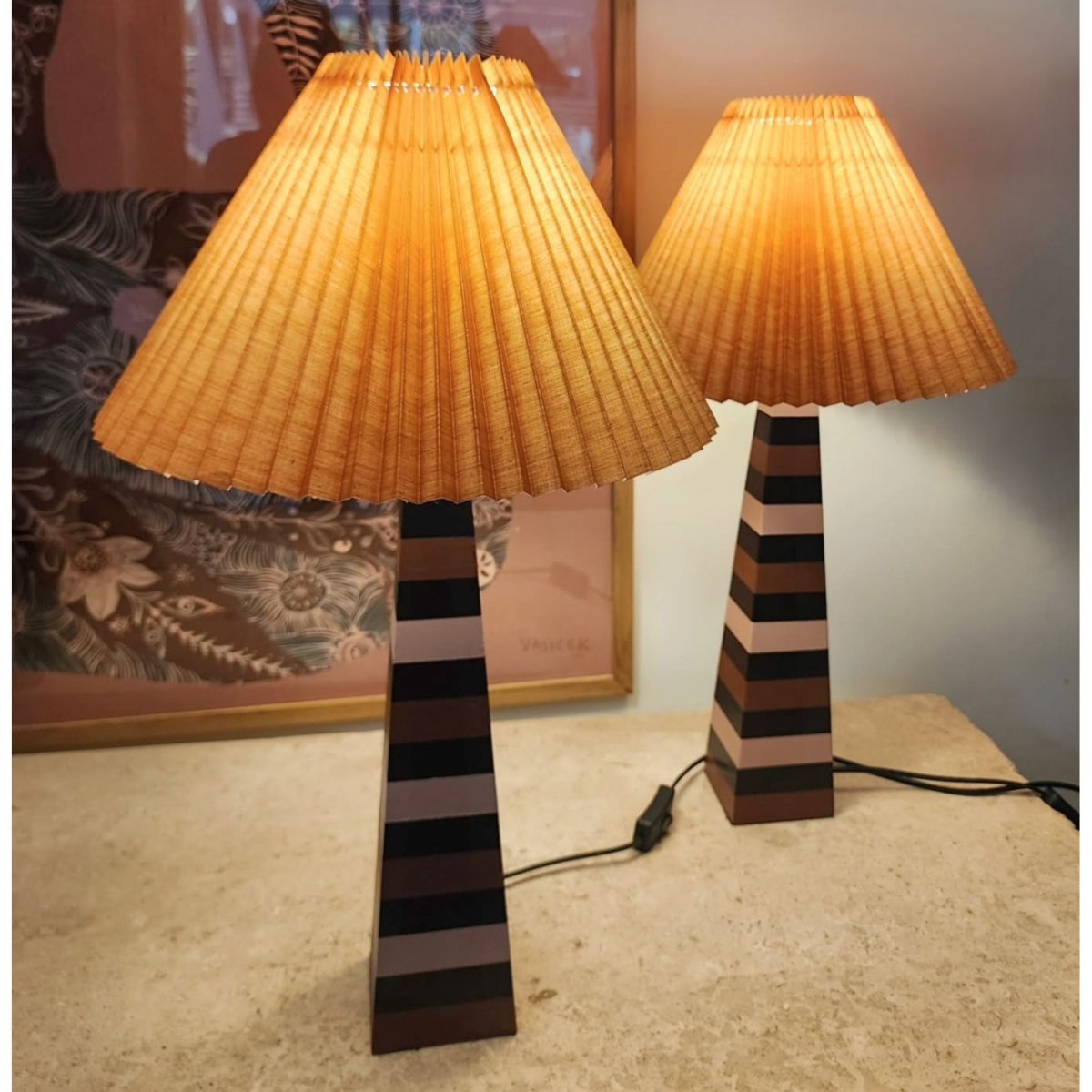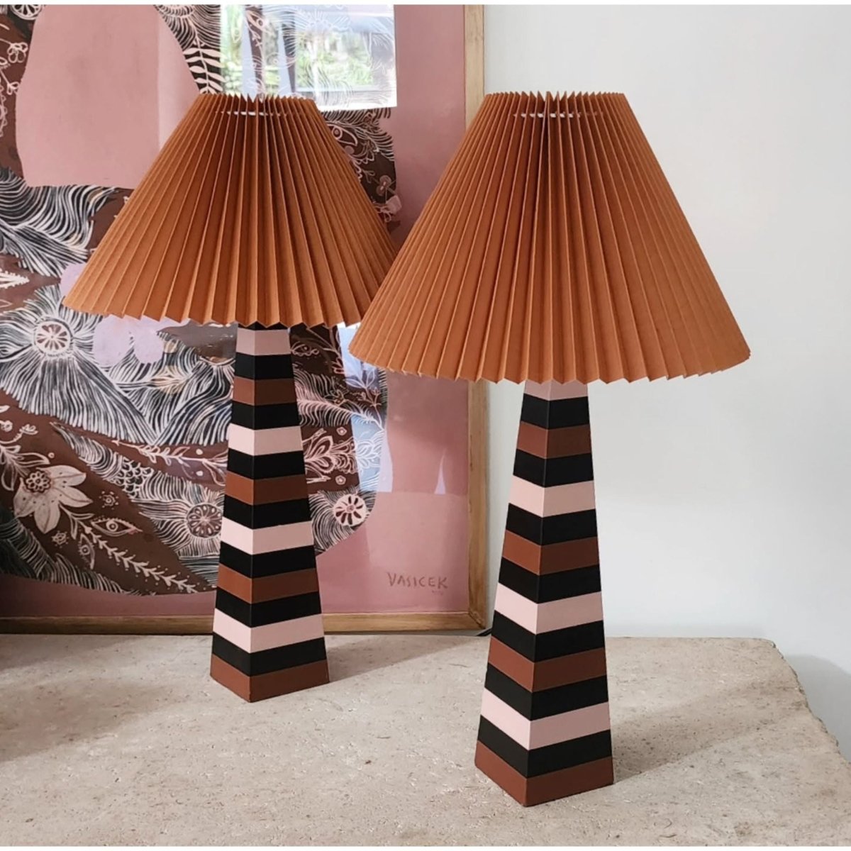 Upcycled table lamp with a vintage wooden base, hand-painted in soft blush pink and warm terracotta stripes. Finished with a new pleated shade for a sculptural, mid-century feel. A small section of the cable has a minor break, which has been safely covered.