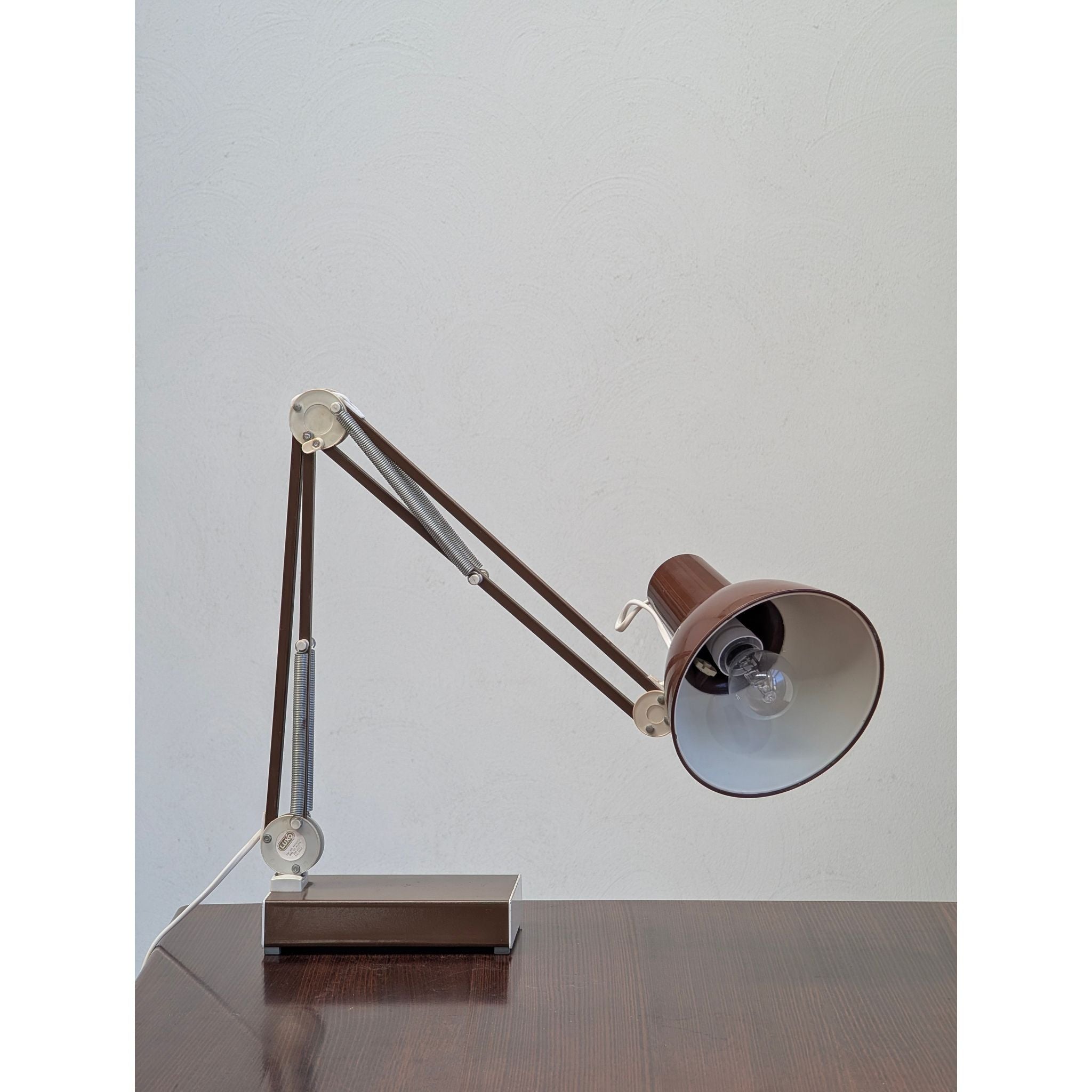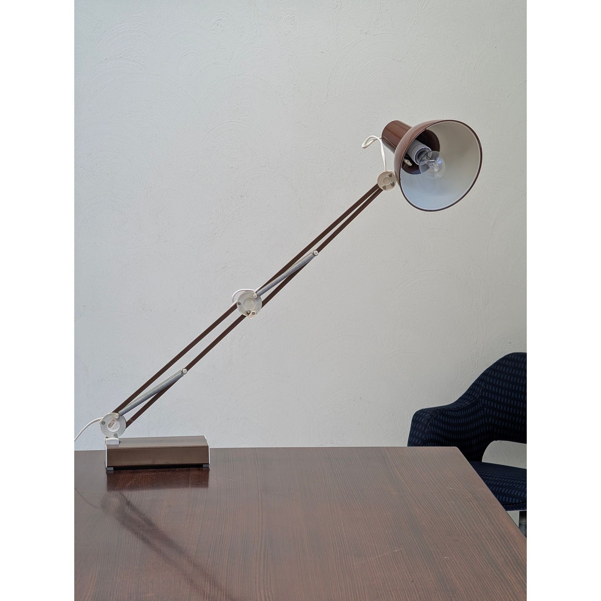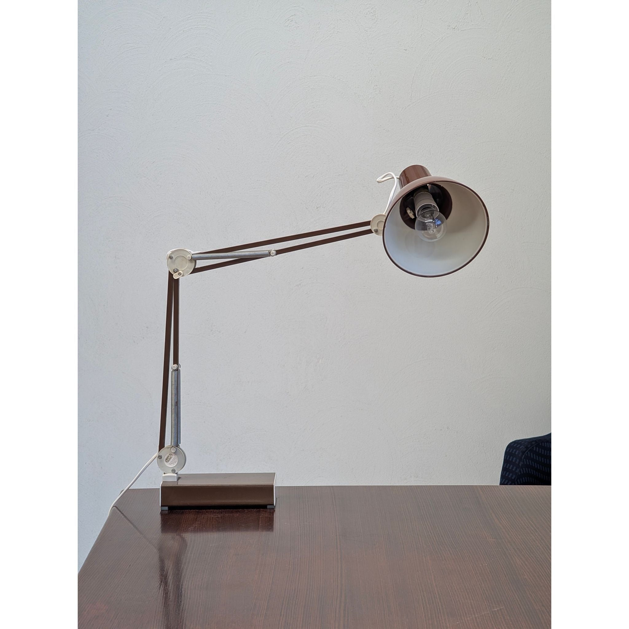 This c.1970s example features the original vintage chocolate brown finish, beautifully contrasted by chrome springs and articulated joints. Beyond its impeccable function as a task lamp, the L-1 holds a unique place in popular culture as the famous inspiration for the beloved animated character from Pixar Animation Studios.