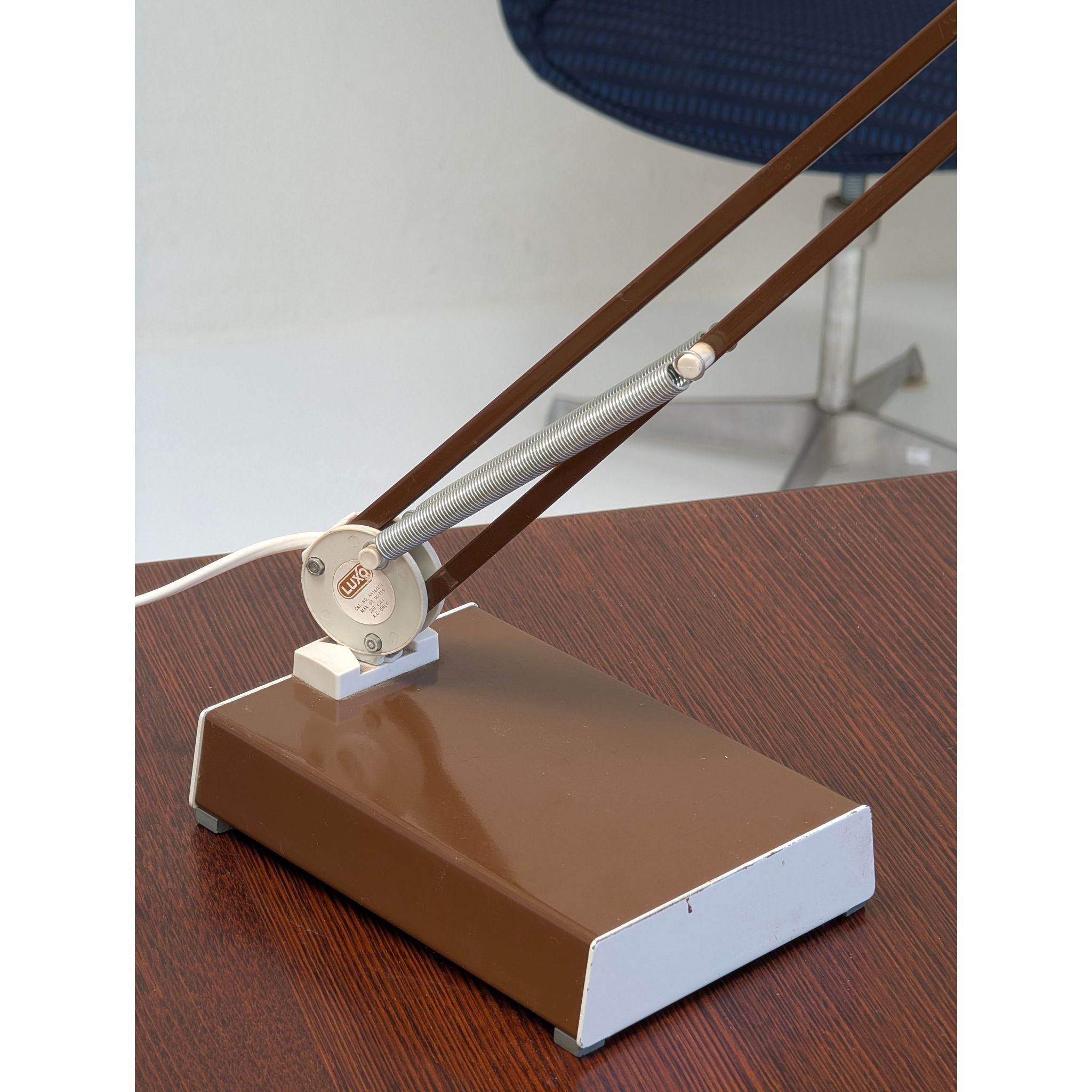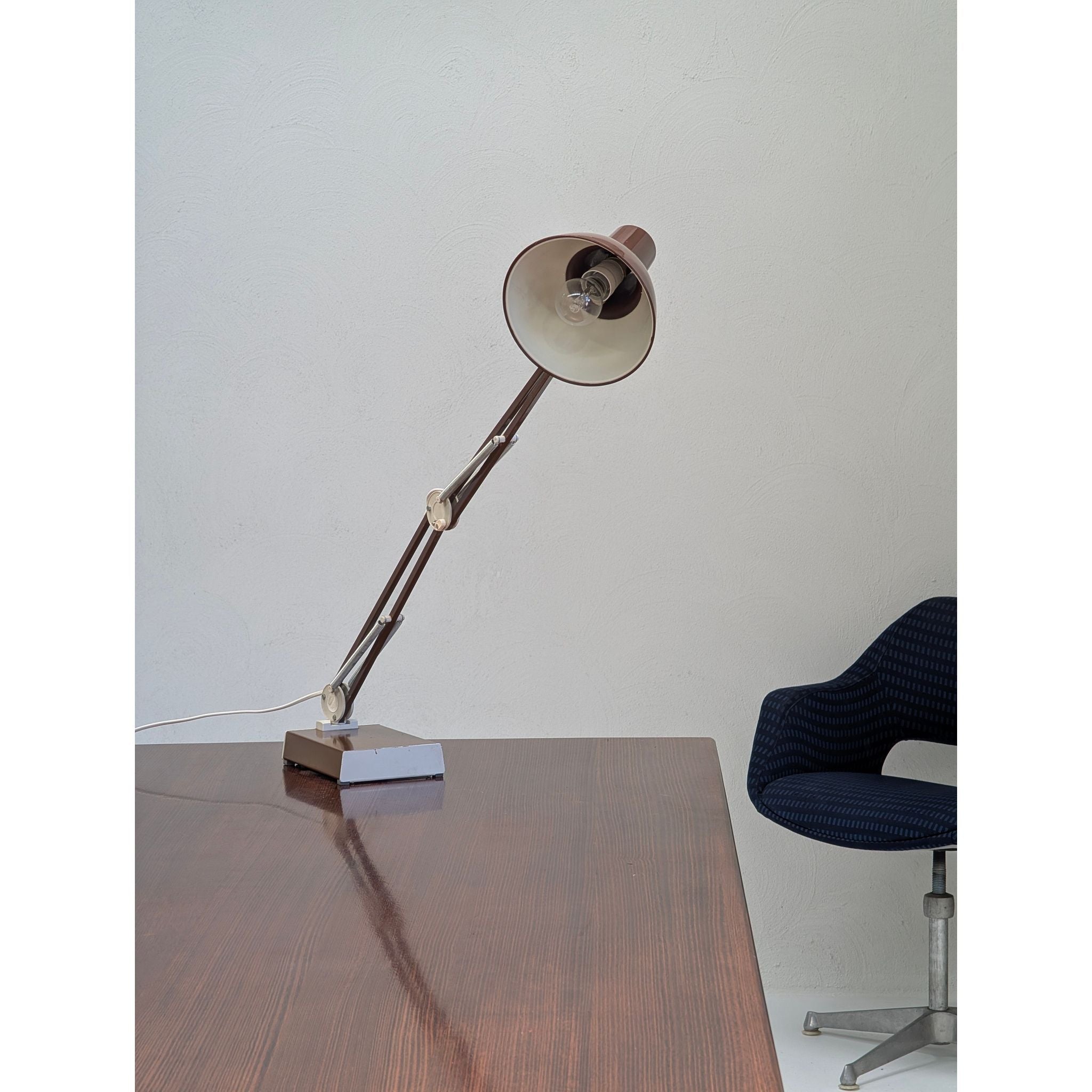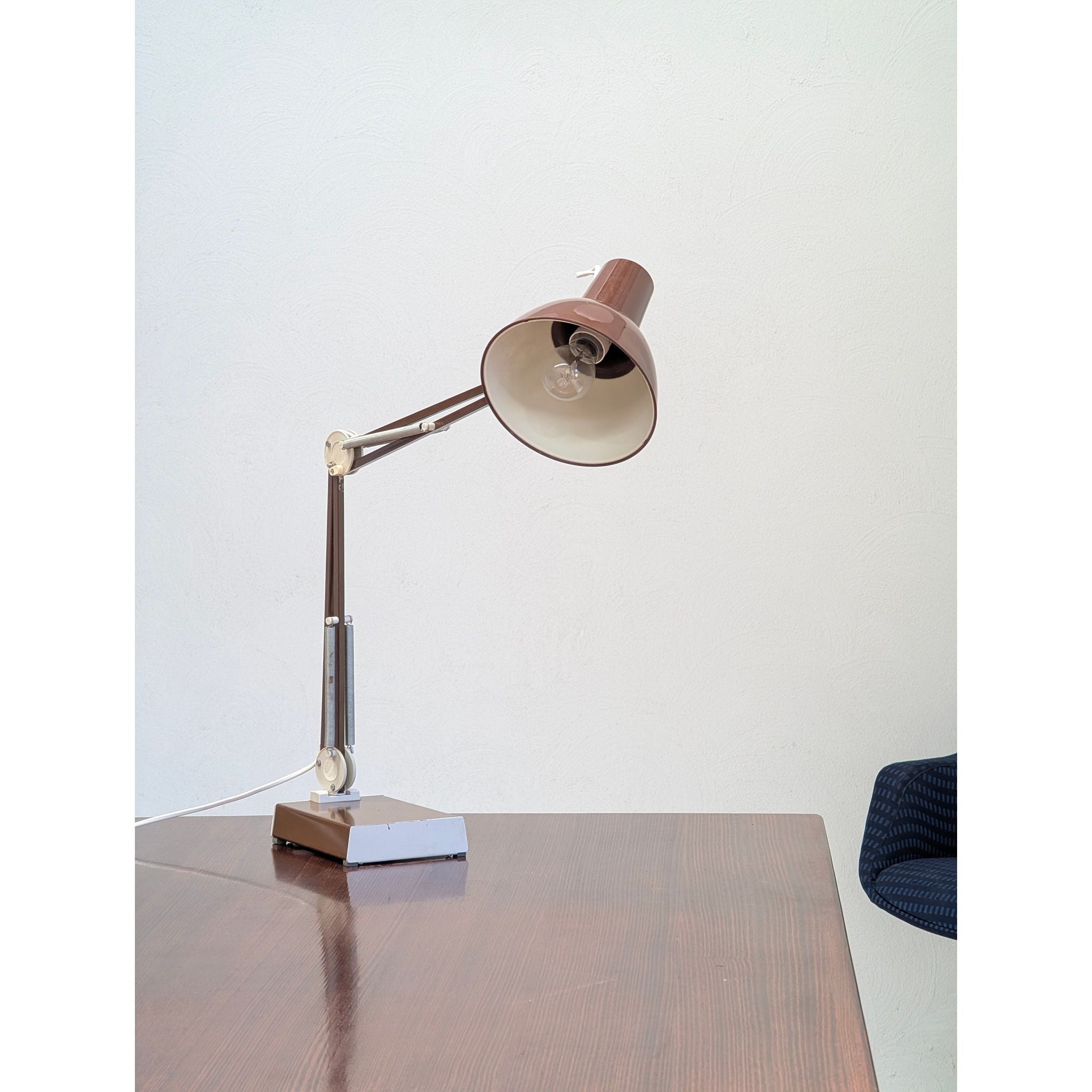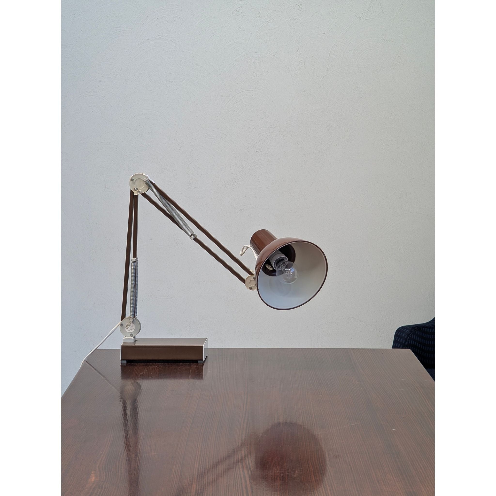 This c.1970s example features the original vintage chocolate brown finish, beautifully contrasted by chrome springs and articulated joints. Beyond its impeccable function as a task lamp, the L-1 holds a unique place in popular culture as the famous inspiration for the beloved animated character from Pixar Animation Studios.