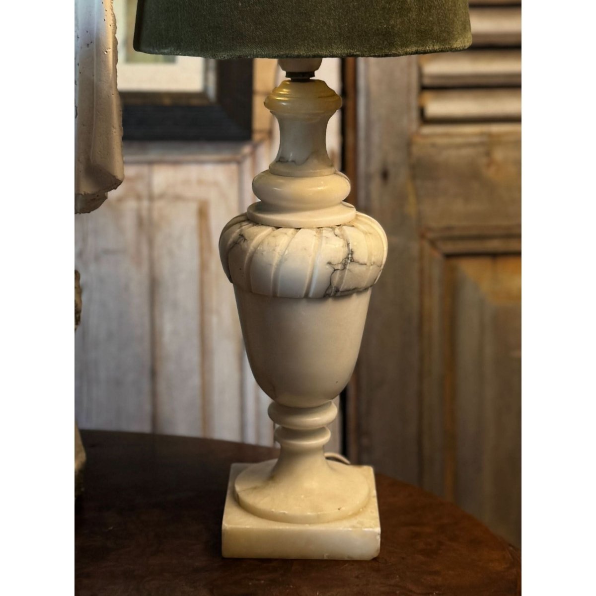 Beautiful vintage carved Carrara marble table lamp with olive green velvet shade. Marble base has "Italy" inscribed in base. Some signs of wear, as expected with age.