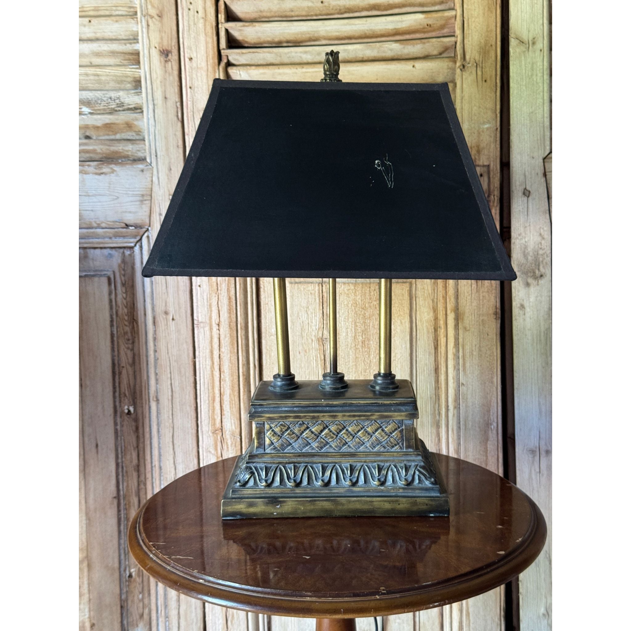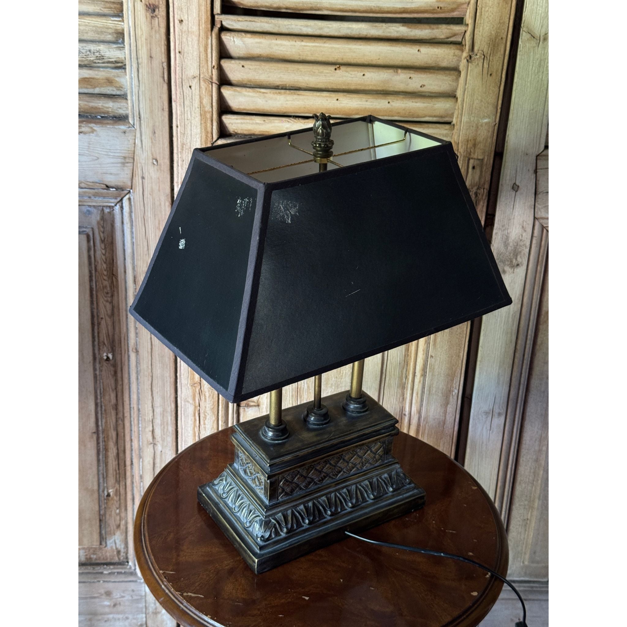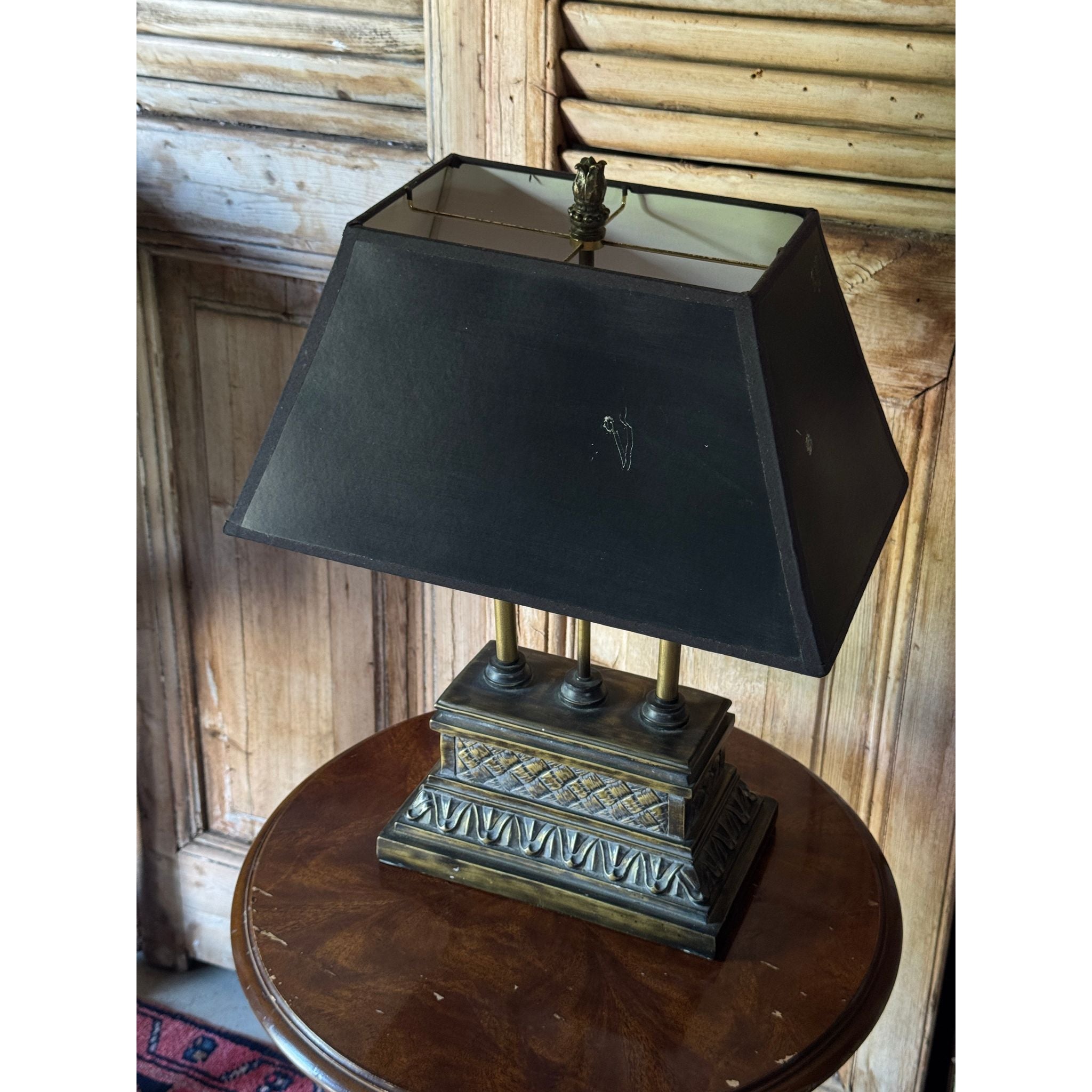 A decorative vintage table lamp with classical column detail and stepped plinth base in an aged bronze tone. A versatile piece suitable for bedside, console or occasional table styling. Comes with a black tapered shade.