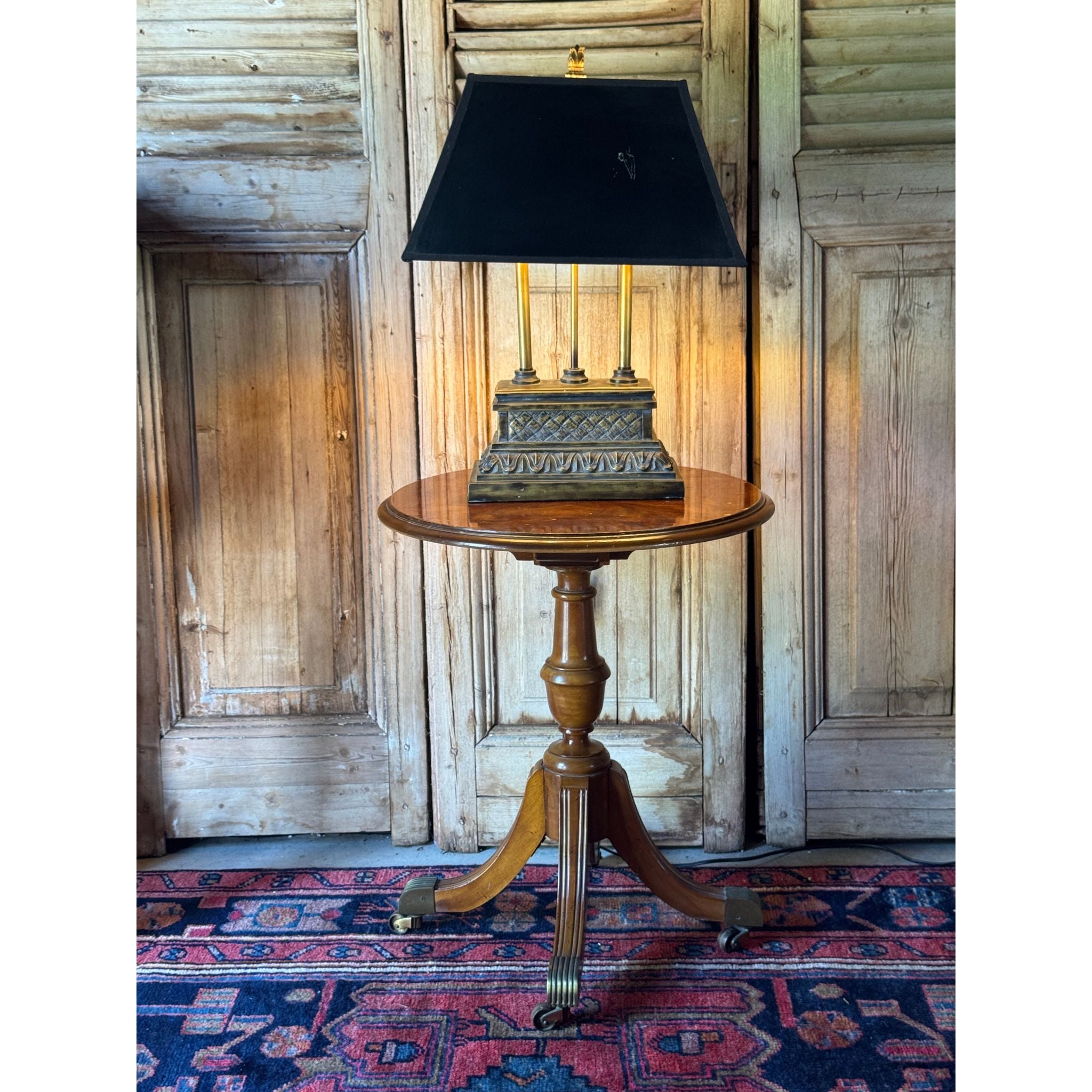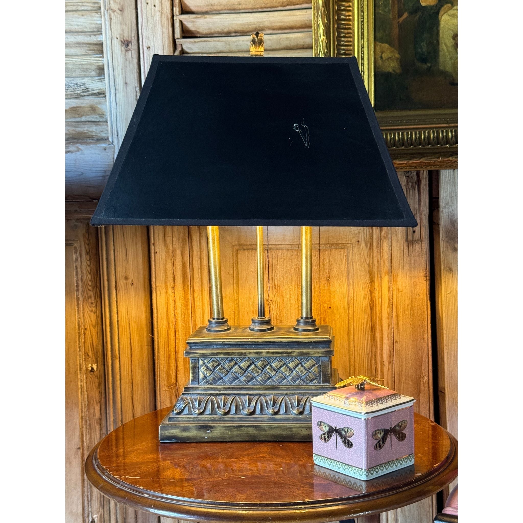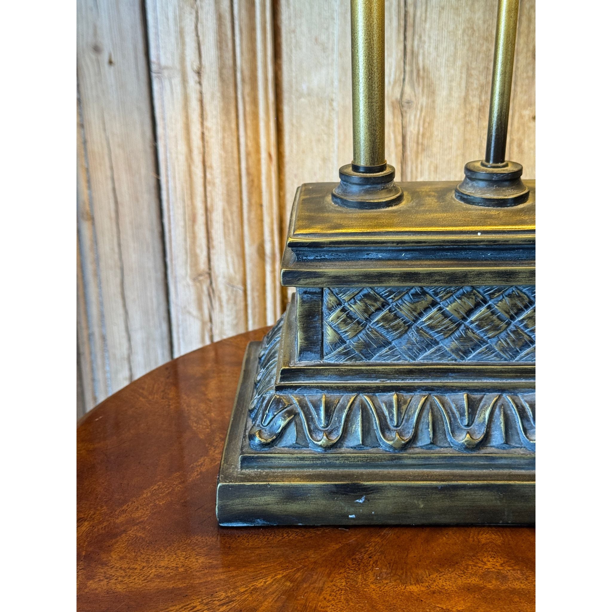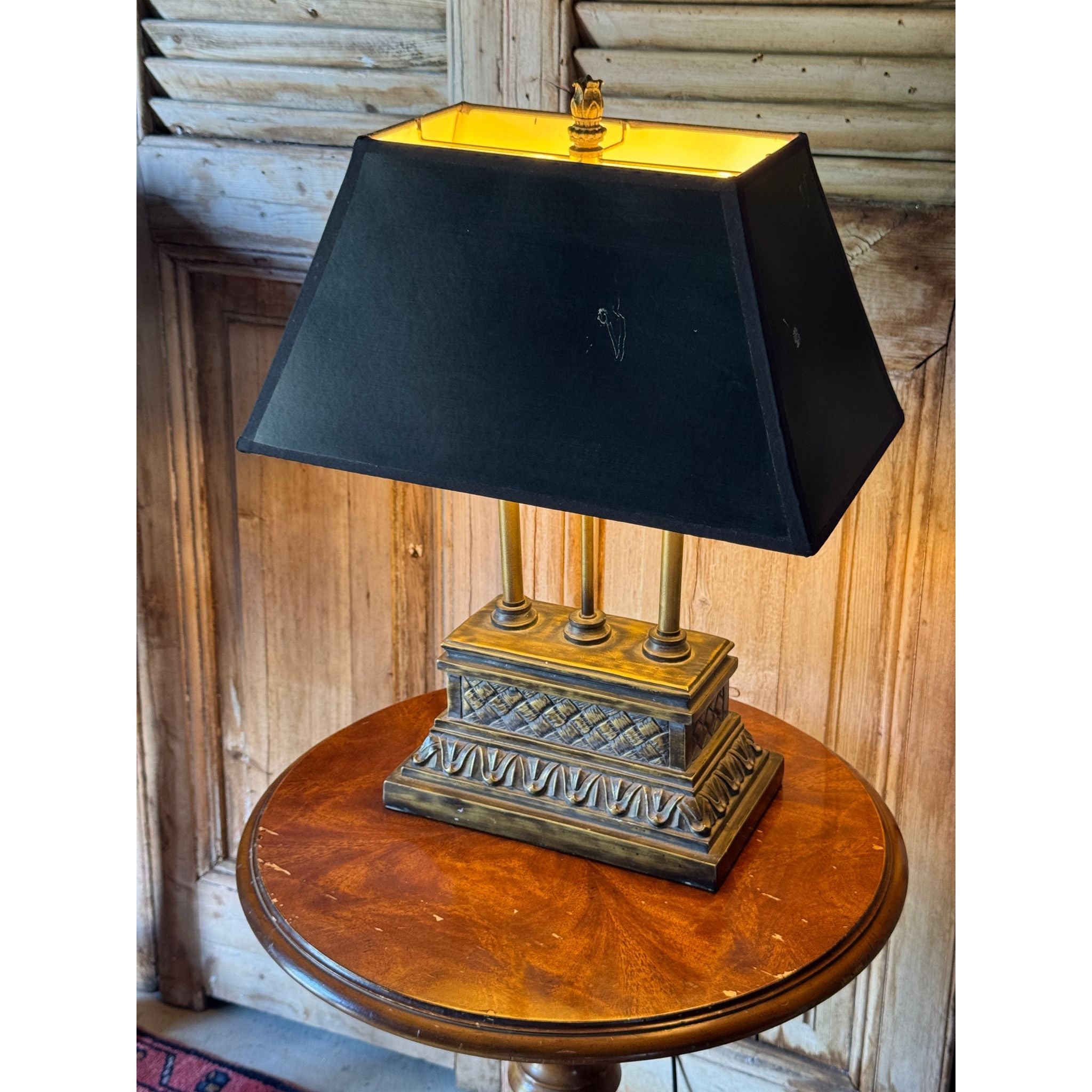 A decorative vintage table lamp with classical column detail and stepped plinth base in an aged bronze tone. A versatile piece suitable for bedside, console or occasional table styling. Comes with a black tapered shade.