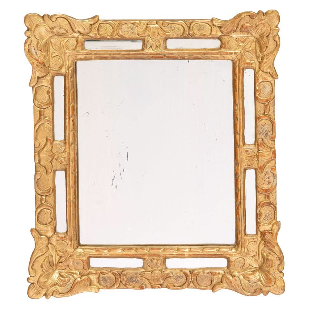 Carved wood, decorated with leaves and blossoms, the gilt burnished throughout and slight foxing to the mirror plate