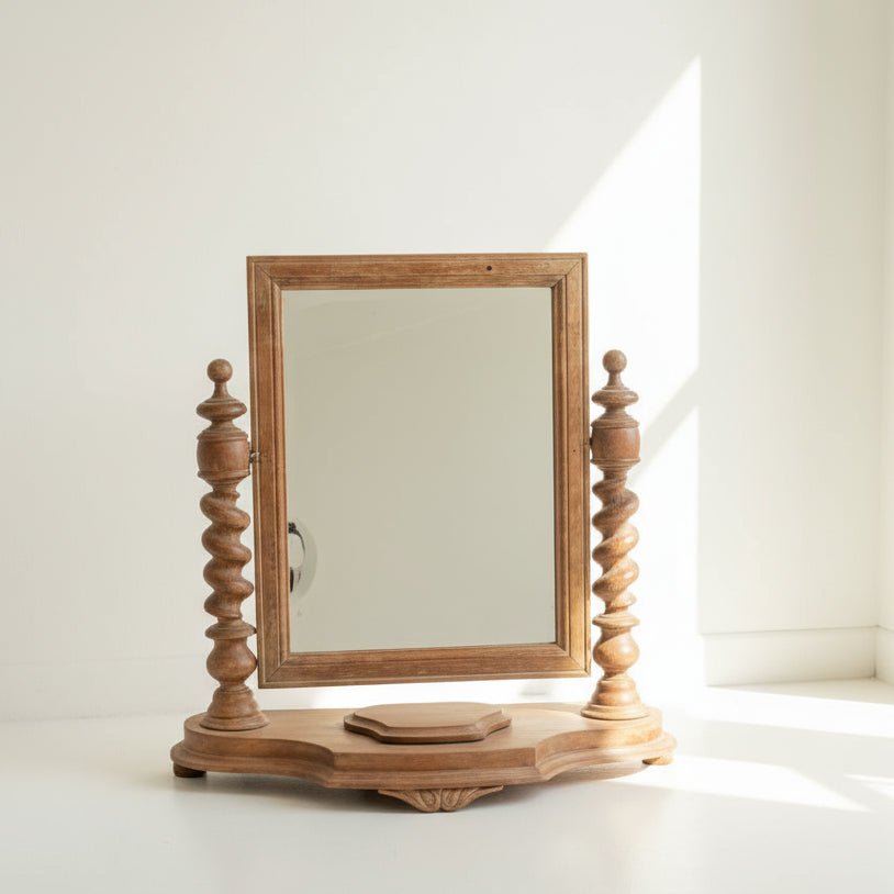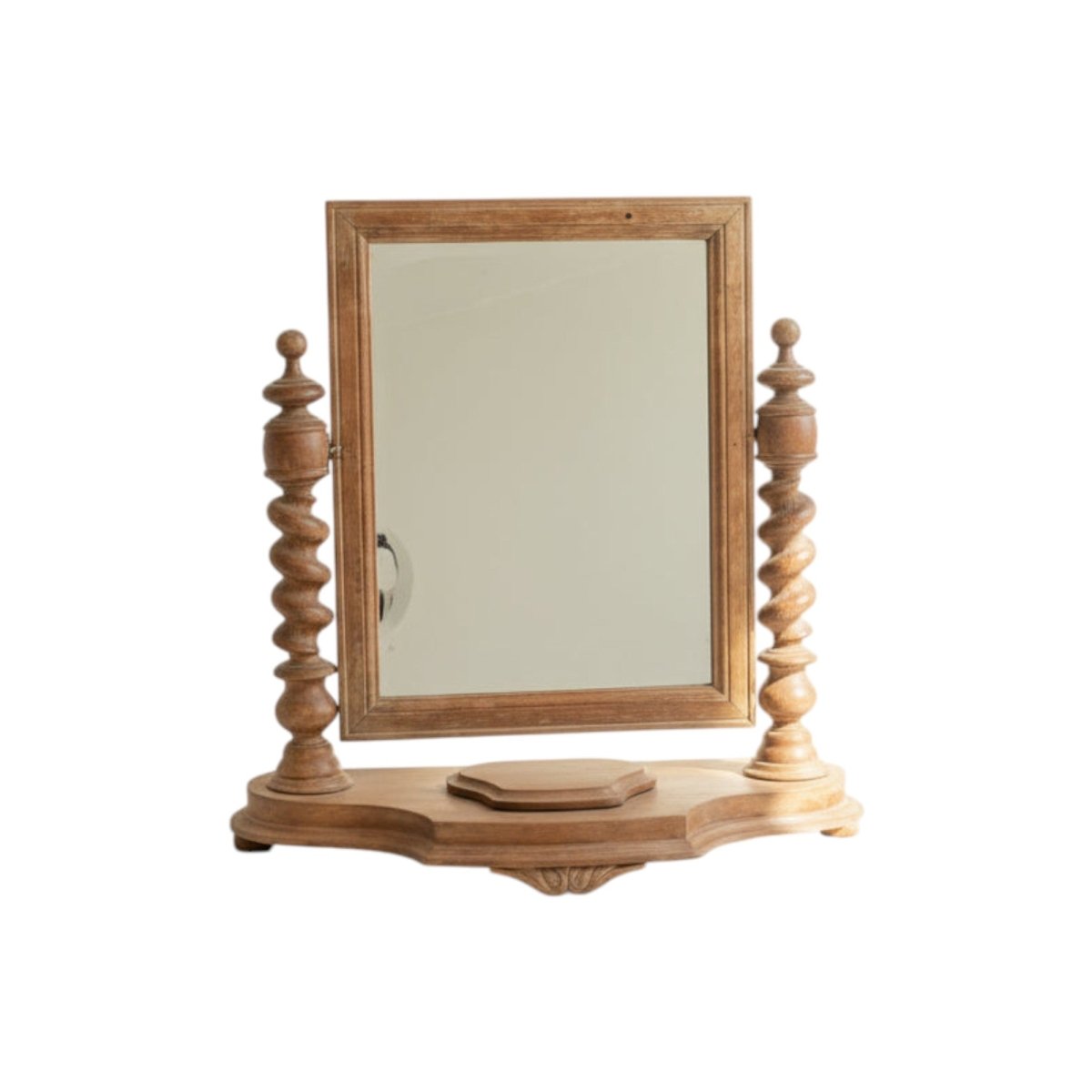 This vintage dressing table mirror, crafted by hand from teak wood and featuring barley twist supports, is 80 to 90 years old and full of character. Its base includes a gently curved shelf with a small raised platform, ideal for displaying trinkets, candles, or keepsakes. Perfect for adding a touch of history and practicality to an entryway, bedroom, or hallway, this mirror makes a charming and functional décor addition.