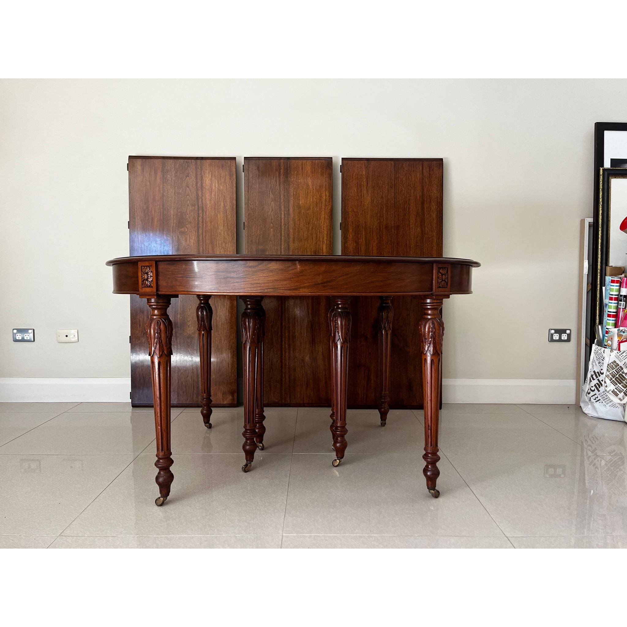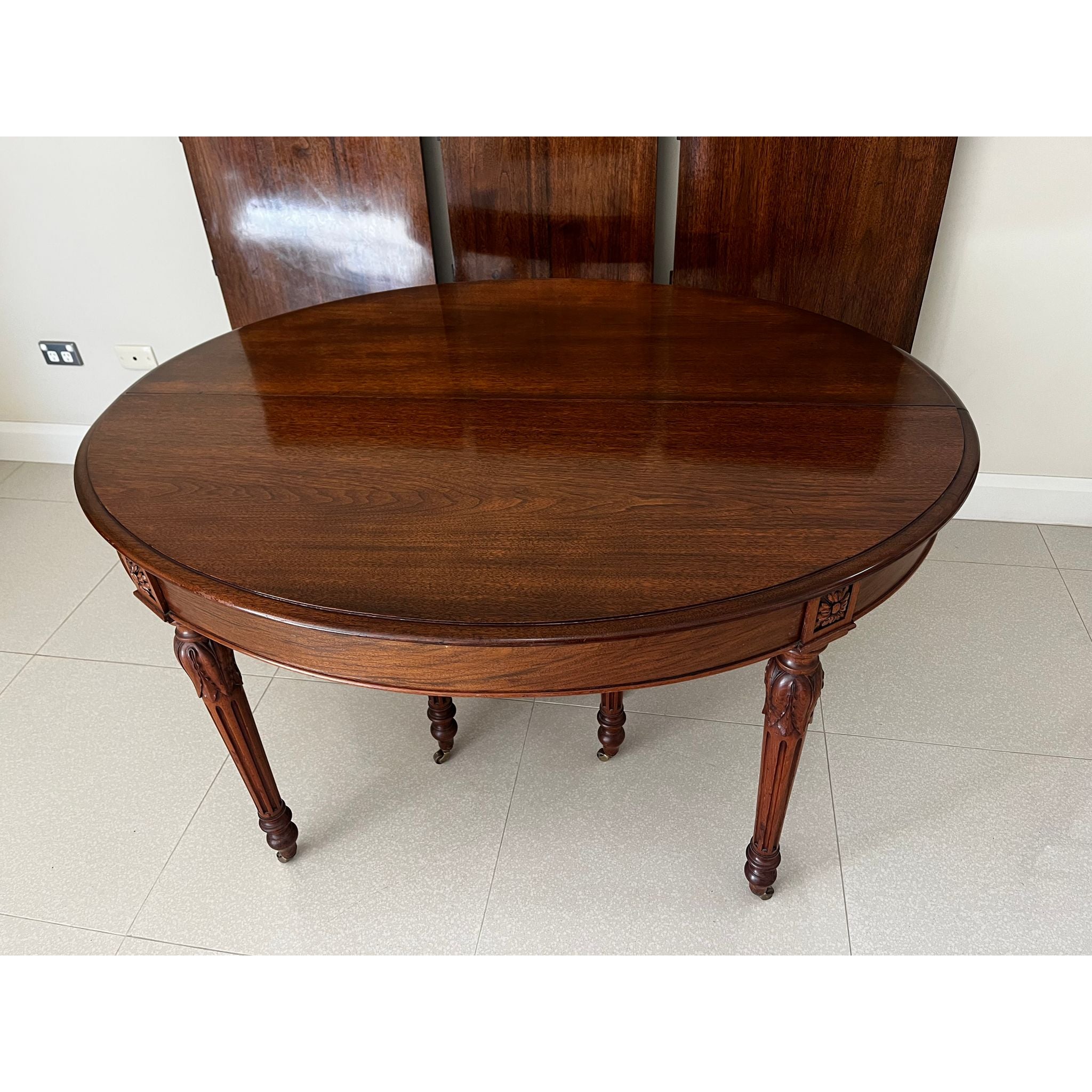 19th Century Oval French Walnut extendable dining table with three removable and numbered interlocking sections. Can be reduced to smaller oval table by removing two sections or a round table by removing all three sections