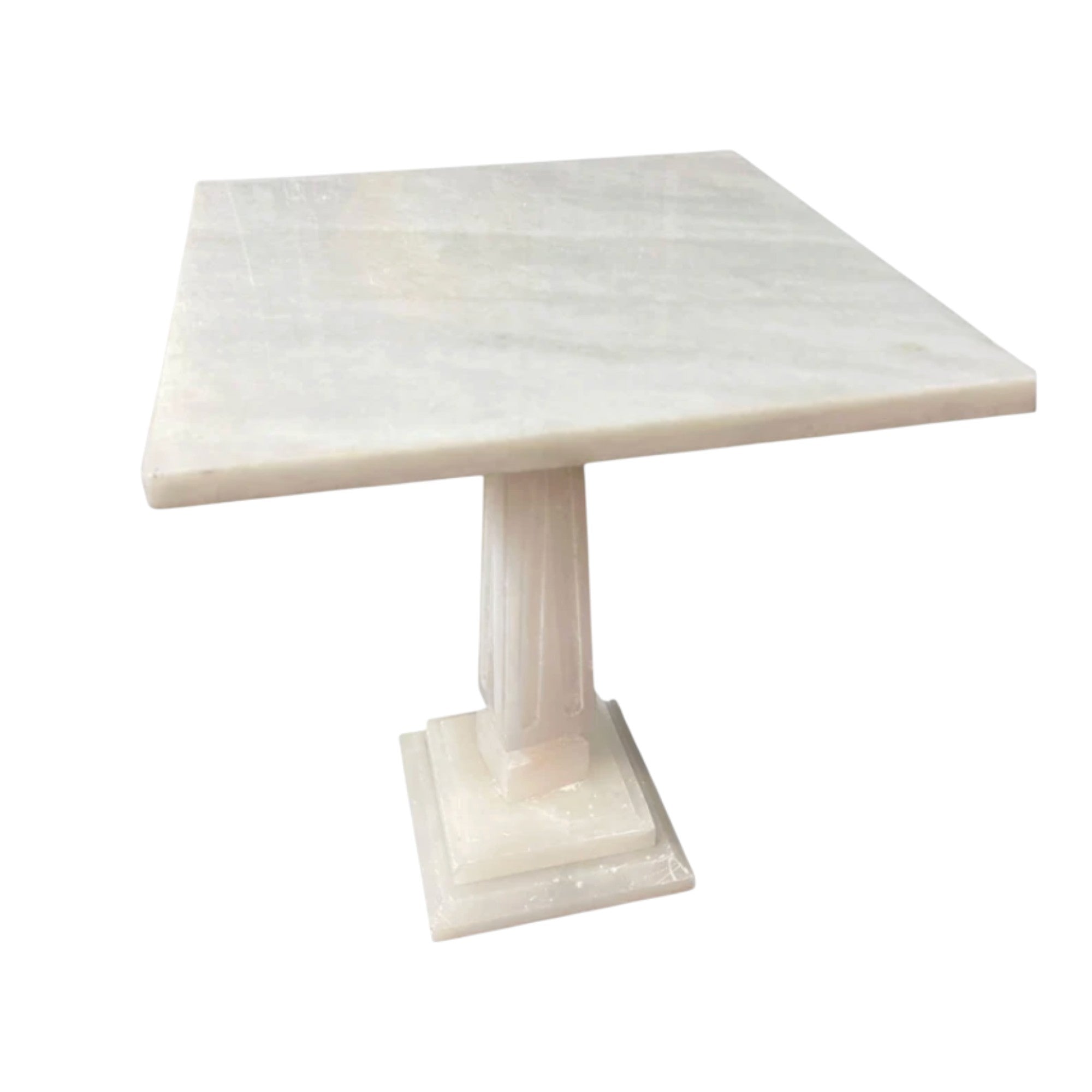 A striking vintage alabastor pedestal table featuring a square onyx top set on a fluted pedestal base with stepped plinth detailing. Finished with a decorative brass collar beneath the tabletop, this piece has a refined, sculptural presence and a timeless mid-century elegance.