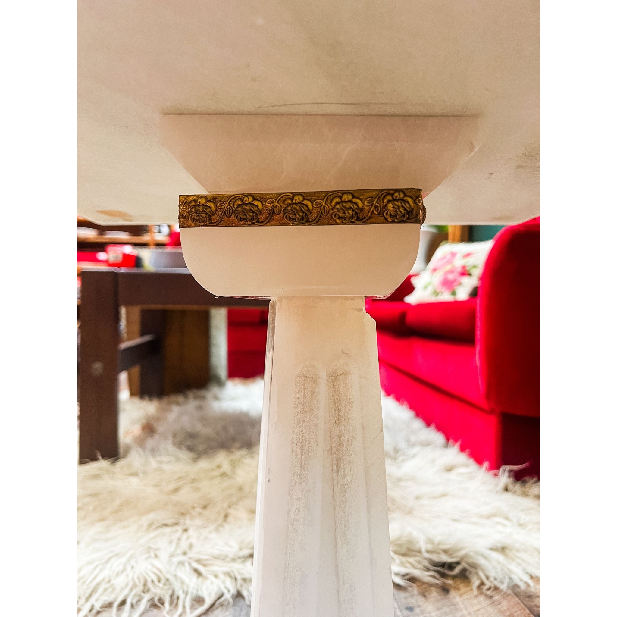 The alabastor has a soft milky translucence with subtle natural veining throughout, giving each surface beautiful depth and variation. Perfect as a side table, lamp table or statement accent piece, this table works effortlessly in mid-century, Hollywood Regency, eclectic or contemporary interiors.