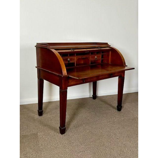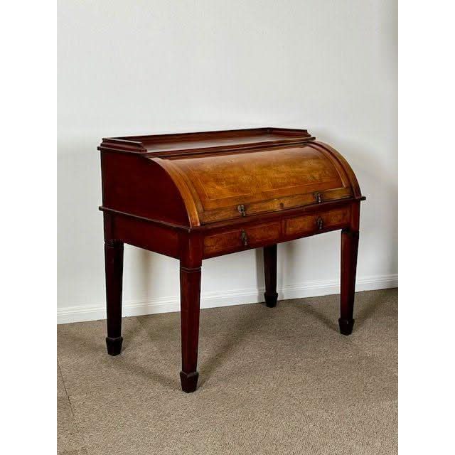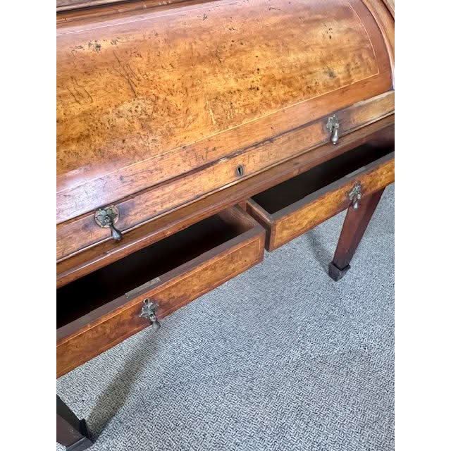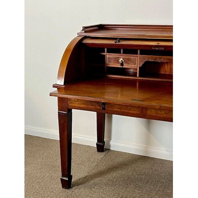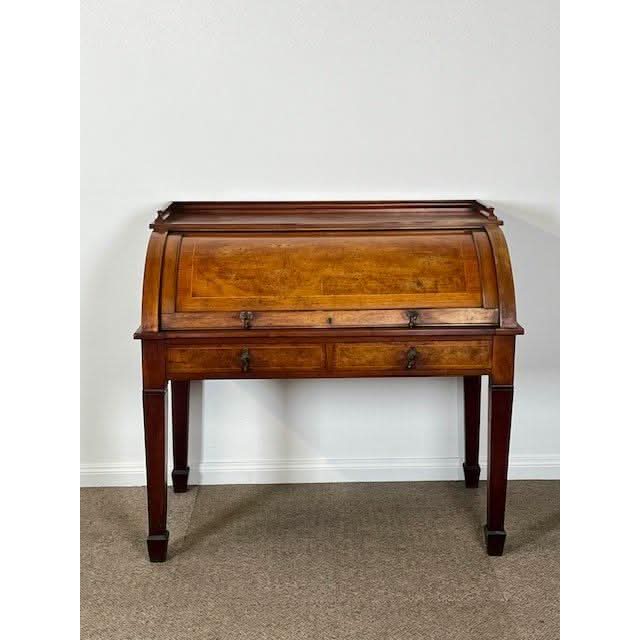 The frieze section has a pair of side by side Drawers finished with an outer banding and musk panels with line inlay so as to match the cylinder top. The cylinder and frieze drawers have matching all brass drop drawer pulls.