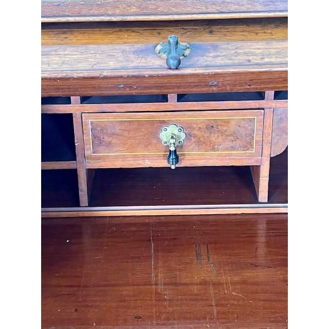 The desk features a three sided nicely profiled gallery, a pull out writing slide and a well fitted interior comprising of a pair of drawers and shelves. The drawers each have an outer banding line inlay and a musk panel plus turned turned timber and brass drop handles.