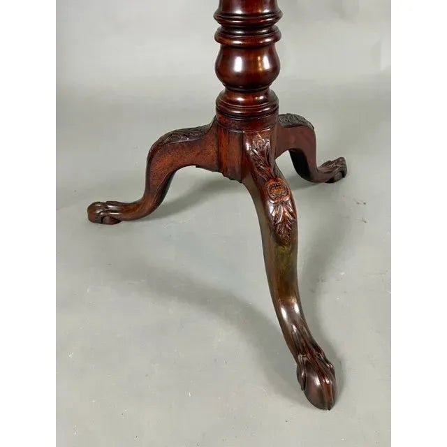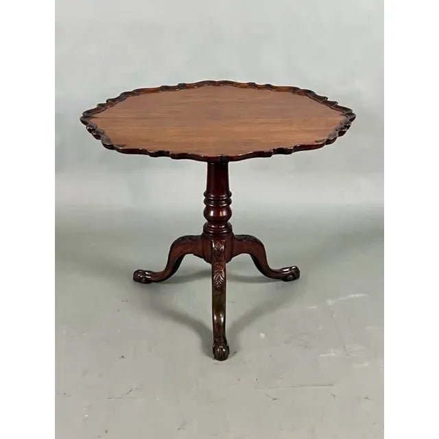 This is a very desirable and rather rare, excellent quality example of a genuine, antique English, 18th Century, Georgian tilt top Wine Table / Centre Table / Tea Table / Occasional Table. The top is desirably made from a wide, single solid piece of well figured and mellow coloured imported and prestigious Central American Mahogany and was totally handmade by experienced craftsmen circa 1775. The wide very desirable one piece top is not only scalloped but also has a raised pie crust edge molding which is part of the top and not later applied..The well turned central column finishes with a short upright cylindrical base which has a tri formation of shaped (cabriole) legs with decorative proud standing foliate carved knee embellishments and terminate in very nicely carved slender ball and claw feet.