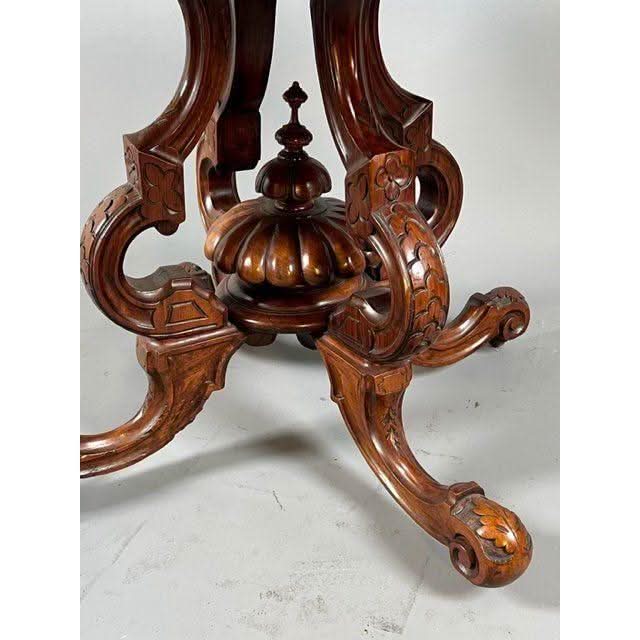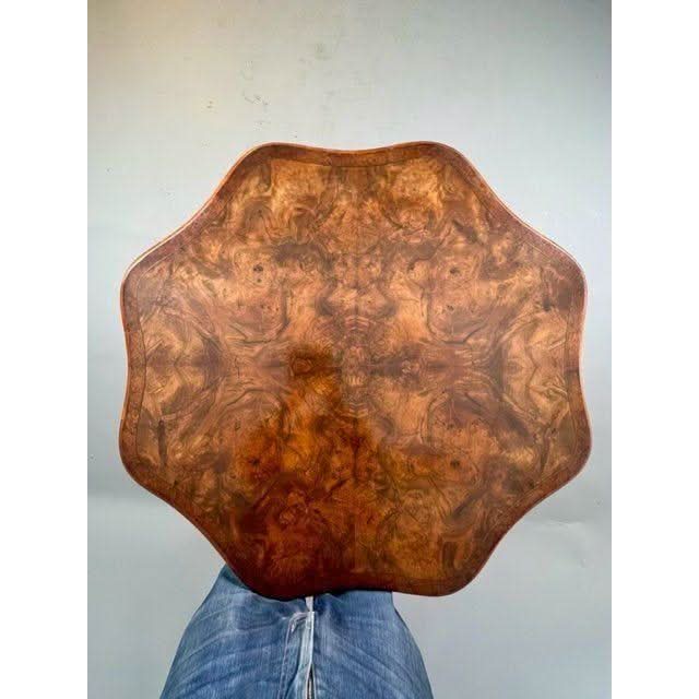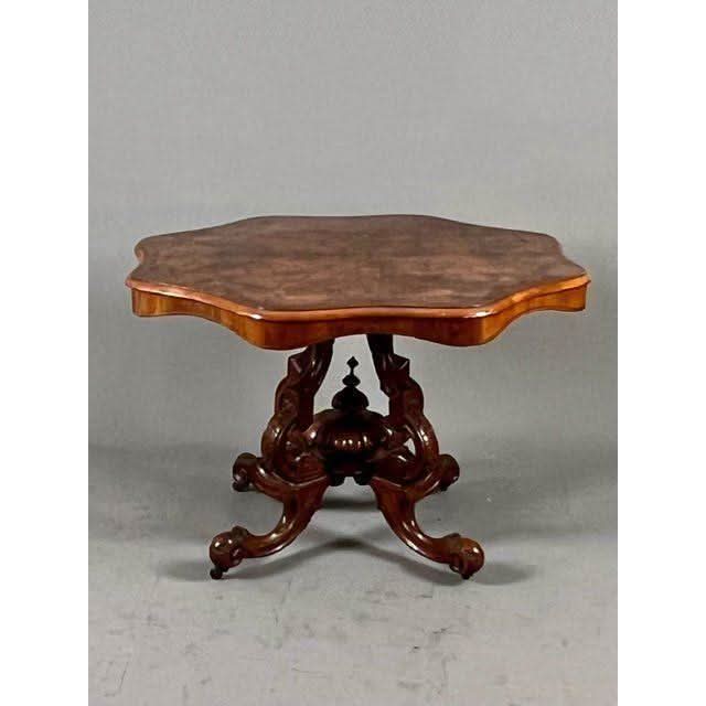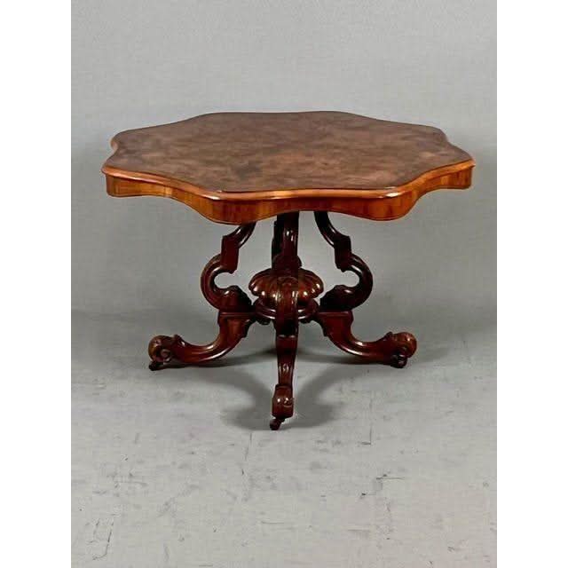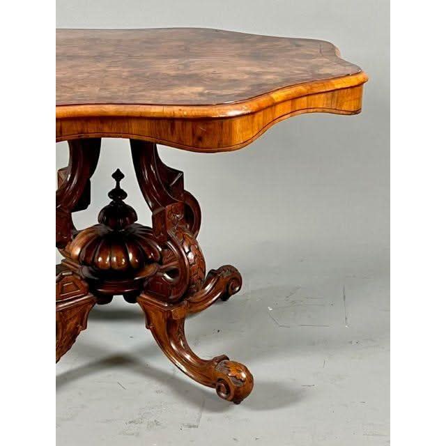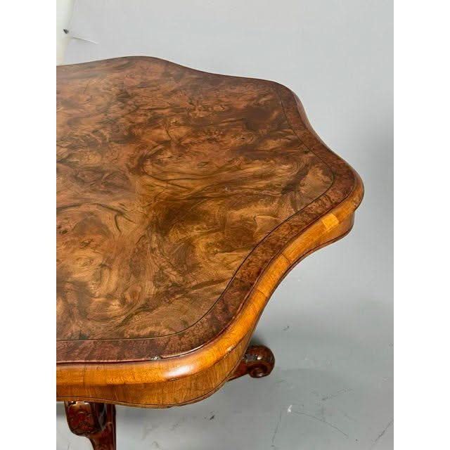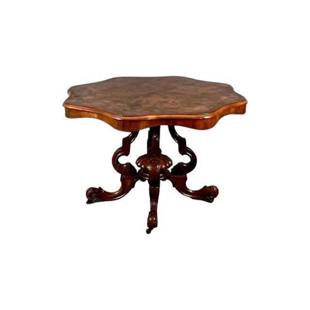 The easiest shape to make is a square or rectangle due to the straight lines. A circle is a little more difficult and then an oval shape. With this table construction becomes more complex due to its serpentine shape with its eight lobes. The apron of course has to follow in form and it is also variable in profile. and undulates. The solid Walnut support columns are also complex being four in number and all identically shaped and carved embellished. They sit on lower cabriole legs with foliate carved scrolled feet which have their original brass and brown castor assemblies. The top is finished in superb book leaf matched beautifully figured and lovely ’honey’ colured decorative Walnut.