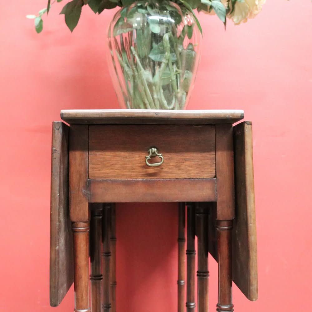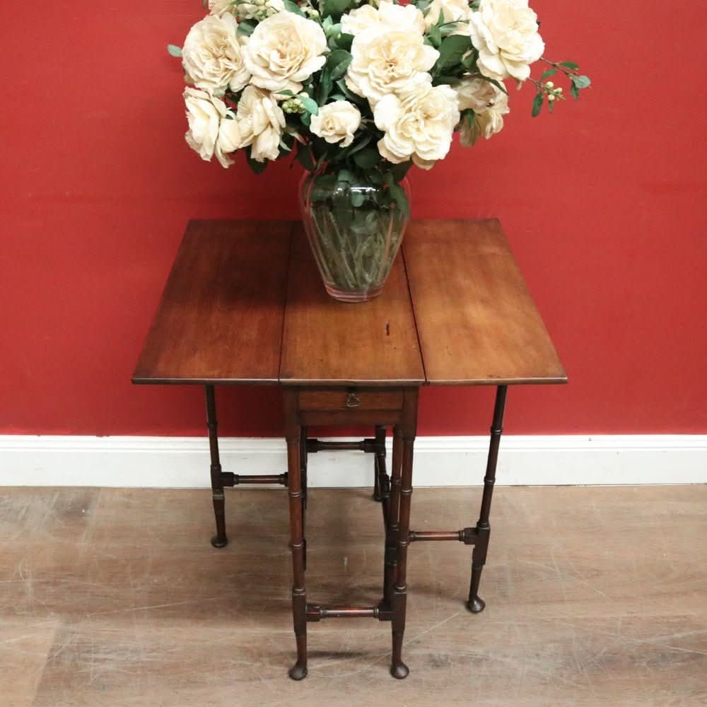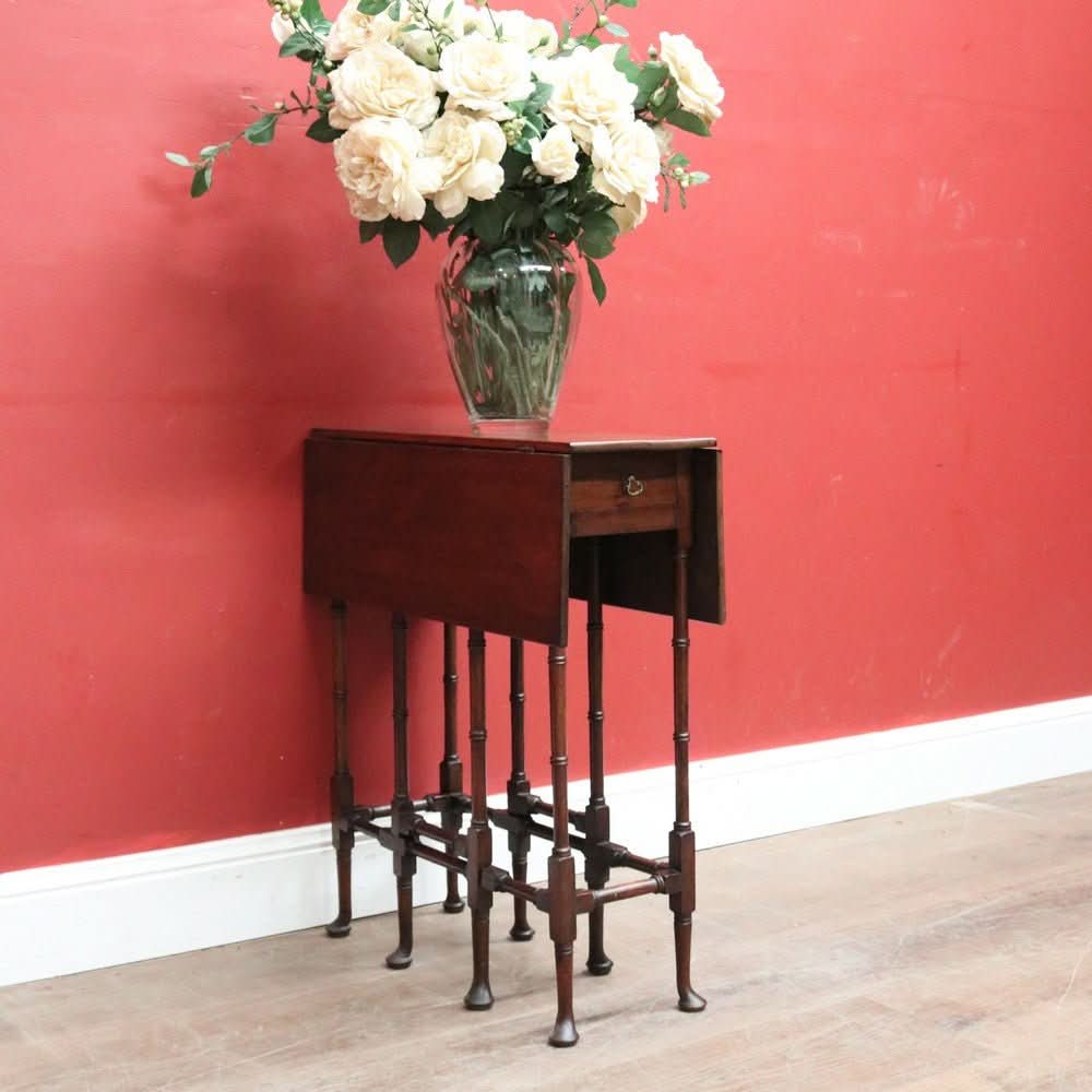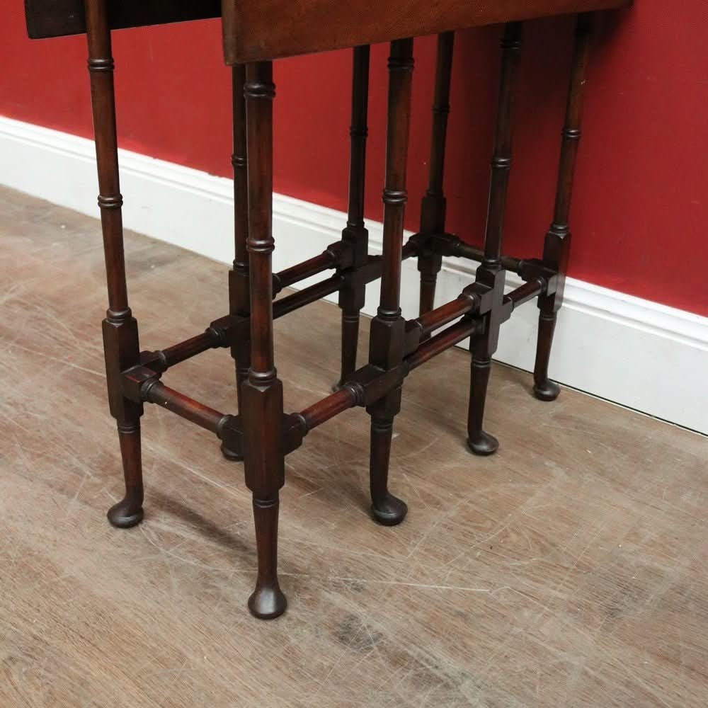 Description: A charming antique English mahogany gate-leg table featuring eight finely turned legs with a bamboo-inspired design. The two drop sides fold neatly for compact storage or extend to create a versatile surface, making it perfect as a side table, occasional table, or wine table.