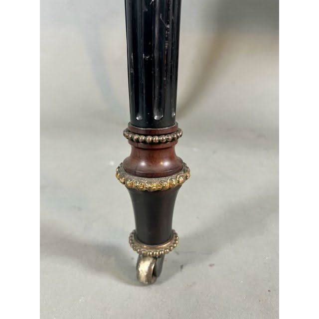 The turned and tapered fluted legs are Ebonised and have intermittant complimentary walnut sections, terminate in all brass castor assemblies and are embellished with both upper and lower ‘rings of beads’ also referred to as ‘string of pearls'.