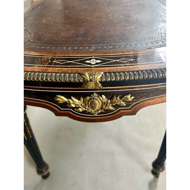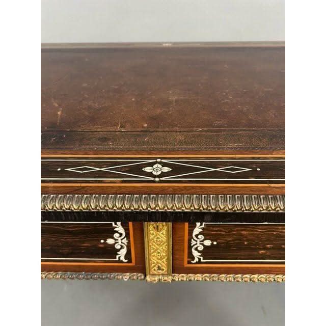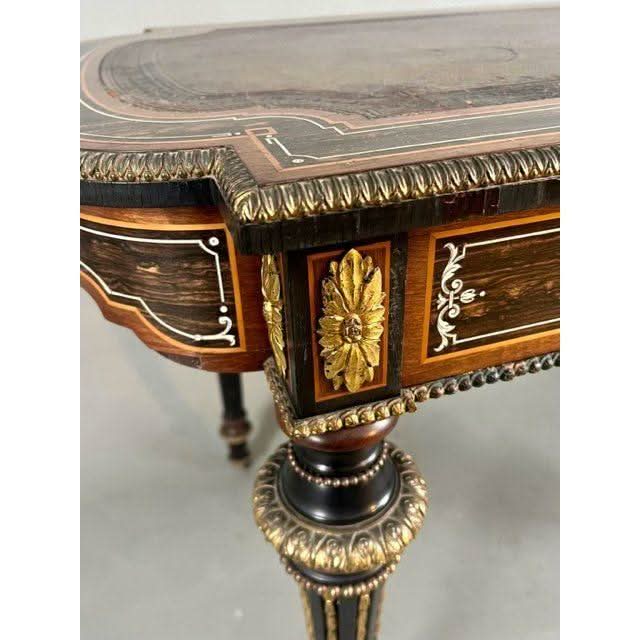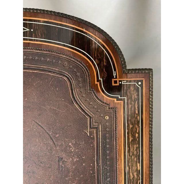 Condition: Over all excellent for age and use. the veneers and inlays are perfect however some of the gilding has been worn through use of almost a century and a half however as a service we can organise to have the worn pieces re gilded which would reintroduce the original ‘bling’ factor. The leather is original and very good however not perfect. If one preferred to change the leather to a colour of ones preference with decorative real gold tooling we can provide that service at a trade price.