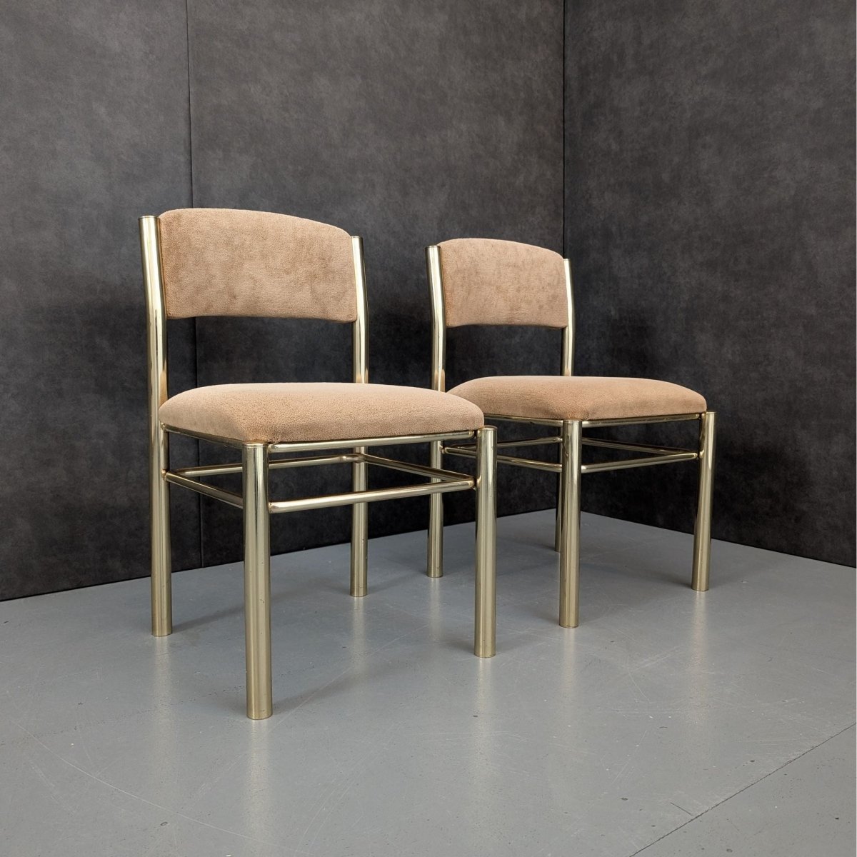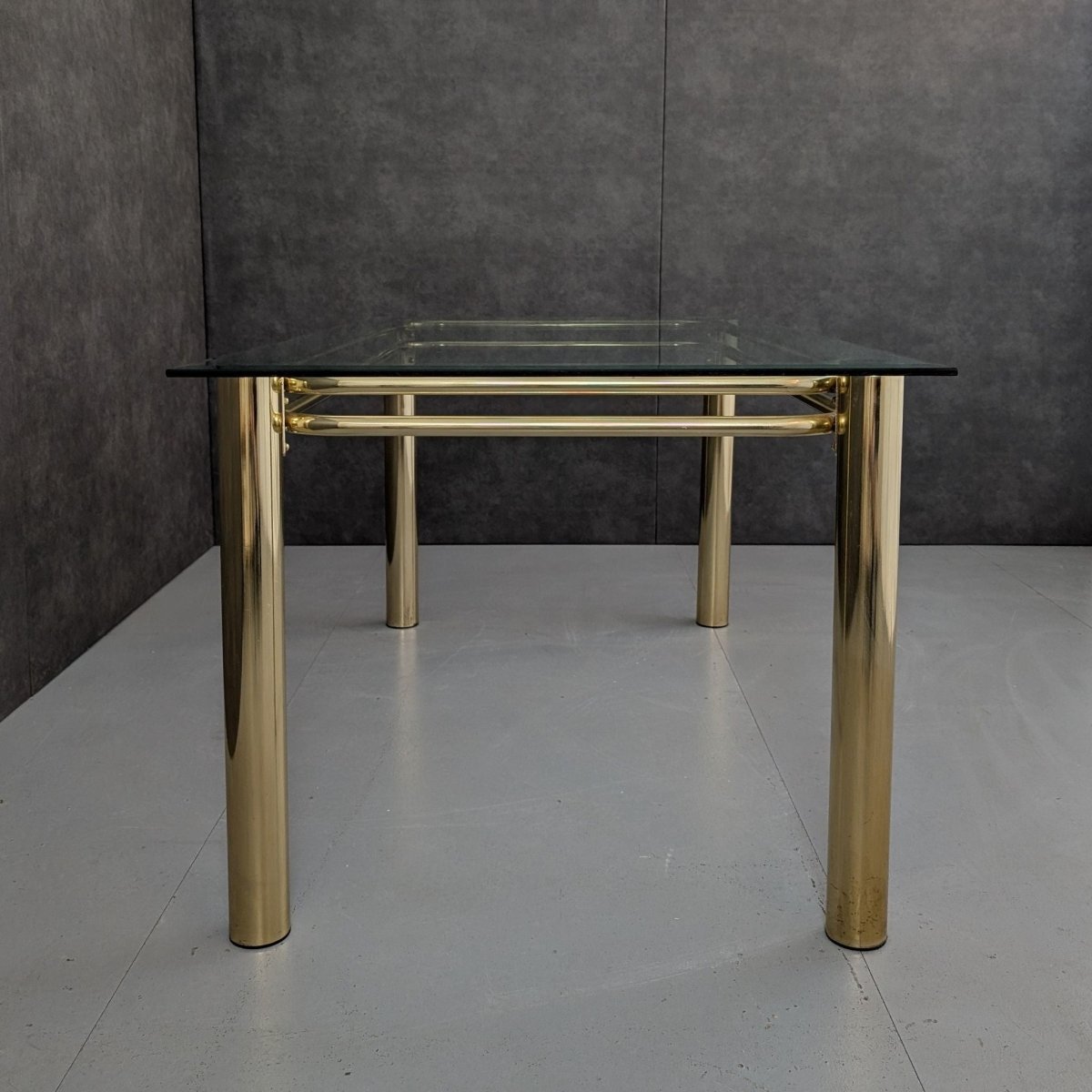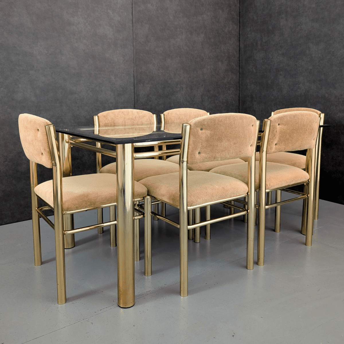 High gloss gold chrome and glass bring unapologetic shine and presence, the kind that announces itself the moment it enters a room. Produced in Australia in the 1990s by Metalart Company Pty Ltd, this dining suite leans hard into late modern glamour, when polished metal, glass and reflection were used deliberately to project confidence and status. The bevelled glass tabletop sits on bold cylindrical gold chrome legs with a matching perimeter frame, paired with six upholstered chairs that mirror the same structural language in softened form. Luxurious, assertive and intentionally eye catching, the set delivers a strong visual statement suited to interiors that embrace drama, polish and material impact rather than restraint.