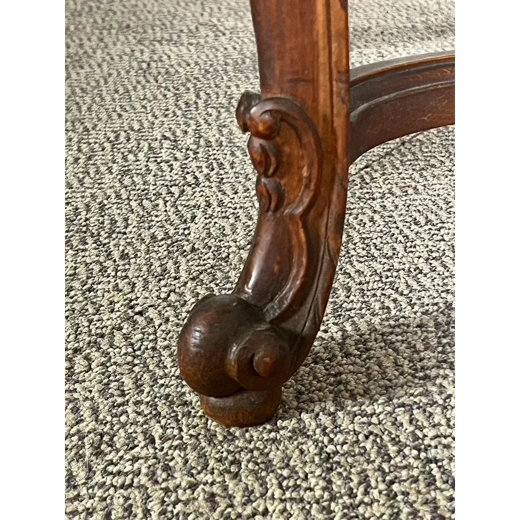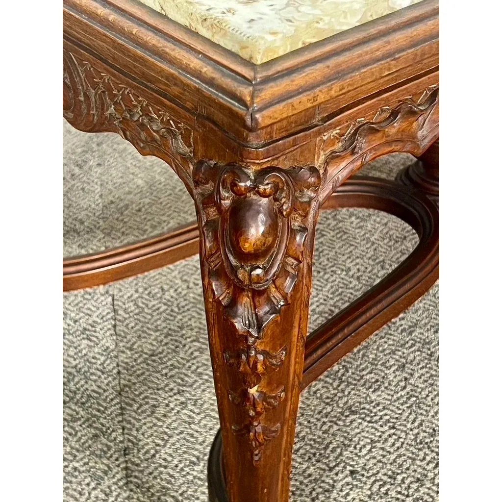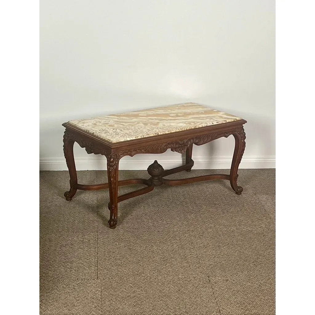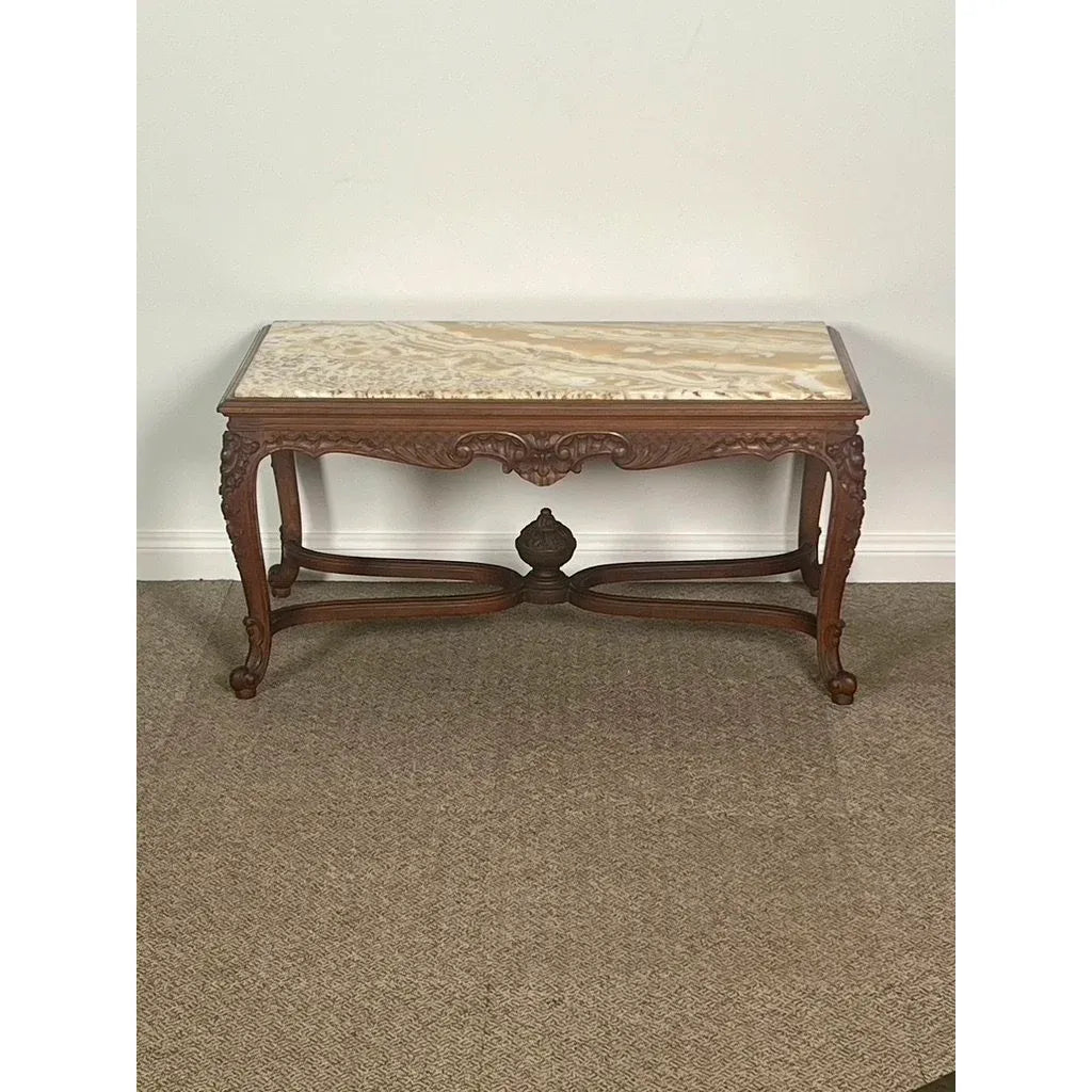 The top has an inset marble slab set into a nicely profiled timber frame. The apron or frieze section is profusely carved embellished in the typical Rococo manner. the bottom edge of the apron is shaped and flows into corner positioned cabriole legs with foliate carved knees and scrolled feet. The legs are connected by two lower ‘U’ shaped stretchers which meet at a carved central finial.
