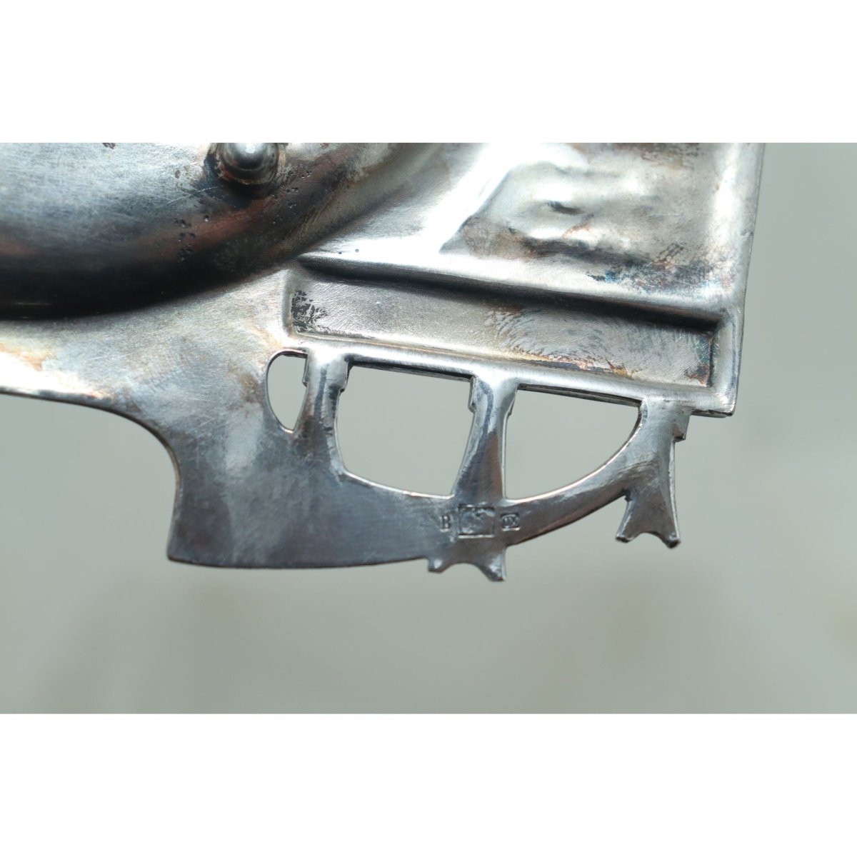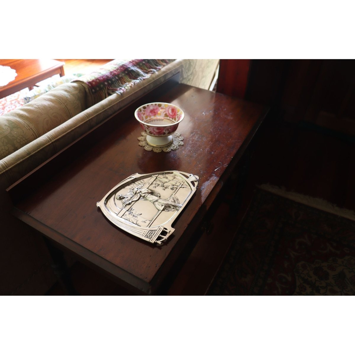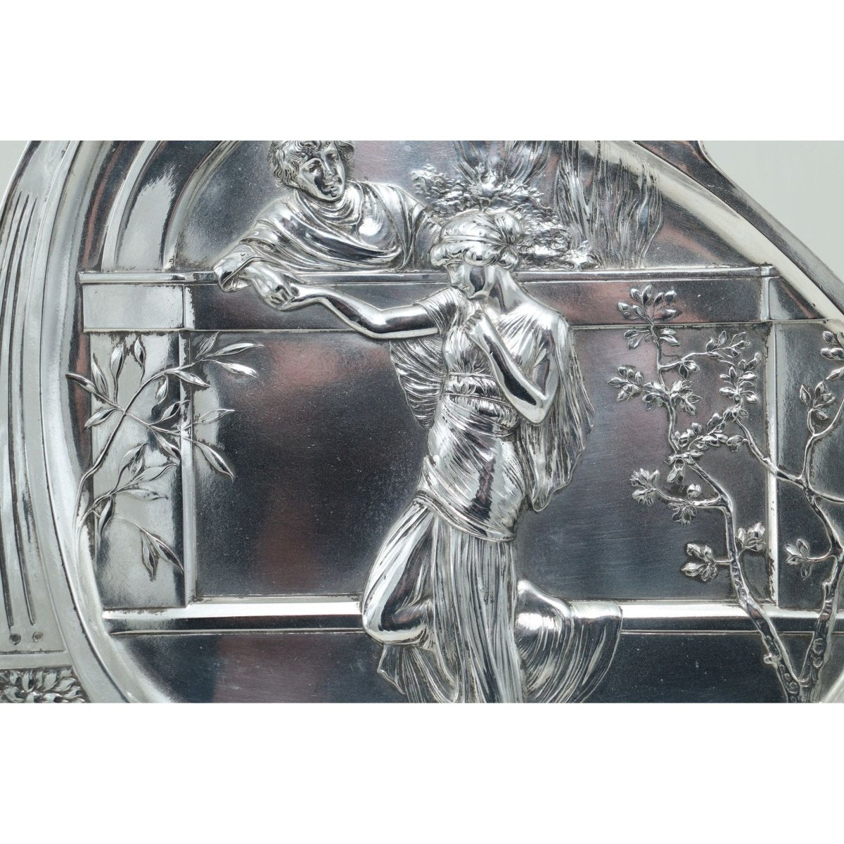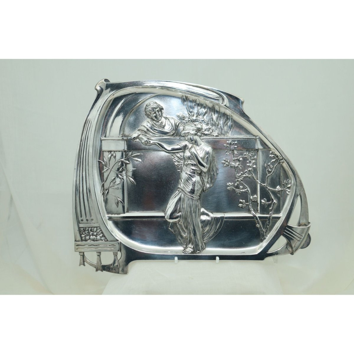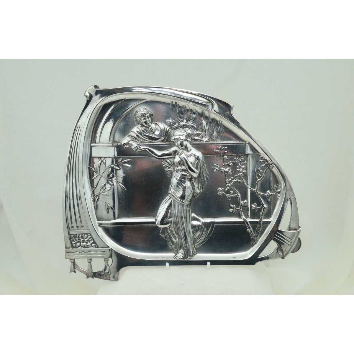 This WMF silver plated visiting card tray measures 290 mm (11.5 inches) by 240 mm (9.5 inches). It is decorated in the Art Nouveau style, with a scene of lovers conversing over a wall and was designed with a dual purpose in mind. It could stand on a hall table to be used as a card tray for receiving visiting cards, or it could hang on a wall using the hook on the back. It is in excellent condition and has been replated. The WMF model number is 280, and this model is shown on page 168 of the 1906 WMF catalogue.