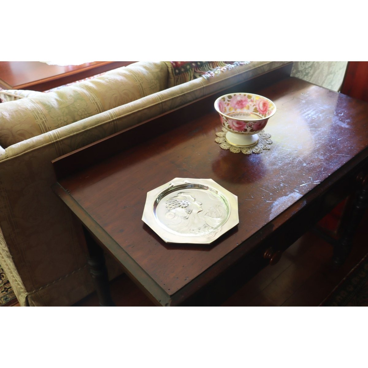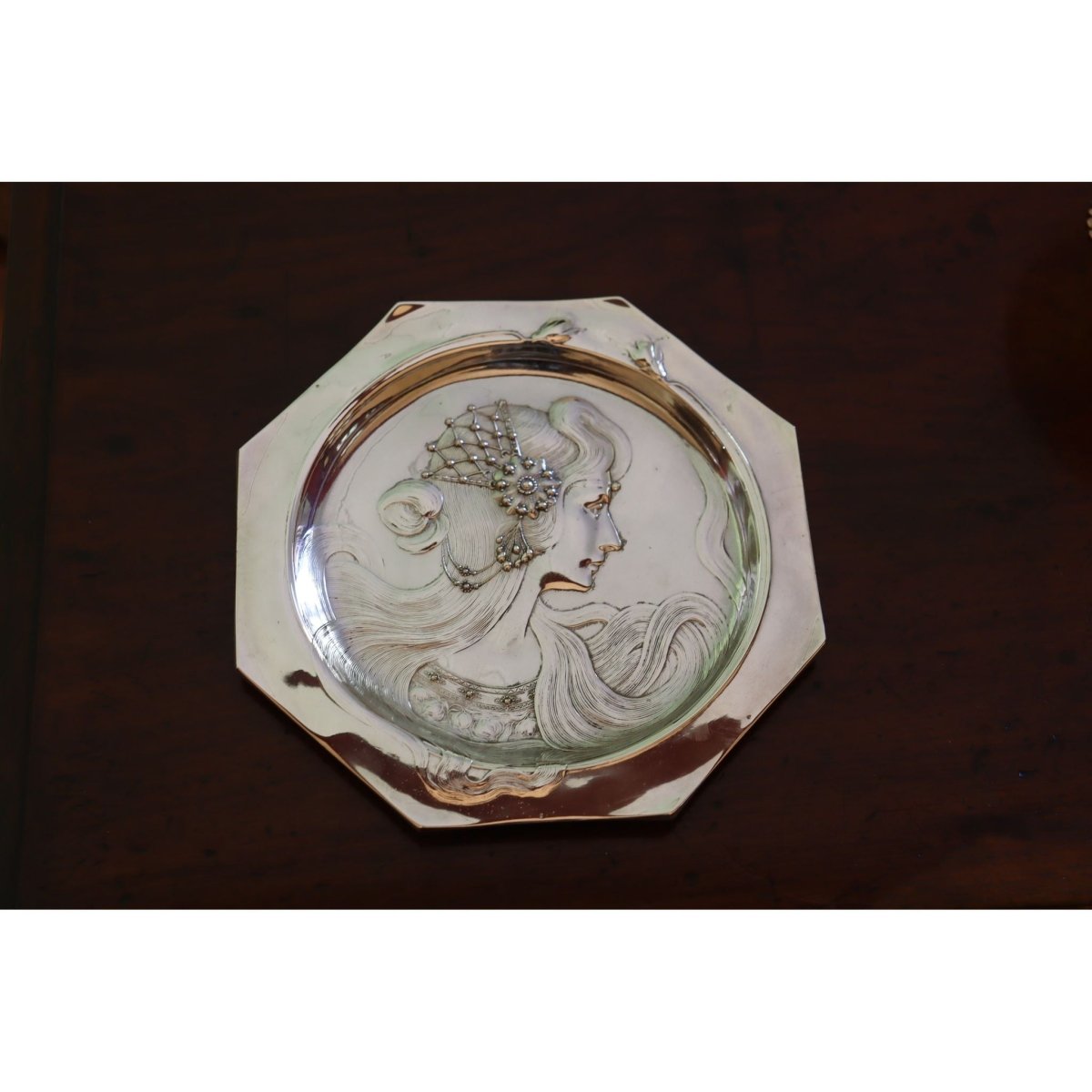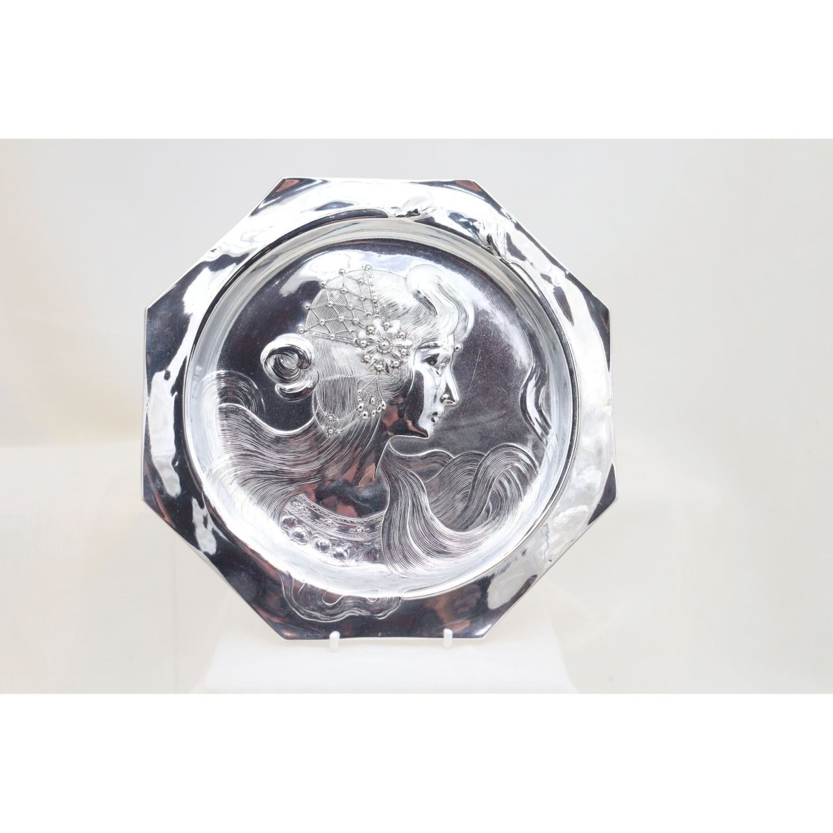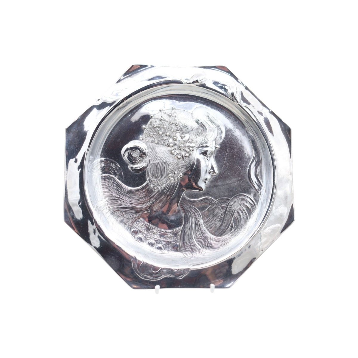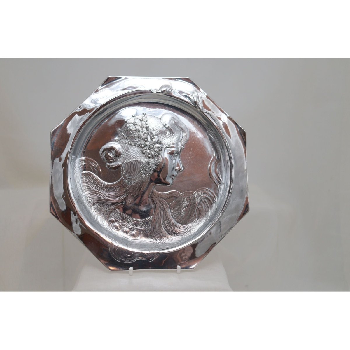 This unmarked octagonal WMF visiting card tray is shown in the WMF English catalogue for 1906 as model 190a. It is shown on page 169 of the reprint issued by the Antique Collectors Club in 2008 and its original price was 10 shillings. Its decorative features are quintessentially Art Nouveau (known as Jugendstil in Germany) with stylised flowers and a young woman with long flowing hair. On her head she wears a detailed and intricate head piece, and her bodice is equally detailed. The tray would have sat on a table in the hallway, near the front door. When visitors called, their visiting (also called calling) cards could be left on the tray, for when the occupants returned, or if they were home, then the tray would be carried to them by a servant. It measures 216 mm (8.5 inches) across and stands 13 mm (.5 of an inch) high. It was resilvered several years ago, and is in very good condition. C1906.