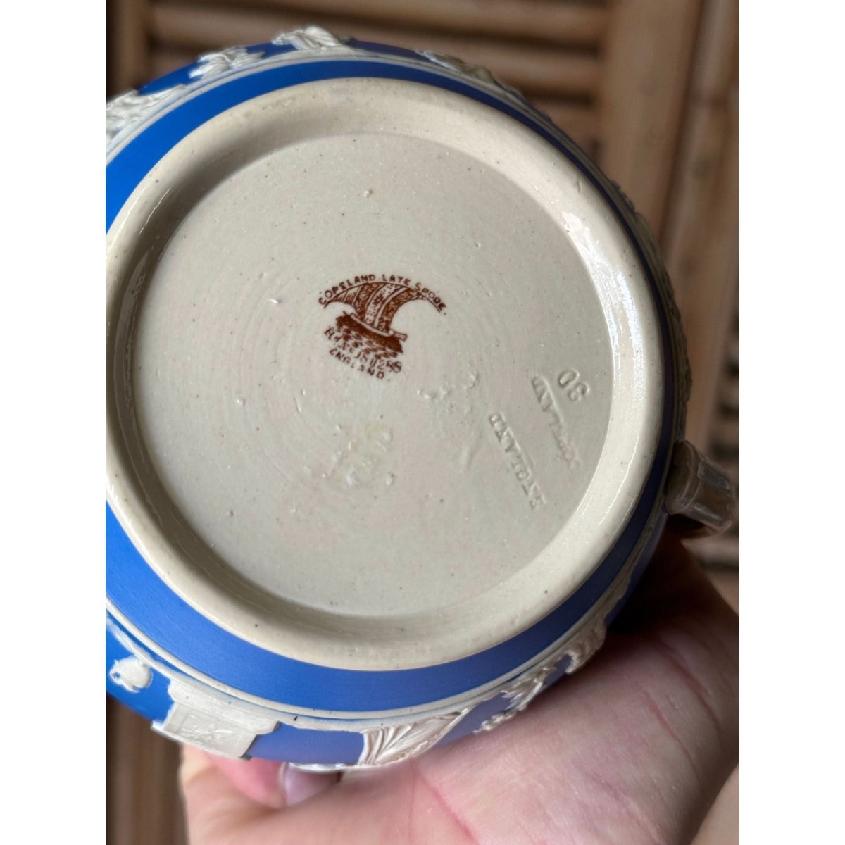 A classic three-piece Copeland Jasperware tea set in the iconic cobalt blue with applied white reliefs. Each piece is hallmarked “England Copeland”, a mark used from the late 19th century through the early 20th century, denoting the maker’s renowned quality and craftsmanship. The set includes a teapot, sugar bowl, and cream jug, all decorated with crisp neoclassical scenes and laurel borders. Price is for the set.
